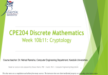CPE204 Discrete Mathematics Week 10&11: Cryptology Course teacher: Dr. Nehad Ramaha, Computer Engineering Department, Karabük Universities Based on Lecture note prepared by Ozacar Kasim, PhD | Assist. Prof. | Computer Engineering Department 1 The class notes are a compilation and edition from many sources. The instructor does not claim intellectual property or ownership of the lecture notes. In World War II, the Nazi military employed an encryption scheme that addressed the weakness of substitution ciphers. The scheme, implemented by typewriter sized devices, Enigma machines, gave the Nazis a tactical advantage that greatly contributed to their early success in the war. Cryptology • Cryptography • Science of creating codes or ciphers • Cryptanalysis • Science of breaking codes and ciphers 3 Codes vs. Ciphers • Code • Substitution of words or phrases by others • Example: Navajo “code talkers” of WW II: • turtle means tank • sea turtle means landing craft • Cipher • Algorithmic scrambling/unscrambling • Example: Caesar cipher • Replace each letter with the letter 3 positions after it in the alphabet (a d, b e, etc.) 4 Terminology • Plaintext • The unencrypted (readable) message • Ciphertext • The encrypted version of the message • Secure channel • A communications path safe from eavesdropping • Insecure channel • A communications path that may be tapped 5 Stream & Block Ciphers • Stream cipher acts on one character at a time • Replaces each character with a different symbol • Fixed: Each plaintext ‘a’ is always replace by the same ciphertext symbol • Example: Caesar cipher (‘a’ always replaced by ‘d’) • Variable: Different occurrences of ‘a’ in the plaintext are replaced with different symbols in the ciphertext • Example: German Enigma cipher machine of WWII 6 Simple Ciphers • Message reversal • Geometric patterns • Route • Columnar transposition • Polyalphabetic transposition • Code Word(Keyword) Transposition 7 Route Cipher As an example, lets encrypt the plaintext "abort the mission, you have been spotted". First we need to decide on the number of columns we are going to use, lets say 5. We then choose which route we want to use to encrypt the message. The plaintext written in a grid with 5 columns. •With a route of reading down the columns we get the ciphertext: "ATSYV NTBHS OESEO EIUBP DRMOH EOXTI NAETX". •With a route of spiralling inwards counter-clockwise from the bottom right we get: "XTEAN ITROB ATSYV NTEDX OEHOM EHSOE SPBUI". 8 Caesar Shift Cipher This particular cipher is not very difficult to decipher and hence secret messages do not remain secret for long. 9 Book Cipher • Locations in the book are used to replace the plain text of the message 10 Transposition Cipher 11 Example from previous exam: In the following encryption process, Turkish alphabet was used. ABCÇDEFGĞHIİJKLMNO ÖPRSŞTUÜVYZ plaintext ciphertext TÜRKİYE UYTONDJ ??? CCBUEP Find the plain text corresponding to the CCBUEP encrypted text. Answer. 12 Jefferson’s Cipher Machine • A stack of code wheels threaded on a central axis • Could be any length, but typically ~30 • Each had all letters of the alphabet, but no two were identical • To encrypt a message • • • • Divide message into blocks = stack size Turn wheels so plaintext shows on one row Lock the wheels Transmit any other row 13 Jefferson’s Cipher Machine • To decrypt a message • Set wheels to match the ciphertext for each block • Lock the wheels • Look for the one row that contains readable plaintext • Jefferson’s machine was used, successfully, for almost a century 14 Enigma & Ultra • Used by Germany during WW II • Considered it “unbreakable” • Broken in 1940 by Britain (“Ultra”) • Team at Bletchley Park, headed by Alan M. Turing 15 How Enigma Worked • Operator typed plaintext message • 3 rotors scrambled each letter • Ciphertext character lit up on upper panel • Rotors turned after every letter 16 How Enigma Worked 1. Notched ring, used to "carry" the rotation of one rotor to another via a ratchet mechanism 2. Dot marking the position of the "A" contact, for use by the operator in assembling the rotor 3. Alphabet "tyre" or ring; some rings had a sequence of numerals instead of letters 4. Electrical plate contacts 5. Wire connections joining the plate contacts to the pin contacts 6. Spring-loaded pin contacts 7. Spring-loaded ring adjusting lever, used to alter the position of the alphabet ring; a pin on the lever fits into holes in the side of the alphabet ring 8. Hub, through which fits the central axle 9. Finger wheel, used to manually set the orientation of the rotor 10. Ratchet mechanism AJ 115 17 How Enigma Worked The scrambling action of Enigma's rotors is shown for two consecutive letters with the right-hand rotor moving one position between them. AJ 115 18 How Enigma was Solved • Lots of similar messages • Germans sent weather information to U-boats every day, all in same format • Human error • Lazy or tired operators re-used rotor settings instead of changing them • Repeated first 3 characters of message • “Guten morgen”, “Hi Hitler!” • Weakness of algorithm • Would never translate a letter to itself 19 How Enigma was Solved • The “Bombe” • Computer at Bletchley Park • Searched thousands of possible Enigma settings, looking for one that yielded plaintext • Captured code booksreadable • Naval vessels carried books of Enigma settings • British captured U-559 in Sept. 1942 • By 1943, Britain could read intercepted Enigma messages before the Germans could! 20 Cryptographic Algorithms • Often grouped into two broad categories, symmetric and asymmetric; today’s popular cryptosystems use hybrid combination of symmetric and asymmetric algorithms • Symmetric and asymmetric algorithms distinguished by types of keys used for encryption and decryption operati