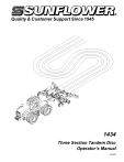 Quality & Customer Support Since 1945 1434 Three Section Tandem Disc Operator’s Manual 997639 Original Issue Date of Manual June 10, 2005 Any changes after this date will have the revision date printed on the bottom of the pages. Table of Contents Safety Section. . . . . . . . . . . . . . . . . . . . . . . . . . . . . . . . . . . . . . . . . . . . . . . . . . . 7 Safety-Alert Symbols. . . . . . . . . . . . . . . . . . . . . . . . . . . . . . . . . . . . . . . . . . . . . . . . . . . . . . . . . 7 Informational Messages . . . . . . . . . . . . . . . . . . . . . . . . . . . . . . . . . . . . . . . . . . . . . . . . . . . . . . 7 Safety Rules . . . . . . . . . . . . . . . . . . . . . . . . . . . . . . . . . . . . . . . . . . . . . . . . . . . . . . . . . . . . . . . 8 Prior To Operation . . . . . . . . . . . . . . . . . . . . . . . . . . . . . . . . . . . . . . . . . . . . . . . . . . . . . . . . . . . 8 During Operation . . . . . . . . . . . . . . . . . . . . . . . . . . . . . . . . . . . . . . . . . . . . . . . . . . . . . . . . . . . . 8 While Transporting . . . . . . . . . . . . . . . . . . . . . . . . . . . . . . . . . . . . . . . . . . . . . . . . . . . . . . . . . . 9 Maintenance Safety. . . . . . . . . . . . . . . . . . . . . . . . . . . . . . . . . . . . . . . . . . . . . . . . . . . . . . . . . . 9 Tire Service Safety . . . . . . . . . . . . . . . . . . . . . . . . . . . . . . . . . . . . . . . . . . . . . . . . . . . . . . . . . . 9 Be Prepared For Accidents . . . . . . . . . . . . . . . . . . . . . . . . . . . . . . . . . . . . . . . . . . . . . . . . . . . . 9 Safety Signs . . . . . . . . . . . . . . . . . . . . . . . . . . . . . . . . . . . . . . . . . . . . . . . . . . . . . . . . . . . . . . 10 Introduction . . . . . . . . . . . . . . . . . . . . . . . . . . . . . . . . . . . . . . . . . . . . . . . . . . . 15 Using This Manual. . . . . . . . . . . . . . . . . . . . . . . . . . . . . . . . . . . . . . . . . . . . . . . . . . . . . . . . . . 15 Terminology: . . . . . . . . . . . . . . . . . . . . . . . . . . . . . . . . . . . . . . . . . . . . . . . . . . . . . . . . . . . . . . 15 Owner Assistance . . . . . . . . . . . . . . . . . . . . . . . . . . . . . . . . . . . . . . . . . . . . . . . . . . . . . . . . . . 15 Serial Number Plate . . . . . . . . . . . . . . . . . . . . . . . . . . . . . . . . . . . . . . . . . . . . . . . . . . . . . . . . 15 Record of Maintenance Performed . . . . . . . . . . . . . . . . . . . . . . . . . . . . . . . . . . . . . . . . . . . . .17 Assembly Section . . . . . . . . . . . . . . . . . . . . . . . . . . . . . . . . . . . . . . . . . . . . . . 19 Before Beginning Assembly . . . . . . . . . . . . . . . . . . . . . . . . . . . . . . . . . . . . . . . . . . . . . . . . . . 19 Assembling Three Section Disc . . . . . . . . . . . . . . . . . . . . . . . . . . . . . . . . . . . . . . . . . . . . . . . 19 21’, 23’, 26’ & 29’ Center Frame . . . . . . . . . . . . . . . . . . . . . . . . . . . . . . . . . . . . . . . . . . . . . . . 19 30’, 33’ & 36’ Center Frame Assembly . . . . . . . . . . . . . . . . . . . . . . . . . . . . . . . . . . . . . . . . . . 19 Items to Assemble on Center Frames. . . . . . . . . . . . . . . . . . . . . . . . . . . . . . . . . . . . . . . . . . . 19 21’ - 29’ Center Lift Assembly . . . . . . . . . . . . . . . . . . . . . . . . . . . . . . . . . . . . . . . . . . . . . . . . . 20 30’ - 36’ Center Lift Assembly . . . . . . . . . . . . . . . . . . . . . . . . . . . . . . . . . . . . . . . . . . . . . . . . . 20 Spindle & Wheel Assembly . . . . . . . . . . . . . . . . . . . . . . . . . . . . . . . . . . . . . . . . . . . . . . . . . . . 21 Connecting The Center Lifts Together . . . . . . . . . . . . . . . . . . . . . . . . . . . . . . . . . . . . . . . . . . 21 Stroke Control Assembly . . . . . . . . . . . . . . . . . . . . . . . . . . . . . . . . . . . . . . . . . . . . . . . . . . . . . 22 Stroke Control Actuator Level Assembly . . . . . . . . . . . . . . . . . . . . . . . . . . . . . . . . . . . . . . . . . 23 Standard Self Leveler Front-Half Assembly . . . . . . . . . . . . . . . . . . . . . . . . . . . . . . . . . . . . . . 23 Optional Hydraulic Self Leveler Assembly . . . . . . . . . . . . . . . . . . . . . . . . . . . . . . . . . . . . . . . 24 Mounting the Optional Hydraulic Self Leveler . . . . . . . . . . . . . . . . . . . . . . . . . . . . . . . . . . . . . 24 Connecting the Leveler Systems to the Center Lift on the 21’-29’ . . . . . . . . . . . . . . . . . . . . . 25 Connecting the Leveler Systems to the Center Lift on the 30’-36’ . . . . . . . . . . . . . . . . . . . . . 25 Hydraulic Assembly on the Optional Hydraulic Leveler. . . . . . . . . . . . . . . . . . . . . . . . . . . . . . 26 Tongue Assembly . . . . . . . . . . . . . . . . . . . . . . . . . . . . . . . . . . . . . . . . . . . . . . . . . . . . . . . . . . 27 Mounting the Disc Gangs . . . . . . . . . . . . . . . . . . . . . . . . . . . . . . . . . . . . . . . . . . . . . . . . . . . . 28 Wing Frame Assembly . . . . . . . . . . . . . . . . . . . . . . . . . . . . . . . . . . . . . . . . . . . . . . . . . . . . . . 29 1434 Tandem Disc Operator’s Manual 997639 3 Table of Contents Wing Lift Assembly (21’-36’) . . . . . . . . . . . . . . . . . . . . . . . . . . . . . . . . . . . . . . . . . . . . . . . . . . . 30 Wing Fold Arm Assembly (26’-36’) . . . . . . . . . . . . . . . . . . . . . . . . . . . . . . . . . . . . . . . . . . . . . . 30 Mounting the Light Kit Arms . . . . . . . . . . . . . . . . . . . . . . . . . . . . . . . . . . . . . . . . . . . . . . . . . . . 31 Gauge Wheel Installation . . . . . . . . . . . . . . . . . . . . . . . . . . . . . . . . . . . . . . . . . . . . . . . . . . . . . 31 Wing Fold Braces . . . . . . . . . . . . . . . . . . . . . . . . . . . . . . . . . . . . . . . . . . . . . . . . . . . . . . . . . . . 32 Optional Rear Tow Hitch . . . . . . . . . . . . . . . . . . . . . . . . . . . . . . . 
