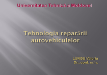Universitatea Tehnică a Moldovei LUNGU Valeriu Dr., conf. univ. Noţiuni generale Scopul disciplinei: Formarea unui ansamblu integrat de cunoștințe cu privire la organizarea sistemului de reparații a autovehiculelor Noţiuni generale Bibliografia: LISNIC, A. Reparația automobilelor. Curs universitar. Chișinău. UTM.2006. Noţiuni generale Bibliografia: LISNIC, A. Recondiționarea pieselor auto. Curs universitar. Chișinău. UTM.2007, p. I, 2008, p. II. Noţiuni generale Bibliografia: LUNGU V., CEBAN V. Tehnologia Reparării autovehiculelor. Îndrumar de laborator. Chișinău. UTM. 2020. Istoria dezvoltării Istoria dezvoltării Leonardo da Vinci(1542-1519) Istoria dezvoltării 1769 Nicolas Joseph Cugnot (1725-1804) Istoria dezvoltării 2015 – 1,2 mlrd. 2035 – 2,0 mlrd. Schimbarea stării tehnice a mașinilor Un automobil modern este format din 15-18 mii de piese, dintre care 7-9 mii își pierd proprietățile originale în timpul funcționării, iar aproximativ 3-4 mii au o durată de viață mai scurtă decât o mașină. Dintre acestea, 80-100 piese afectează siguranța traficului, 200-400 de părți sunt „critice” în fiabilitate, mai des decât altele necesită înlocuire. În timpul funcționării, automobilul interacționează cu mediul înconjurător, iar elementele sale interacționează între ele. Aceasta provoacă încărcarea pieselor, deplasările lor reciproce, frecare, încălzire, schimbarea procesului de lucru a cantităților fizice și a parametrilor constructivi (structurali): dimensiuni, goluri etc. Schimbarea stării tehnice a mașinilor Schimbarea stării tehnice a mașinilor Schimbarea stării tehnice a mașinilor Schimbarea stării tehnice a mașinilor Schimbarea stării tehnice a mașinilor Schimbarea stării tehnice a mașinilor O schimbare a stării tehnice a vehiculului are loc sub influența cauzelor care acționează constant, de funcționarea proprie a mecanismelor, de cauze aleatorii, precum și de condițiile externe în care vehiculul funcționează și este depozitat. Principalele motive (permanente): uzură, deformări plastice, fracturi de oboseală, coroziune, modificări fizico-chimice și de temperatură în materiale și piese. Uzura este procesul de modificare progresivă a dimensiunii unei părți în timpul frecării, datorită deformării sau a separării materialului de suprafața de frecare. Cauzele aleatorii sunt defecte latente, supraîncărcări structurale care depășesc limitele admise. Schimbarea stării tehnice a mașinilor Factorii care afectează funcționarea automobilului: Constructivi: ➢ Proiectare; ➢ Materiale; ➢ Tehnologia de fabricație. De exploatare: ➢ Condiții rutiere; ➢ Condiții de trafic; ➢ Condiții de transport; ➢ Condiții climatice; ➢ Condiții de sezon; ➢ Condiții de deservire. Schimbarea stării tehnice a mașinilor Starea tehnică a vehiculului este definit printr-un set de parametri constructivi. Posibilitatea de a măsura direct parametrii structurali fără o demontare parțială sau completă a agregatelor este limitată. În acest caz, sunt utilizate valori indirecte sau așa-numiții parametri de diagnostic, care sunt asociați cu constructivul și care oferă unele informații despre acestea (de exemplu, puterea, consum de ulei, compresie etc). Se disting: - parametrii proceselor de lucru de ieșire care determină proprietățile - funcționale de bază ale mașinii (putere, spațiul de frânare); parametrii proceselor de însoțire (încălzire, vibrații, conținutul produselor de uzură în ulei); parametrii geometrici (structurali) care determină relația dintre piesele din agregate (mecanism) și între agregate și mecanismele separate (luft, cursă, tip de montaj etc.). Indicatori de fiabilitate Fiabilitatea este o proprietate complexă ce caracterizează calitatea oricărui produs tehnic. Sensul fizic al fiabilității constă în capacitatea mașinii de a-și menține caracteristicile tehnice inițiale în timp. GOST 27.002-2015 Fiabilitate in tehnica. Termeni și definiții. Fiabilitatea este proprietatea unui obiect de a păstra în timp capacitatea de a îndeplini funcțiile cerute în modurile și condițiile specificate de utilizare, întreținere, depozitare și transportare. Indicatori de fiabilitate Fiabilitatea este o proprietate complexă, care, în funcție de scopul obiectului și de condițiile de utilizare a acestuia, poate include: ▪ funcționalitate, ▪ mentenabilitate, ▪ recuperabilitate, ▪ durabilitate, ▪ menținerea, ▪ disponibilitatea, sau anumite combinații ale acestor proprietăți. Indicatori de fiabilitate Funcționalitate: Proprietatea obiectului de a menține continuu capacitatea să îndeplinească funcțiile cerute pentru o anumită perioadă de timp sau timp de funcționare în modurile și condițiile de utilizare stabilite. Mentenabilitate: Proprietatea unui obiect de a menține și a restabili starea în care obiectul este capabil să îndeplinească funcțiile cerute, prin întreținere și reparație. Recuperabilitate: Proprietatea unui obiect, de a recupera capacitatea dupа defecțiune fără reparații, în rezultatul eliminării cauzelor defecțiunii. Durabilitate: Proprietatea unui obiect, de a îndeplini funcțiile de moduri și condiții de utilizare stabilite, întreținere și reparare până la atingerea stării tehnice limită. Indicatori de fiabilitate Conservabilitatea: Proprietatea unui obiect de a menține capacitatea de a Executa funcțiile necesare după depozitare și (sau) transportare în termini și condiții specificate de depozitare și (sau) transportare. Disponibilitatea: Proprietatea unui obiect sa să se afle într-o stare în care să poată îndeplini funcțiile cerute în modurile și condițiile de utilizare, întreținere și reparații date cu presupunerea că sunt furnizate toate resursele externe necesare. Stare bună: starea obiectului în care îndeplinește toate cerințele st