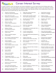 U UCanGo2 org TM WITHIN REACH ... WITHIN YOU Career Interest Survey In order to choose a career that will give you personal satisfaction, you must spend some time thinking about what really interests you. This activity helps you match your interests to different types of careers. For each item, circle the letter of the activity you would rather do. It doesn’t matter if you like both of them a lot or dislike both of them a lot; just pick the one you would rather do, and circle that letter. A – Operate a printing press B – Study the causes of earthquakes E – Make three-dimensional items D – Analyze handwriting L – Build kitchen cabinets N – Refinance a mortgage C – Plant and harvest crops R – Replace a car window and fender B – Design indoor sprinkler systems F – Run a factory sewing machine A – Sing in a concert R – Direct the takeoff/landing of planes E – Analyze reports and records F – Operate a machine G – Develop personnel policies Q – Train racehorses G – Operate a cash register B – Collect rocks G – Work in an office H – Answer customer questions D – Guard an office building H – Run a department store G – Start a business L – Draft a blueprint A – Write for a newspaper D – Write reports J – Help former prison inmates find work G – Use a calculator M – Assess student progress L – Design an airplane L – Design a freeway M – Plan educational lessons O – Help people at a mental health clinic O – Wrap a sprained ankle I – Guide an international tour group L – Remodel old houses N – Balance a checkbook O – Take an X-ray M – Care for young children D – Locate a missing person P – Write a computer program Q – Train animals N – Plan estate disbursements/payments Q – Manage a veterinary clinic P – Enter data K – Lead others C – Be in charge of replanting forests A – Act in a TV show or movie A – Design a book cover E – Build toys with written instructions E – Operate heavy equipment Q – Manage a fish hatchery D – Solve a burglary F – Check products for quality B – Figure out why someone is sick R – Fly an airplane F – Assemble cars K – Protect our borders E – Build an airport G – Keep company business records C – Learn how things grow and stay alive A – Play an instrument H – Sell cars J – Plan activities for adult day care F – Put together small tools P – Design a website I – Work as a restaurant host or hostess C – Research soybean use in paint D – Fight fires J – Provide consumer information M – Tutor students Q – Work at a zoo G – Keep payroll records for a company D – Guard money in an armored car J – Work in a nursing home B – Study human behavior J – Take care of children O – Plan special diets G – Hire new staff E – Fix a television set O – Run ventilators/breathing machines M – Run a school A – Choreograph a dance K – Lobby or show support for a cause R – Drive a taxi A – Broadcast the news F – Fix a control panel J – Help friends with personal problems H – Sell clothes E – Work with your hands K – Audit taxes for the government B – Sort and date dinosaur bones C – Oversee a logging crew B – Study weather conditions I – Work at an amusement park N – Sell insurance O – Give shots C – Design landscaping R – Pack boxes at a warehouse A – Teach dancing I – Learn about ethnic groups P – Manage an information system P – Give tech support to computer users O – Sterilize surgical instruments D – Work in a courtroom B – Study soil conditions N – Appraise the value of a house M – File books at the library Q – Care for injured animals I – Serve meals to customers UCanGo2 Student Workbook P – Solve technical problems J – Provide spiritual guidance to others N – Play the stock market C – Protect the environment M – Grade papers R – Operate a train F – Install rivets Q – Raise worms R – Inspect cargo containers F – Work in a cannery L – Order building supplies E – Paint motors N – Balance accounts M – Develop learning games I – Coach a school sports team P – Update a website P – Develop new computer games H – Buy merchandise for a store J – Read to sick people P – Repair computers Q – Hunt K – Enlist in a branch of the military K – Work to get someone elected C – Identify plants in a forest F – Compare sizes and shapes of objects H – Sell sporting goods J – Cut and style hair Q – Fish D – Guard inmates in a prison L – Read blueprints R – Repair bicycles K – Deliver mail B – Experiment to find new metals N – Work in a bank H – Line up concerts for a band K – Ask people survey questions M – Teach Special Education P – Set up a tracking system G – Work with computer programs N – Loan money E – Manage a factory O – Work as a nurse in a hospital G – Manage a store H – Advertise goods and services L – Hang wallpaper D – Make an arrest A – Paint a portrait K – Testify before Congress R – Distribute supplies to dentists I – Compete in a sports event O – Deliver babies H – Persuade people to buy something B – Work with a microscope I – Check guests into a hotel I – Schedule tee times at a golf course M – Teach adults to read C – Classify plants O – Transcribe medical records H – Stock shelves I – Serve concession stand drinks L – Follow step-by-step instructions N – Collect past due bills Career Evaluation Count the number of times you circled each letter and record each number in the chart below. A: B: C: D: E: F: G: H: I: J: K: L: M: N: O: P: Q: R: Now that you have the results from your career interest assessment, it’s time to learn about specific career fields that match your interests. Write down the two letters with the most responses. These are your top two areas of career interest. If you have a tie, list three: Find and read the description of your top are