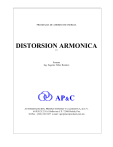 PROGRAMA DE AHORRO DE ENERGIA DISTORSION ARMONICA SLITE Ponente Ing. Eugenio Téllez Ramírez AUTOMATIZACION, PRODUCTIVIDAD Y CALIDAD S.A. de C.V. 16 SUR 2122 Col. Bellavista C.P. 72500 Puebla, Pue. Tel/Fax : (222) 243-5437 e-mail : apc@mail.precitool.com.mx ARMÓNICAS. INTRODUCCION La energía eléctrica comúnmente se genera en las grandes centrales utilizando máquinas rotatorias síncronas cuyo campo es excitado con un voltaje de CD e impulsado mecánicamente por una turbina, produciendo una tensión senoidal trifásica en las terminales de su armadura. Dicha forma de onda es característica del diseño de la máquina y de la disposición de sus devanados. Cuando un voltaje senoidal es aplicado a un circuito lineal las corrientes que fluye en el sistema y caídas de voltaje también son senoidales. Durante los últimos 20 años ha crecido la preocupación debido al hecho de que la forma de onda de corrientes y voltajes en alimentadores y buses se ha corrompido por la aparición de corrientes armónicas en los sistemas eléctricos de potencia, debido principalmente a la introducción masiva de la electrónica de potencia en las redes industriales, así como a la operación, cada vez más extendida, de grandes hornos de arco usados para fundición de acero, grandes instalaciones de computadoras y equipo electrónico de control. Estudios realizados por el Electric Power Research Institute (EPRI) muestran que al año 2000, cerca del 60% de la energía eléctrica consumida en los Estados Unidos pasa a través de algún dispositivo semiconductor antes de llegar a la carga. Esta cifra era 40% en 1995. Ante esta situación es indispensable aplicar medidas que conlleven a mantener los sistemas eléctricos con una calidad de energía adecuada y aprovechar las ventajas de la tecnología de los equipos electrónicos que ayudan a incrementar la productividad, confort y ahorro de energía. AUTOMATIZACIÓN, PRODUCTIVIDAD Y CALIDAD S.A DE C.V. 16 SUR 2122 COL. Bellavista TEL/FAX (2) 243 5437 apc@mail.precitool.com.mx ARMÓNICAS. 1.0 DISTORSION ARMONICA Cuando el voltaje o la corriente de un sistema eléctrico tienen deformaciones con respecto a la forma de onda senoidal, se dice que la señal está distorsionada. La distorsión puede deberse a: • Fenómenos transitorios tales como arranque de motores, conmutación de capacitores, efectos de tormentas o fallas por cortocircuito entre otras. Fig. 1.1.1) Efecto en el voltaje por la conmutación de capacitores • Condiciones permanentes que están relacionadas con armónicas de estado estable. En los sistemas eléctricos es común encontrar que las señales tendrán una cierta distorsión que cuando es baja, no ocasiona problemas en la operación de equipos y dispositivos. Existen normas que establecen los límites permisibles de distorsión, dependiendo de la tensión de operación y de su influencia en el sistema. Fig. 1.1.2) Forma de onda de corriente en a) variador de velocidad de CA b) balastra magnética AUTOMATIZACIÓN, PRODUCTIVIDAD Y CALIDAD S.A DE C.V. 16 SUR 2122 COL. Bellavista TEL/FAX (2) 243 5437 apc@mail.precitool.com.mx ARMÓNICAS. 1.2 Características de la distorsión armónica Cuando la onda de corriente o de tensión medida en cualquier punto de un sistema eléctrico se encuentra distorsionada, con relación a la onda sinusoidal que idealmente deberíamos encontrar, se dice que se trata de una onda contaminada con componentes armónicas. Para que se considere como distorsión armónica las deformaciones en una señal, se deben de cumplir las siguientes condiciones : • • • Que la señal tenga valores definidos dentro del intervalo, lo que implica que la energía contenida es finita Que la señal sea periódica, teniendo la misma forma de onda en cada ciclo de la señal de corriente o voltaje. Permanente.- Cuando la distorsión armónica se presenta en cualquier instante de tiempo, es decir, que no es pasajera. AUTOMATIZACIÓN, PRODUCTIVIDAD Y CALIDAD S.A DE C.V. 16 SUR 2122 COL. Bellavista TEL/FAX (2) 243 5437 apc@mail.precitool.com.mx ARMÓNICAS. 1.3 Definición de armónicas Este concepto proviene del teorema de Fourier y define que, bajo ciertas condiciones analíticas, una función periódica cualquiera puede considerarse integrada por una suma de funciones senoidales, incluyendo un término constante en caso de asimetría respecto al eje de las abscisas, siendo la primera armónica, denominada también señal fundamental, del mismo período y frecuencia que la función original y el resto serán funciones senoidales cuyas frecuencias son múltiplos de la fundamental. Estas componentes son denominadas armónicas de la función periódica original. Función original Componente fundamental 5ª armónica 7ª armónica 11ª armónica Fig. 1.3.1) Forma de onda original y sus componentes armónicos: 1ª ,5ª ,7ª ,11ª AUTOMATIZACIÓN, PRODUCTIVIDAD Y CALIDAD S.A DE C.V. 16 SUR 2122 COL. Bellavista TEL/FAX (2) 243 5437 apc@mail.precitool.com.mx ARMÓNICAS. Las ondas simétricas contienen únicamente armónicas impares, mientras que para ondas asimétricas existirán tanto armónicas pares como impares. Cuando se hacen mediciones de las ondas de corriente o voltaje utilizando analizadores de armónicas, el equipo efectúa integraciones mediante la técnica de la trasformada rápida de Fourier, dando como resultado la serie de coeficientes Ah que expresadas con relación a la amplitud A1 de la fundamental, constituye el espectro de corrientes armónicas relativo a la onda medida. Fig. 1.3.2) Componentes armónicas relativas a la fundamental de la señal de la Fig. 1.3.1 Estas señales pueden visualizarse en un sistema tridimensional en el que se representan su magnitud, ubicación en frecuencia y a lo largo del tiempo. Fig. 1.3.3) Componentes en el dominio del tiempo y de la frecuencia AUTOMATIZACIÓN, PRODUCTIVIDAD Y CALIDAD S.A DE C.V. 16 SUR 2122 COL. Bellavista TEL/FAX (2) 243 5437 apc@mail.precitool.com.mx ARMÓNICAS. 1.4 Ca