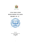 Republic of Zambia CIVIC EDUCATION HIGH SCHOOL SYLLABUS GRADE: 10 - 12 Prepared by: The Curriculum Development Centre P.O. BOX 50092 Lusaka – Zambia 2004 i © Curriculum Development Centre, 2003. All rights reserved. No part of this publication may be reproduced, stored in a retrieval system, or transmitted in any form or by any means, electronic, mechanical, photocopying, recording, or otherwise, without the prior written permission of the copyright owner. ii PREFACE The historical background of the Zambia High School Civic Education Curriculum can be traced to the period after 1991 when Democratic system of Governance was reintroduced in Zambia. As a result, in 1995, the Ministry of Education in conjunction with the Southern University Democratic Governance Project under United States Agency for International Development (USAID), commissioned a Needs Assessment on the introduction of Civic Education in Zambian High Schools. This study was undertaken by a group of experts spearheaded by Professor Geoffrey Lungwangwa. One key recommendation from the Lungwangwa Study was that Civic Education needed to be introduced in all High Schools in Zambia. However, it was not until 2002 that this objective was achieved. A Feasibility Study and Baseline’ Survey was Commissioned by Irish Aid under it’s Governance Portfolio, in partnership with the Ministry of Education, through the Curriculum Development Centre (CDC). The findings from the two research works clearly indicated the importance of the Outcomes Based Approach in the Civic Education Curriculum. Emphasis was made on the integration of the following aspects: A variety of methodologies such as, debate, field trips drama simulations and research work. A project or field work component aimed at providing learners with an opportunity to develop and acquire research, analysis, evaluation and reporting skills among others. In view of the above, Curriculum Development Centre produced the Civic Education Syllabus between September and November 2003. The themes and topics covered in the Civic Education Curriculum are based on the set goals of the National Policy on education “Educating Our Future” (1996). Pages 5-6. It is hoped that this syllabus will enable school leavers to gain the Civic knowledge and acquire skills to make them understand and practise their civic values right and obligation as responsible Zambian citizens. Dr. James Mulungushi PERMANENT SECRETARY MINISTRY OF EDUCATION iii ACKNOWLEDGEMENTS The High School Civic Education Teaching and Learning Materials were developed by a committee of professionals drawn from various institutions comprising Curriculum Development Specialists from the Curriculum Development Centre, Civic Education teachers from pilot schools and lecturers from the University of Zambia, Nkrumah College of Education and National In-Service Teachers College. The team worked tirelessly under the supervision of the Chief Curriculum Specialist, Ms. Oakinah Mutinta Mweembe. We are greatly indebted to the Permanent Secretary, Ministry of Education, Mrs. Lilian E. L. Kapulu for her invaluable support, and Mr. Alfred K. Sikazwe, former Director, Standards and Curriculum for his guidance, encouragement and passionate support towards the Civic Education programme from inception. The writing team greatly appreciates the help received in form of training and materials from the Human Rights Commission (HRC), the Anti-Corruption Commission (ACC), the Drug Enforcement Commission (DEC), Transparency International Zambia (TIZ) and Zambia Civic Education Association (ZCEA) among others. We wish to express our gratitude and appreciation to Ms Mary Mupeta and Ms Josephine Kambikambi for the invaluable secretarial duties they performed in the course of writing these materials. We also thank many other people too numerous to mention, who in one way or the other contributed to the production of the materials. Finally, our sincere gratitude goes to the Government of Ireland through the Governance Portfolio of the Irish Aid for funding the High School Civic Education programme in Zambia. F. C. Mfula (Mrs) Acting Director STANDARDS & CURRICULUM MINISTRY OF EDUCTION iv INTRODUCTION The Civic Education Component is currently integrated in the Social and Development Curriculum covered at Grades 1-7. However at the Upper Basic (Grades 8-9), it is offered as a separate subject. The introduction of Civic Education at High School level was to fill the gap that existed between Grade 9 and College or University level of education. This gap has had an impact on Grade 12 school leavers who in most cases graduated with little or no experience of Civic Education with regards to their roles, rights and obligation. Hence, this major development in the curriculum was identified as an important contribution to Zambia’s education system. The High School Civic Education Syllabus covers a cross section of political, economic, social and cultural issues that are key to Zambia’s democratic system of governance. Some of the themes and topics covered in the Civic Education Syllabus include: Constitution, Citizenship, Governance System in Zambia, Introduction to Human Rights, Corruption, Introduction to Cultural Studies, Substance Abuse. Governance, Family Law, Development Planning, Poverty in Zambia, Environmental Education and Global Issues. Undoubtedly, the teaching and learning of Civic Education will help society recognize the role that this subject plays in our constantly changing world. The Ministry of Education, therefore, hopes that through civic education learners will be equipped with knowledge; skills and values to enable them practise their civic rights and perform duties as responsible Zambian citizens. v AUTHORS: Dr. Yizenge A. Chondoka Dr. O. Chakulimba Dr. Charles M. Namafe Mrs. Beatrice M. Hamwiinga Mr. Paison K. Katambala Ms. Judith M. Mulenga Mr. Isaac C. J. Mwanza Mrs. Beatrice C. Mweene Mrs. Lilian S. Ntalasha Mr. Geoffrey D. Simfuk