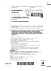 PMT Please check the examination details below before entering your candidate information Candidate surname Pearson Edexcel Level 3 GCE Time 1 hour 30 minutes Other names Centre Number Paper reference Candidate Number 9FM0/3C Further Mathematics Advanced PAPER 3C: Further Mechanics 1 You must have: Mathematical Formulae and Statistical Tables (Green), calculator Total Marks Candidates may use any calculator permitted by Pearson regulations. Calculators must not have the facility for symbolic algebra manipulation, differentiation and integration, or have retrievable mathematical formulae stored in them. Instructions black ink or ball-point pen. •• Use If pencil is used for diagrams/sketches/graphs it must be dark (HB or B). in the boxes at the top of this page with your name, • Fill centre number and candidate number. Answer all questions and ensure that your answers to parts of questions • are clearly labelled. Answer the questions in the spaces provided • – there may be more space than you need. should show sufficient working to make your methods clear. Answers • You without working may not gain full credit. otherwise indicated, whenever a numerical value of g is required, • Unless take g = 9.8 m s and give your answer to either 2 significant figures or −2 3 significant figures. Information booklet ‘Mathematical Formulae and Statistical Tables’ is provided. •• AThere are 7 questions in this question paper. The total mark for this paper is 75. The marks each question are shown in brackets • – use this asfora guide as to how much time to spend on each question. Advice each question carefully before you start to answer it. •• Read Try to answer every question. your answers if you have time at the end. •• Check Good luck with your examination. Turn over P66800A ©2021 Pearson Education Ltd. 1/1/1/1/ *P66800A0128* PMT 1. A van of mass 900 kg is moving along a straight horizontal road. At the instant when the speed of the van is v m s−1, the resistance to the motion of the van is modelled as a force of magnitude (500 + 7v) N. When the engine of the van is working at a constant rate of 18 kW, the van is moving along the road at a constant speed V m s−1 (a) Find the value of V. (5) Later on, the van is moving up a straight road that is inclined to the horizontal at an 1 angle θ , where sin θ = 21 At the instant when the speed of the van is v m s−1, the resistance to the motion of the van from non-gravitational forces is modelled as a force of magnitude (500 + 7v) N. The engine of the van is again working at a constant rate of 18 kW. (b) Find the acceleration of the van at the instant when v = 15 (4) _____________________________________________________________________________________ _____________________________________________________________________________________ _____________________________________________________________________________________ _____________________________________________________________________________________ _____________________________________________________________________________________ _____________________________________________________________________________________ _____________________________________________________________________________________ _____________________________________________________________________________________ _____________________________________________________________________________________ _____________________________________________________________________________________ _____________________________________________________________________________________ _____________________________________________________________________________________ _____________________________________________________________________________________ _____________________________________________________________________________________ _____________________________________________________________________________________ _____________________________________________________________________________________ _____________________________________________________________________________________ _____________________________________________________________________________________ _____________________________________________________________________________________ _____________________________________________________________________________________ _____________________________________________________________________________________ _____________________________________________________________________________________ 2 *P66800A0228* PMT Question 1 continued _____________________________________________________________________________________ _____________________________________________________________________________________ _____________________________________________________________________________________ _____________________________________________________________________________________ _____________________________________________________________________________________ _____________________________________________________________________________________ _____________________________________________________________________________________ _____________________________________________________________________________________ _____________________________________________________________________________________ _____________________________________________________________________________________ _____________________________________________________________________________________ _____________________________________________________________________________________ _____________________________________________________________________________________ _____________________________________________________________________________________ _____________________________________________________________________________________ _____________________________________________________________________________________ _____