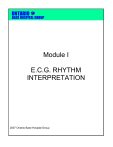 ONTARIO BASE HOSPITAL GROUP Module I E.C.G. RHYTHM INTERPRETATION 2007 Ontario Base Hospital Group E.C.G. RHYTHM INTERPRETATION Authors Mike Muir AEMCA, ACP Paramedic Program Manager Grey-Bruce-Huron Paramedic Base Hospital Grey Bruce Health Services, Owen Sound Kevin McNab AEMCA, ACP Quality Assurance Manager Huron County EMS Reviewers Rob Theriault EMCA, RCT(Adv.), CCP(F) Paramedic Program Manager Peel Base Hospital ECG Rhythm Interpretation Kim Arsenault AEMCA, ACP, BSc HK Advanced Care Paramedic Coordinator Peel Base Hospital 2 OBHG Education Subcommittee Table of Contents Section 1 – Electrophysiology Cardiac Conduction System .............................................................................................. 4-7 Anatomy and Physiology...................................................................................................... 4 Conduction Velocities and Times......................................................................................... 5 Role of the AV Node............................................................................................................ 5 Action Potential – Purkinje Fibre ......................................................................................... 6 Action Potential – Pacemaker Cell ....................................................................................... 7 Section 2 – ECG Monitoring Equipment ECG Paper ............................................................................................................................ 8 ECG Cables/Electrodes ........................................................................................................ 9 Rule of Electrical Flow......................................................................................................... 9 Lead Placement – Frontal Plane ........................................................................................... 10 Section 3 – ECG Interpretation P-QRS-T Configuration........................................................................................................ 11 Five Steps For ECG Interpretation ....................................................................................... 13 Step 1 – Rate......................................................................................................................... 14 Step 2 – Rhythm ................................................................................................................. 16 Step 3 – P-R Interval ............................................................................................................ 17 Step 4 – P-QRS-T Relationship............................................................................................ 17 Step 5 – QRS Duration ......................................................................................................... 18 Step 6 – Anything Missing/Added ....................................................................................... 18 Aberrant Conduction ............................................................................................................ 19 Section 4 – Cardiac Rhythms/Arrhythmias Supra Ventricular Rhythms .............................................................................................. 20-27 Normal Sinus Rhythm .......................................................................................................... 20 Sinus Bradycardia................................................................................................................. 20 Sinus Tachycardia ................................................................................................................ 21 Multifocal Atrial Tachycardia .............................................................................................. 21 Supraventricular Tachycardia............................................................................................... 22 Sinus Block........................................................................................................................... 22 Sinus Arrest .......................................................................................................................... 23 Sinus Arrhythmia ................................................................................................................. 23 Premature Atrial Complexes................................................................................................. 24 Premature Junctional Complexes ......................................................................................... 24 Atrial Flutter ................................................................................................................. 25 Atrial Fibrillation ................................................................................................................. 25 Wandering Atrial Pacemaker................................................................................................ 26 Junctional Rhythm................................................................................................................ 27 Heart Blocks........................................................................................................................ 29-31 First Degree Heart Block...................................................................................................... 29 Second Degree Heart Block Type I – Wenkebach ............................................................... 29 Second Degree Heart Block Type II..................................................................................... 30 Second Degree Heart Block Type II with 2:1 conduction.................................................... 30 Third Degree Heart Block .................................................................................................... 31 ECG Rhythm Interpretation 3 OBHG Education Subcommittee Table of Contents Section 4 – Car