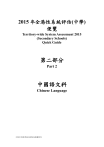 2015 年全港性系統評估(中學) 便覽 Territory-wide System Assessment 2015 (Secondary Schools) Quick Guide 第二部分 Part 2 中國語文科 Chinese Language ©2015 香港考試及評核局版權所有 第二部分 中國語文科 中學三年級 一、 評估範疇及依據 中國語文科的評估範疇為閱讀、寫作、聆聽及說話,題目依據《中國語文課程第 三 學 習階段基本能力(試用稿 )》及參照《中學中國語文建議學習重點(試用 本)(2001)》 、 《中國語文教育學習領域•中國語文課程指引(2002)》等課程文件擬訂。 二、評估形式 評估分為紙筆評估及說話評估兩種形式。紙筆評估包括閱讀、寫作、聆聽和視聽 資訊,說話評估則以廣州話或普通話口語形式進行。閱讀和寫作分別設三張分卷, 聆聽設兩張分卷,視聽資訊只設一張分卷。每名學生須在上述各範疇中作答其中 一張分卷。說話評估則以隨機抽樣方式進行。有關評估形式及詳情,表列如下: 評估日期 評估時限 評核方式 4 月 21 日 (星期二) 及 4 月 22 日 (星期三) 每名學生 7 分鐘 個人短講 每組 13 分鐘 小組討論 評估日期 6 月 23 日 (星期二) 備註 1. 以隨機抽樣形式進行,在每所學 校抽出 12 或 24 人接受評核。 2. 每名學生只參與其中一項評估。 3. 小組討論的組員為同班同學。 評估時限 分卷一 約 15 分鐘 視聽資訊(9CAV) 約 20 分鐘 聆聽(9CL1) 聆聽(9CL2) 75 分鐘 寫作(9CW1) 寫作(9CW2) 寫作(9CW3) 30 分鐘 閱讀(9CR1) 閱讀(9CR2) 閱讀(9CR3) ©2015 香港考試及評核局版權所有 2-1 分卷二 分卷三 三、評估模式及重點 (一)寫作評估 時 限:七十五分鐘 題 量:兩題(文章及實用文) 類 別:文章和實用文﹝請參考第三學習階段基本能力 (試 用稿)﹞ 字數要求:字數不限 (二)視聽資訊評估 時 限:約十五分鐘(包括閱卷時間、作答時間及核卷時間) 評估模式:觀看短片後回答問題(短片只會播放一次) 題 型:以選擇題為主 (三)聆聽評估 時 限:約二十分鐘(包括閱卷時間、作答時間及核卷時間) 評估模式:聆聽錄音內容後回答問題(錄音內容分兩部分播 放,每部分只會播放一次) 題 型:以選擇題為主 (四)閱讀評估 時 限:三十分鐘 評核內容:閱讀理解(語體文、文言文、實用文) 文章類別:請參考第三學習階段基本能力(試用稿) 題 型:選擇、填空、問答等 ©2015 香港考試及評核局版權所有 2-2 (五)說話評估 時限: 個人短講:每名學生七分鐘 小組討論:每組十三分鐘 隨機抽樣:十二或二十四名學生(視乎學校實際人數) 評估模式: 第一部分:個人短講 學生須依題目要求完成短講 預備時間:五分鐘,說話時限:兩分鐘 第二部分:小組討論 四人一組 學生須依據題目要求,與同班同學進行討論 預備時間:五分鐘,討論時限:八分鐘 備註: 如學校有二十四名學生參與說話評估,每名學生 只須參 與其中一個評估部分 ,即個人短講或小組討論 如參與說話評估的人數少於二十四名,學生則 可能須參 與兩個評估部分 ,即個人短講及小組討論 ©2015 香港考試及評核局版權所有 2-3 四、題目舉例 以下題目僅屬舉隅,旨在讓教師及有關人士了解評估的擬題方向,這 些題目示例並不代表評估中的所有模式及題型。 (一)寫作評估 文章寫作 1. 學生須知: 1. 字數不限。 2. 可運用不同的表達方法,例如:記述、描寫、抒情或論說等。 以「一件______的事」為題,寫一篇文章。 (請先在橫線上填上適當文字,使之成為一道完整的題目。) 2. 學生須知: 1. 字數不限。 2. 可運用不同的表達方法,例如:記述、描寫、抒情或論說等。 試以「照片」為題,寫一篇文章。 實用文寫作 牛頭角 邨區議員 樂勇敢 為提高邨內居民的環保意識,特別舉辦 「廢物換獎賞」的活動。假設你是他的助理,試據下列有關資料,擬 一則通告,說明活動的目的、介紹活動的詳情,並呼籲居民積極參與。 ©2015 香港考試及評核局版權所有 2-4 文章寫作評卷參考 等級 1 內容 結構 文句 詞語運用 ‧ 沒有寫作 ‧ 只 抄 錄 題 目 /只 有 圖 畫 ‧ 寫 成 新 詩 /對 話 體 ‧ 內容不雅、帶有侮辱或戲謔成份 離 題 / 文 意 不 沒有分段 文句不通 用詞失當 完整 2 不 切 題 / 內 容 結構鬆散,段 文句欠通順 空泛 落銜接欠自然 U 3 4 5 用詞生硬 錯別字 標點 很多錯別字 誤用標點符號 頗多 偶有錯別字 偶爾誤用標點 符號,但不礙 文意 能恰當運用標 點符號 大致切題;內 結 構 大 致 完 文句大致通順 用詞大致恰當 很少錯別字 容一般 整,分段大致 恰當 切題;內容充 結構完整,段 文句通順 用詞準確 實 落銜接自然 主題明確;內 結構嚴謹,脈 行文流暢,句 用詞生動傳神 容豐富;意念 絡分明,呼應 式多變 完整 得宜 實用文寫作評卷參考 內容 (i)活動目的 (ii)活動日期 (iii)收集地點 (iv)獎賞詳情 (v)呼籲居民參加 格式 備註 等級 U 準則 • 沒有寫作 • 只抄錄題目 • 沒有任何實用文格式 • 誤用其他實用文格式,例如把通告寫成書信 • 只有格式正確而內容完全未能對應重點或大 • 沒有標題(或沒有「通告」二字)及 沒有「特此通告」 段抄錄題目資料 • 內容要點不足 (4 項或以上欠缺/錯誤) 1 • 格式完整 • 文句尚通順 • 內容要點不足 (1 項欠缺/錯誤) 2 • 格式不完整 (1-2 項欠缺/錯誤) • 文句大致通順 3 接受: -- 標題寫法: 樂勇敢議員辦事處「廢物換獎賞」通告/ 樂勇敢議員辦事處通告/通告 不接受: -- 「XXXX 年 X 月 X 日」的日期寫法 (i) 標題置中 (ii) (以)上通告 牛頭角邨居民 或 特此通告 ﹝牛頭角邨居民