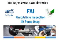 IRIS ISO/TS 22163 RAYLI SİSTEMLER FAI First Article Inspection İlk Parça Onayı 1 EĞİTİM İÇERİĞİ: FAI NEDİR FAI NIN AMACI VE FAYDALARI TEKNİK TERİMLER FAI ÇALIŞMALARI VE YENİ ÜRÜN DEVREYE ALMA YAŞAM DÖNGÜSÜ İÇERİSİNDE FAI YENİ ÜRÜN DEVREYE ALMA TEDARİKÇİLERDE FAI YÖNETİMİ DEĞİŞİKLİK YÖNETİMİ FAI RAPOR FORMATI UYGULAMALAR YAZILI SINAV (GEÇME NOTU 60/100) EĞİTİM SÜRESİ : 1 GÜN EĞİTİM NO : IRIS-03 GÜNCELLEME TARİHİ: 24.10.2022 2 RAMS GÜVENİLİRLİK – ELDE EDİLEBİLİRLİK – SÜRDÜRÜLEBİLİRLİK – GÜVENLİK APQP İLERİ ÜRÜN KALİTE PLANLAMASI FAI FAI FAI ELDE EDİLEBİLİRLİK SÜRDÜRÜLEBİLİRLİK BAKIM GERİ BİLDİRİMLER FAI FAI FAI GÜVENİLİRLİK GÜVENLİK DEĞİŞİKLİK YÖNETİMİ ELDE EDİLEBİLİRLİK RİSK DEĞERLENDİRME SÜRDÜRÜLEBİLİRLİK ELDEN ÇIKARMA LIFE CYCLE / YAŞAM DÖNGÜSÜ 3 FAI: Ürün Dizayn gereklilikleri ve Üretim prosesi gerekliliklerinin karşılanıp karşılanmadığını net olarak ortaya konmasıdır. Performansı ve güvenlik seviyesi yüksek bir ürün ve seri şartlarda üretilebilir ve karakteristikleri tekrarlanabilir bir ürün olmalıdır. 8.4.2.1- Yeni ürün onayı veya değişiklik sonrası EPPPS için izin onayı şunları içermelidir: c) FAI ‘yi tedarikçi sahasında (bkz. 8.9) veya uygun gelen / giden denetiminin yürütülmesi. Yeni veya değiştirilmiş EPPPS için sürüm onayı şunları içermelidir: a) tüm kritik özelliklerde süreç yeterliliğinin kanıtı; b) ürünlerin operasyonel ve entegrasyon olgunluğunun değerlendirilmesi. 4 8.9.1 Organizasyon FAI yönetimini anlattığı dokümante edilmiş bir süreç oluşturmalıdır. Bu süreç dokümante edilmeli, içselleştirilmeli ve sürdürülmelidir. K.O. (Knock-out) https://www.irqb.org/publications/ IRQB yayınlarında FAI örnekleri bulabilirsiniz. 5 OLUŞTURULMUŞ OLAN FAI SÜRECİ ŞUNLARI İÇERMELİDİR: a) FAI 'ye tabi ürünleri belirlemek için tanımlanmış kriterlere göre planlama (bakınız 8.4.1.1); b) FAI kapsamının hazırlanması; (FAI ye dahil olacak parça detayları) c) kritik ve özel süreçlere odaklanan üretim süreçlerinin gözden geçirilmesi de dahil olmak üzere denetim ve doğrulama faaliyetleri; d) kriterler: 1) seri üretimin serbest bırakılması için kriterleri; 2) şartlı kabul için kriterleri; 3) reddetmek için kriterleri. e) düzeltici faaliyetlerin takibi. 6 FAI KPI ÖLÇME VE İZLEME TAVSİYESİ: 9.1.1.1-4 Assesment Sheet / Değerlendirme Soru listeleri Firmanın FAI sonuçlarının takibi ve iyileştirilmesi için, FAI KPI ı belirlemesi, ölçmesi ve izlemesi esastır / tavsiyedir (SHOULD) İlk seferde doğru ürün, beklentileri karşılama oranı, FAI sunum performansı (kabul edilen FAI / toplam sunulan FAI) gibi. 7 FAI ’NİN FAYDALARI: * Ürün gerçekleştirme süreçlerinin uygun ürün üretebileceğine dair güven sağlar. * Ürünün üreticilerinin ve işleyicilerinin ilgili gereksinimleri tanımlar. * Proses kapasitesinin nesnel kanıtını sağlar. * Üretim başlatma ve/veya süreç değişiklikleriyle ilişkili potansiyel riskleri azaltır. * Üretimin başlangıcında ve bu standartta belirtilen değişikliklerden sonra ürün uygunluğunun güvencesini sağlar. FAI 'NİN AMACI: * Gelecekteki kaçışları, riskleri ve toplam maliyetleri azaltır. * Yolculuk güvenliğini sağlamaya yardımcı olur. * Kaliteyi, teslimatı ve müşteri memnuniyetini artırır. * Ürün uygunsuzluklarıyla ilişkili maliyetleri ve üretim gecikmelerini azaltır. * Uygun ürün üretemeyen ürün gerçekleştirme süreçlerini tanımlayın ve başlatın ve/veya düzeltici eylemler başlatır. 8 ISO/TS 22163, FAI'yi şu şekilde tanımlar: Bir üretim sürecini doğrulamak için bir dizi inceleme ve doğrulama faaliyetleri. Lütfen aşağıdaki uygulama hususlarına dikkat edin (bkz. IRIS Certification® Uygunluk Değerlendirmesi: 2020): • Ürün tek seferlik ise, FAI doğrulama anlamına gelir. • FAI, yalnızca tasarımda faaliyet gösteren kuruluşlar için geçerli değildir. • Ürün yalnızca yazılımsa, FAI, geçerli IEC standartlarına göre doğrulama anlamına gelir (ör. EN 50128 / EN: 50657) • FAI, organizasyonun üretim sürecinin önemli bir kilometre taşıdır. 9 RESİM GEREKSİNİMLERİ Ürünün uygulanacağı teknik resim ve ilgili parça listeleri, spesifikasyon veya satın alma belgesinin gereksinimleri çağrılan herhangi bir not, spesifikasyon ve daha düşük seviyeli çizimler dahil olmak üzere üretilmiştir. ILK PARÇA ONAYI (FAI) - ÜRETİM SÜRECİ DOĞRULAMASI OLARAK AYRICA ADLANDIRILIR Öngörülen koşulları sağlamak için planlı, eksiksiz, bağımsız ve belgelenmiş bir inceleme ve doğrulama süreci üretim süreçleri mühendislik çizimlerine, DPD'ye, planlamaya, satın alma siparişine uygun bir ürün ürettimi, mühendislik spesifikasyonları ve/veya diğer uygulanabilir tasarım belgeleri. 10 ILK PARÇA ONAYI RAPORU (FAI R) İlgili FAI sonuçları dahil olmak üzere bir parça numarası, alt montaj veya montaj için belge formları ve paketi, bu standart tarafından tanımlandığı gibi. İLK ÜRETİM ÇALIŞMASI Gelecekteki üretimde kullanılmak üzere, tasarlanmış planlı bir sürecin sonucu olan aynı üretim grubuna ait, bir veya daha fazla parçadan oluşan parçalar. ÇOKLU ÖZELLİKLER Birden fazla yerde meydana gelen, ancak tek bir çizim seti tarafından belirlenen özdeş özellikler veya DPD gereksinimleri (örneğin, perçin deliği boyutu, kırlangıç kuyruğu yuvaları, köşe yarıçapları, kimyasal frezeleme cep kalınlığı). (DPD Defined Product Dimension) 11 ÜRÜN: Ürün gerçekleştirme sürecinden kaynaklanan ve bu standart kapsamında bitmiş ürünleri içeren herhangi bir amaçlanan çıktı. Detaylı parçalar, alt montajlar, montajlar, dövmeler ve dökümler. YETKİN EKİP: Evrensel (parçaya özel değil) kalibre edilmiş izleme ve ölçüm ekipmanı (örn.benze