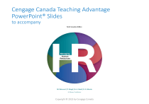 Cengage Canada Teaching Advantage PowerPoint® Slides to accompany Copyright © 2023 by Cengage Canada CHAPTER 1 The World of Human Resources Management Copyright © 2023 by Cengage Canada 1-2 Learning Outcomes – 1 LO1 Explain how human resources managers and other managers have rewarding careers through the strategic management of people. LO2 Explain how good human resources practices can help a firm gain a sustainable competitive advantage and how COVID-19 may impact this relationship. LO3 Describe how technology can improve how people perform their work and how they are managed. Copyright © 2023 by Cengage Canada 1-3 Learning Outcomes – 2 LO4 Explain the dual goals human resources managers have in terms of increasing productivity and controlling costs. LO5 Discuss how firms can leverage employee differences to their strategic advantage and how educational and cultural changes in the workforce are affecting how human resources managers engage employees. LO6 Provide examples of the roles and competencies of today’s human resources professionals. Copyright © 2023 by Cengage Canada 1-4 Why Study Human Resources Management? – 1 • Human Resources Management (HRM) − The process of managing human talent to achieve an organization’s objectives Copyright © 2023 by Cengage Canada 1-5 Why Study Human Resources Management? – 2 • Work with people to help solve organizational issues • Attract top-notch people to come to work with you and your firm • Determine the right people to hire so your team and company are a success • Help and coach people so they become top performers • Make pay and reward decisions that may influence peoples’ lives • Establish the strategic direction your firm should take Copyright © 2023 by Cengage Canada 1-6 Human Capital and HRM • Human capital – knowledge, skills, and capabilities of individuals that have economic value to an organization − intangible − cannot be managed the way organizations manage jobs, products, and technologies • Organizations must find ways to better use the knowledge of their workers. − Managers of all types must carry out the specific activities for a company to effectively do so. Copyright © 2023 by Cengage Canada 1-7 Figure 1.1 Overall Framework for HRM Copyright © 2023 by Cengage Canada 1-8 Competitive Issues and Human Resources Management – 1 • Issue 1: − Responding Strategically to Crisis, Changes, and Disruptions in the Local and Global Marketplace • Issue 2: − Setting and Achieving Corporate Social Responsibility and Sustainability Goals • Issue 3: − Advancing HRM with Technology Copyright © 2023 by Cengage Canada 1-9 Competitive Issues and Human Resources Management – 2 • Issue 4: − Containing Costs While Retaining Top Talent and Maximizing Productivity • Issue 5: − Responding to the Demographic and Diversity Challenges of the Workforce • Issue 6: − Adapting to Educational and Cultural Shifts Affecting the Workforce Copyright © 2023 by Cengage Canada 1-10 Issue 1: Responding Strategically to Crisis, Changes, and Disruptions – 1 • COVID-19 and HRM − COVID-19 has resulted in one of the most extreme organizational changes in the past century and strategic planning has become even more important. − It has highlighted the need for a feeling of community and common objectives. • HR Managers and Business Strategies − HR managers need an intimate understanding of their firm’s competitive business operations and strategies. − “No change means chance” Copyright © 2023 by Cengage Canada 1-11 Issue 1: Responding Strategically to Crisis, Changes, and Disruptions – 2 • Human resources managers need to understand the following: − Six Sigma − Reengineering − Downsizing − Outsourcing − Change management − Reactive change − Proactive change Copyright © 2023 by Cengage Canada 1-12 Issue 1: Responding Strategically to Crisis, Changes, and Disruptions – 3 • Six Sigma − A set of principles and practices whose core ideas include understanding customer needs, doing things right the first time, and striving for continuous improvement • Reengineering − The fundamental rethinking and radical redesign of business processes to achieve dramatic improvements in cost, quality, service, and speed Copyright © 2023 by Cengage Canada 1-13 Issue 1: Responding Strategically to Crisis, Changes, and Disruptions – 4 • Downsizing − Planned elimination of jobs (“head count”) • Outsourcing − Contracting out work that was formerly was done by employees • A common denominator of these strategies is that they require companies to engage in change management Copyright © 2023 by Cengage Canada 1-14 Issue 1: Responding Strategically to Crisis, Changes, and Disruptions – 5 • Change Management − Systematic way of bringing about and managing organizational changes and changes on the individual level COVID-19 has placed new restrictions at work. Copyright © 2023 by Cengage Canada 1-15 Issue 1: Responding Strategically to Crisis, Changes, and Disruptions – 6 • Good HR managers know that they can be key players when it comes to driving the business strategies of their organizations to make changes. • Reactive change − Changes that occur after external forces have already affected performance • Proactive change − Change initiated to take advantage of targeted opportunities Copyright © 2023 by Cengage Canada 1-16 Issue 1: Responding Strategically to Crisis, Changes, and Disruptions – 7 • Competing, Recruiting, and Staffing Globally − Globalization: the trend to opening up foreign markets to international trade and investment − About 70–85 percent of the Canadian economy today is affected by international competition. − China may overtake the U.S as the world's largest economy by 2041 • Impact of Globalization − “Anything, anytime, anywhere” markets − Partnerships with foreign firms − Lower trade and tariff bar