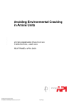 Avoiding Environmental Cracking in Amine Units --`,,```,,,,````-`-`,,`,,`,`,,`--- API RECOMMENDED PRACTICE 945 THIRD EDITION, JUNE 2003 REAFFIRMED, APRIL 2008 Copyright American Petroleum Institute Provided by IHS under license with API No reproduction or networking permitted without license from IHS Not for Resale --`,,```,,,,````-`-`,,`,,`,`,,`--- Copyright American Petroleum Institute Provided by IHS under license with API No reproduction or networking permitted without license from IHS Not for Resale Avoiding Environmental Cracking in Amine Units Downstream Segment API RECOMMENDED PRACTICE 945 THIRD EDITION, JUNE 2003 REAFFIRMED, APRIL 2008 --`,,```,,,,````-`-`,,`,,`,`,,`--- Copyright American Petroleum Institute Provided by IHS under license with API No reproduction or networking permitted without license from IHS Not for Resale SPECIAL NOTES --`,,```,,,,````-`-`,,`,,`,`,,`--- API publications necessarily address problems of a general nature. With respect to particular circumstances, local, state, and federal laws and regulations should be reviewed. API is not undertaking to meet the duties of employers, manufacturers, or suppliers to warn and properly train and equip their employees, and others exposed, concerning health and safety risks and precautions, nor undertaking their obligations under local, state, or federal laws. Information concerning safety and health risks and proper precautions with respect to particular materials and conditions should be obtained from the employer, the manufacturer or supplier of that material, or the material safety data sheet. Nothing contained in any API publication is to be construed as granting any right, by implication or otherwise, for the manufacture, sale, or use of any method, apparatus, or product covered by letters patent. Neither should anything contained in the publication be construed as insuring anyone against liability for infringement of letters patent. Generally, API standards are reviewed and revised, reafÞrmed, or withdrawn at least every Þve years. Sometimes a one-time extension of up to two years will be added to this review cycle. This publication will no longer be in effect Þve years after its publication date as an operative API standard or, where an extension has been granted, upon republication. Status of the publication can be ascertained from the API Downstream Segment [telephone (202) 682-8000]. A catalog of API publications and materials is published annually and updated quarterly by API, 1220 L Street, N.W., Washington, D.C. 20005. This document was produced under API standardization procedures that ensure appropriate notiÞcation and participation in the developmental process and is designated as an API standard. Questions concerning the interpretation of the content of this standard or comments and questions concerning the procedures under which this standard was developed should be directed in writing to the standardization manager, American Petroleum Institute, 1220 L Street, N.W., Washington, D.C. 20005. Requests for permission to reproduce or translate all or any part of the material published herein should also be addressed to the general manager. API standards are published to facilitate the broad availability of proven, sound engineering and operating practices. These standards are not intended to obviate the need for applying sound engineering judgment regarding when and where these standards should be utilized. The formulation and publication of API standards is not intended in any way to inhibit anyone from using any other practices. Any manufacturer marking equipment or materials in conformance with the marking requirements of an API standard is solely responsible for complying with all the applicable requirements of that standard. API does not represent, warrant, or guarantee that such products do in fact conform to the applicable API standard. All rights reserved. No part of this work may be reproduced, stored in a retrieval system, or transmitted by any means, electronic, mechanical, photocopying, recording, or otherwise, without prior written permission from the publisher. Contact the Publisher, API Publishing Services, 1220 L Street, N.W., Washington, D.C. 20005. Copyright © 2003 American Petroleum Institute Copyright American Petroleum Institute Provided by IHS under license with API No reproduction or networking permitted without license from IHS Not for Resale FOREWORD API publications may be used by anyone desiring to do so. Every effort has been made by the Institute to assure the accuracy and reliability of the data contained in them; however, the Institute makes no representation, warranty, or guarantee in connection with this publication and hereby expressly disclaims any liability or responsibility for loss or damage resulting from its use or for the violation of any federal, state, or municipal regulation with which this publication may conßict. Suggested revisions are invited and should be submitted to the Director, Standards Department, American Petroleum Institute, 1220 L Street, N.W., Washington, D.C. 20005, standards@api.org. --`,,```,,,,````-`-`,,`,,`,`,,`--- iii Copyright American Petroleum Institute Provided by IHS under license with API No reproduction or networking permitted without license from IHS Not for Resale --`,,```,,,,````-`-`,,`,,`,`,,`--- Copyright American Petroleum Institute Provided by IHS under license with API No reproduction or networking permitted without license from IHS Not for Resale CONTENTS Page 1 SCOPE . . . . . . . . . . . . . . . . . . . . . . . . . . . . . . . . . . . . . . . . . . . . . . . . . . . . . . . . . . . . . . . 1 2 REFERENCES . . . . . . . . . . . . . . . . . . . . . . . . . . . . . . . . . . . . . . . . . . . . . . . . . . . . . . . . 2.1 Referenced Publications . . . . . . . . . . . . . . . . . . . . . . . . . . . . . . . . . . . . . . . . . . . . 2.2 Referenced Codes and Standards . . . . . . . . . . . . . . . . . . . . . . . . . . . 