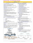 High School Biology - Core Concept Master Cheat Sheet Biology, 1 of 6 01: The Science of Biology 03: The Cell • Characeristics of life Organization: all lives are well organized Energy use: all lives need energy to support Reproduction: all lives should be able to reproduce itself Growth: all lives grow and develop. Response to stimuli: all lives can respond to internal or external stimuli Homeostasis: all lives have the ability to maintain a relatively stable internal environment—self-regulation • Basic Theory of modern biology Cell Theory • Cell is the building unit of all living organisms. • All cells come from pre-existing cells • All metaboism occur in cells of the body—cells are functional unit for all lives Gene Theory • All genetic information is stored in DNA – genes • Genes control most, if not every, aspects of an organism • The DNA language can be transcribed into RNA language and then translated into protein language for its final function Homeostasis • All living organisms have the ability to maintain a relatively constant internal environment • Purpose: to ensure proper function of the body Cell organelles and their functions: • Nucleus: the control center o Holds all of cell’s genetic information o Makes decisions about cell needs • Ribosome: the factory o Synthesizes proteins • Rough Endoplasmic Reticulum o Edits and finalizes proteins made by ribosomes. • Smooth Endoplasmic Reticulum o Synthesizes carbohydrates and lipids. • Golgi Apparatus: the post office o Tags and ships packages to their destinations • Mitochondria: the power house o Produces ATP for the cell’s activities. • Lysosome: the recycling center. o Recycles waste and foreign bacteria. The cell membrane: lipid bilayer which envelops the cell. For Protection, Communication, and Selective Exchange Passive Transport o Does not use energy o Osmosis, diffusion, facilitated diffusion o Natural movement from high concentration to low concentration. Active Transport o Uses energy o Movement from against natural diffusion Prokaryotes • Examples: bacteria, microscopic organisms • Structure: DNA, ribosomes, and cell membranes. • Except for ribosomes, prokaryotes DO NOT have organelles. Eukaryotes • Animals: with organelles and cell membranes o Plants: with organelles and cell membranes like animal cells, but also have chloroplasts and cell walls. 02: Chemical Basis of Life Atoms: o electrons: both energy and substance particles o neutrons o protons Molecules: o Formed by atoms o Joined by chemical bonds o molecular formula and structure formula Chemical Bond: Ion bond: ion bond forms when atoms lose or gain electrons. Covalent bond: Covalent bonds form when atoms share electrons, very strong bonds. The major one in organic chemicals. Hydrogen bond: Weak electrical attraction between the positive end of one molecule and the negative end of another Buffers: solutions which resist change in pH upon addition of small amounts of acid or base. pH: pH represents the concentration of hydrogen ions [H+] in solution.pH = -log [H+] Organic Contains carbon Monomers Macromolecules Contains Contains CHON Contains Sometimes S CHO Lipids Carbohydrates Proteins Starch Fats Glycogen Contains CHONP Anabolism (Construction of Molecules) Nucleic Acids Protein Carbohydrate Lipid Catabolism (Breakdown of Molecules) Protein Carbohydrate Lipid Steroids RNA Cellulose Enzyme 04: Cellular Respiration Aerobic Resoiration • Glycolysis o Glucose is broken down into pyruvate. o 2 ATP produced. • Krebs Cycle o Acetyl CoA (made from pyruvate) runs a cycle of reactions, regenerating at the end of each cycle. o All of the electrons are passed to NADH and FADH2 (electron carriers). o 2 ATP produced. • Oxidative Phosphorylation o 32 ATP produced. Anaerobic Resoiration • Glycolysis: Glucose is broken down into pyruvate; 2 ATP produced. • Fermentation: Pyruvate is broken down into ethanol or lactic acid. Glycolysis intermediates produced to allow glycolysis to begin again immediately. Metabolism (Chemical Reactions Necessary For Life) Phospholipid RapidLearningCenter.com DNA Protein Fatty Acid Glycolysis Synthesis Synthesis Glycogenesis Breakdown into Beta Amino Acids Oxidation © Rapid Learning Inc. All Rights Reserved High School Biology - Core Concept Master Cheat Sheet Biology, 2 of 6 05: Photosynthesis 07: Introduction to Ecology • Chloroplast: An organelle in plant cells where photosynthesis occur. • Photophosphorylation: a process that ATP is generated via light reactions in photosynthesis. • Light Reaction: The first phase of photosysnthesis which light is harvested and the electron transfer occurs, ATP, NADPH and oxygen is generated. • Dark Reaction: The second phase of photosynthesis where crbon dioxide is fixed and carbohydrates are generated by consuming ATP and NADPH. • Chloroplasts: These are organelles which allow the organism to perform photosynthesis, obtaining energy from sunlight. • Chlorophyll: Proteins found in chloroplasts which have the ability to absorb sunlight for photosynthesis. Organisms Environment Study of Organisms and Environment is called Show Ecology Behavioral Responses Abiotic Physiological Responses Biotic Temperature Water Morphological Responses Plants Light Soil 3 CO2 Animals Wind Rubisco Fire and other 6ATP 6 3PGA 6NADPH 3 RuBP The Calvin Cycle 5 P3G 6 P3G 3 ATP 1 P3G 06: The Cell Cycle Centrioles and spindle fibers break down. M checkpoint G2 checkpoint G1 checkpoint S checkpoint • Prophase o Chromosomes condense and become visible. o Nuclear envelope breaks down. o Centrioles take positions on opposite sides of nucleus. • Anaphase: o Sister chromatids are pulled apart to become individual chromosomes. o Chromosomes move until they reach centrioles on opposite sides of cell. RapidLearningCenter.com 08: Communities, Ecosystems, and Biomes • Primary Succession: An event in which life begins to exist where no life existed previously. • Se
