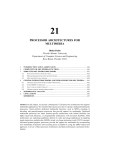 21 PROCESSOR ARCHITECTURES FOR MULTIMEDIA Borko Furht Florida Atlantic University Department of Computer Science and Engineering Boca Raton, Florida 33431 1. 2. 3. INTRODUCTION AND CLASSIFICATION........................................................................... 448 COMPLEXITY OF MULTIMEDIA FUNCTIONS ................................................................... 449 DEDICATED MULTIMEDIA PROCESSORS ......................................................................... 452 3.1 FUNCTION SPECIFIC ARCHITECTURES....................................................................................... 453 3.2 PROGRAMMABLE DEDICATED ARCHITECTURES........................................................................ 454 3.3 NEW ARCHITECTURAL TRENDS................................................................................................ 458 4. GENERAL-PURPOSE PROCESSORS AND THEIR SUPPORT FOR MULTIMEDIA....... 461 4.1 GENERIC OPERATIONS IN MULTIMEDIA PROCESSING................................................................ 461 4.2 INTEL MMX TECHNOLOGY ................................................................................................... 462 4.3 SUN ’S VISUAL INSTRUCTION SET .............................................................................................. 463 4.4 OTHER GENERAL-PURPOSE PROCESSORS ................................................................................ 465 5. PERFORMANCE ANALYSIS .................................................................................................... 465 6. CONCLUSIONS ......................................................................................................................... 466 REFERENCES .............................................................................................................................. 467 Abstract. In this chapter, we present contemporary VLSI processor architectures that support multimedia applications. We classified these processors into two groups: dedicated multimedia processors, which perform dedicated multimedia functions, such as MPEG encoding or decoding, and general-purpose processors that provide support for multimedia. Dedicated multimedia processors use either function-specific architectures with limited flexibility but higher speed and efficiency, or programmable architectures with increased flexibility. Both architectures are exploring parallelism inherent in video and image applications by applying single-instruction, multiple-data (SIMD) or/and very-large-instruction-word (VLIW) concepts. Advanced general-purpose processors provide the support for multimedia by incorporating new multimedia instructions and executing them in parallel by using the SIMD coprocessor approach. A survey of these processor architectures and their performance is presented in this chapter. 448 Chapter 21 447 1. INTRODUCTION AND CLASSIFICATION During the last few years we have witnessed the process of “poising” for multimedia: from PC and workstation manufacturers (multimedia PCs and workstations), add-in-board vendors (video and audio capture and playback cards), and silicon vendors (compression and graphics chips), to operating systems designers (OS support for multimedia) and software creators (authoring tools and a variety of multimedia applications). The last players to enter this poising game have been microprocessor designers. In this chapter, we present a survey of processor architectures designed to support multimedia applications. Designs of these architectures range from fully custom to fully programmable dedicated architectures and to general-purpose processor architectures with an extensive support for multimedia. The classification of these architectures is shown in Figure 1. Processor Architectures for Multimedia Dedicated Multimedia Processors Function-Specific Architectures AT&T AV4310 H.261/MPEG-1 encoder AV4220A H.261 decoder AV6110 MPEG-2 C-Cube CL450 MPEG-1 decoder CL9100 MPEG-2 decoder LSI Logic L64112 MPEG-1 decoder L64002 MPEG-2 decoder SGS-Thompson General-Purpose Processors Intel MMX (Pentium) Programmable Sun Architectures VIS (UltraSPARC) HP HP-PA RISC2 Flexible Adapted MIPS Programmable ProgrammableISA&MDMX Architectures Architectures DEC MVI (Alpha) Cyrix M2 TI MVP NEC VSP3 IIT VCP Matsushita VDSP2 C-Cube VideoRISC Array Micros. Figure 1. Classification of processor architectures that support multimedia. Dedicated multimedia processors are typically custom designed architectures intended to perform specific multimedia functions. These functions usually include video and audio compression and decompression, and in this case these processors are referred to as video codecs. In addition to support for compression, some advanced multimedia processors Processor Architectures for Multimedia 449 provide support for 2D and 3D graphics applications. Designs of dedicated multimedia processors range from fully custom architectures, referred to as function specific architectures, with minimal programmability, to fully programmable architectures. Furthermore, programmable architectures can be classified into flexible programmable architectures, which provide moderate to high flexibility, and adapted programmable architectures, which provide an increased efficiency and less flexibility [1]. The dedicated multimedia processors use a variety of architectural schemes from multiple functional units and a RISC or DSP (digital signal processor) core processors to multiple processor schemes. Furthermore, the latest dedicated processors use single-instruction-multiple-data (SIMD) and very-long-instruction-word (VLIW) architectures, as well as some hybrid schemes. These architectures are presented in Section 3. General-purpose (GP) processors provide support for multimedia by including multimedia instructions into the instruction set. Instead of performing specific multimedia functions (such as compression and 2D/3D graphics), GP processors provide instru