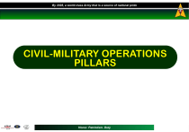 By 2028, a world-class Army that is a source of national pride CIVIL-MILITARY OPERATIONS PILLARS Honor. Patriotism. Duty By 2028, a world-class Army that is a source of national pride “Winning Hundreds of Battles is not the Acme of Skills… Winning Without Fighting is the Acme of Skills.” -Sun Tzu - Honor. Patriotism. Duty By 2028, a world-class Army that is a source of national pride References 1. AFP Civil-Military Operations Doctrine 2. Psychological Operations Manual 3. Public Affairs Manual 4. Public Information Handbook 3 Honor. Patriotism. Duty By 2028, a world-class Army that is a source of national pride Terminal Learning Objective (TLO) For students to be familiar with the fundamentals and Pillars of CMO. 4 Honor. Patriotism. Duty By 2028, a world-class Army that is a source of national pride Enabling Learning Objectives (ELO) • To know three Pillars of CMO • To know the different components of each pillar • To know how to create a CMO Template 5 Honor. Patriotism. Duty By 2028, a world-class Army that is a source of national pride CIVIL-MILITARY OPERATIONS PILLARS The pillars of CMO are Public Affairs, Civil Affairs, and Information Support Affairs (Psyops). Each pillar has corresponding activities that will accomplish the objectives of the CMO pillars. Honor. Patriotism. Duty By 2028, a world-class Army that is a source of national pride CIVIL-MILITARY OPERATIONS PILLARS 1. Public Affairs (PA) is CMO Pillar that conducts information-related activities directed to the external public to ensure clear, accurate, and timely dissemination of information. It is likewise performed to establish and maintain constructive relations with communities. The two components of PA are Public Information and Community Relations. 7 Honor. Patriotism. Duty By 2028, a world-class Army that is a source of national pride CIVIL MILITARY OPERATIONS PILLARS A. PUBLIC INFORMATION Public Information (PI) provides information to the general public. It intensifies public awareness about AFP. The following are activities classified under PI: 1) Press Releases ) Media Appearances 3) TV Appearance 4) Radio Appearance 5) Press Conferences 6) AFP Information Campaign 7) Public Symposium 8) Face-to-face Dialogues 9) Info Drive/TI & E 10) Radio Releases 11) TV Releases 12) Pulong-pulong/Dialogue Honor. Patriotism. Duty 13) TV Programs 14) Press Conference 5) Media Fellowship 16) Media Interviews 17) Print Releases 18) Video Releases 19) Press Releases 20) Photo Releases 21) Radio Program 22) Symposia 23) Film Showing By 2028, a world-class Army that is a source of national pride CIVIL MILITARY OPERATIONS PILLARS B. COMMUNITY RELATIONS- Community Relations (COMREL) involves the organized participation of AFP personnel in community-initiated activities and community participation in AFP-initiated activities. The following are activities classified under COMREL: 1) 2) 3) Objectives. 4) 5) 6) 7) 8) 9) 10) 11) 12) Military participation in Community Assemblies and Dialogues Community Participation in Military-Initiated Community Activities Production of Information Materials to Promote the Organization’s Community Initiated Activities Sports Events Religious Activities Local Customs and Traditions Balik Sigla Festival in Tarlac City Panagbenga Festival in Baguio City Santacruzan Festival Bangus Festival in Pangasinan Unang Sigaw ng Nueva Ecija in Cabanatuan City Honor. Patriotism. Duty By 2028, a world-class Army that is a source of national pride CIVIL MILITARY OPERATIONS PILLARS 13) 14) 15) 16) 17) 18) 19) 20) 21) 22) 23) 24) 25) 26) 27) 28) 29) 30) 31) Cleanliness/Beautification Civic Parade Alay Lakad Assistance to the Community Communication Assistance Transportation Assistance Security Assistance Manpower Assistance Humanitarian/Financial Assistance Vigil Assistance/Funeral Svcs Use of Camp Facilities Donation of Trash Cans & empty drums Operation Linis Band/Drummer/Bugler & Combo Services Technical Assistance Support to Illegal-Activities Anti-Drug Campaign (PDEA) Anti-Illegal Fishing (BFAR) Anti-Illegal Logging (AIL / DENR) Honor. Patriotism. Duty By 2028, a world-class Army that is a source of national pride CIVIL MILITARY OPERATIONS PILLARS 2. CIVIL AFFAIRS Civil Affairs (CA) is a CMO Pillar undertaken in coordination with civilian entities that promotes public trust through cooperation, collaboration, and conduct of sociological and developmental activities. The two components of Civil Affairs are Civil Relations and Civic Action. Honor. Patriotism. Duty By 2028, a world-class Army that is a source of national pride CIVIL MILITARY OPERATIONS PILLARS A. CIVIL RELATIONS (CIVREL) - is a program component of Civil Affairs that promotes cooperation and collaboration between the military and the civilian authorities. The following are activities classified under CIVREL: 1) Inter-Agency Coordination 2) Regional Peace and Order Council -Elected Chairman / RD, PRO 3) Peace and Order Council -Gov / PD, PPO 4) Municipal/City Peace and Order Council -Mayor / COP 5) Disaster Risk Reduction & Management Council –RD, OCD 2 6) Prov Disaster Risk Reduction & Management Council –Gov / PDMS 7) Mun/City Disaster Risk Reduction & Management Council -Mayor / 8) Regional Dev’t Council -Elected Chairman among Govs or Mayors 9) Provincial Development Council -Governor 10) City / Municipal Development Council - Mayor 11) Brgy POC/ Development Council – Brgy Chairman / Punong Barangay 12) Government Organizations 13) Non Government Organizations 14) National/ Local Government Agencies 15) Local Government Units Honor. Patriotism. Duty By 2028, a world-class Army that is a source of national pride CIVIL MILITARY OPERATIONS PILLARS 16) Participation in Cause-Oriented Initiatives. 17) Advocacy on Human Rights -CHR 18) Advocacy on Peace Process -OPAPP 19) Youth Development -NYC / SK 20) Participation in Socio-Cultural Activities -DOT / LGUs 21) Participation in National/Local Historical Events. 22) Araw ng Kagitinga