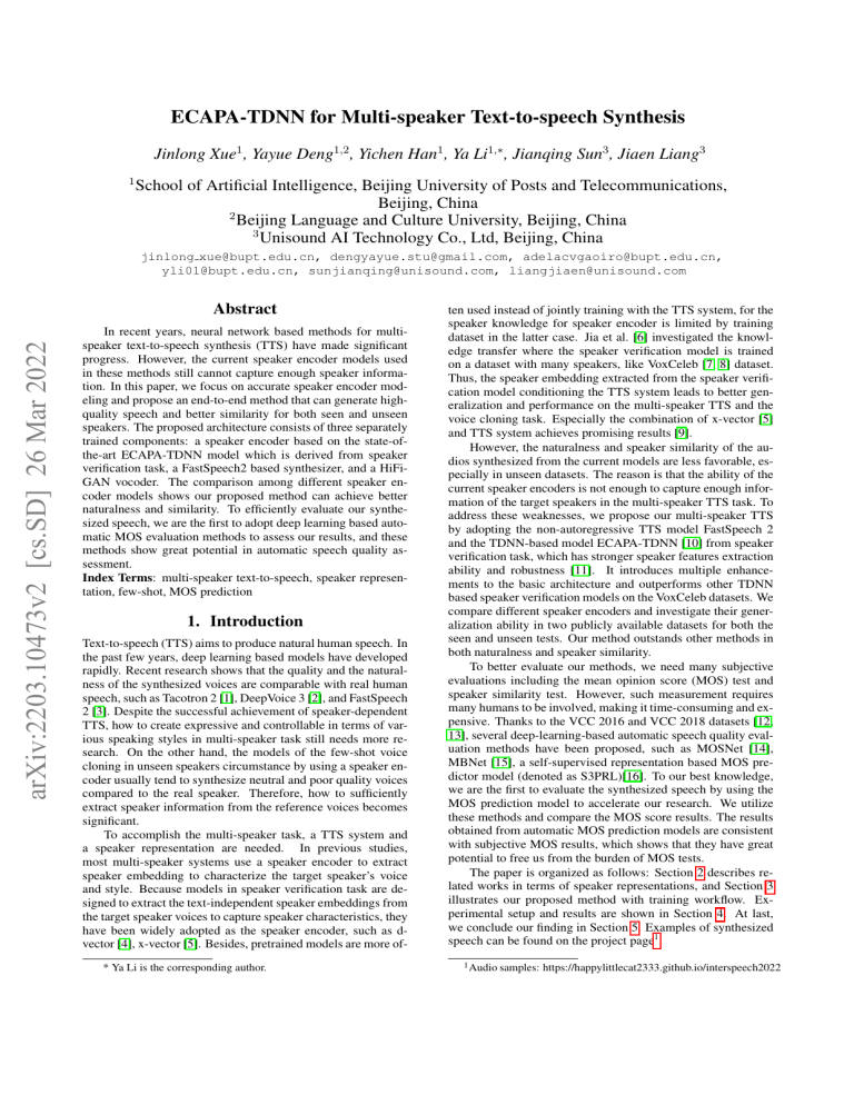 ECAPA-TDNN for Multi-speaker Text-to-speech Synthesis Jinlong Xue1 , Yayue Deng1,2 , Yichen Han1 , Ya Li1,∗ , Jianqing Sun3 , Jiaen Liang3 1 School of Artificial Intelligence, Beijing University of Posts and Telecommunications, Beijing, China 2 Beijing Language and Culture University, Beijing, China 3 Unisound AI Technology Co., Ltd, Beijing, China jinlong xue@bupt.edu.cn, dengyayue.stu@gmail.com, adelacvgaoiro@bupt.edu.cn, yli01@bupt.edu.cn, sunjianqing@unisound.com, liangjiaen@unisound.com arXiv:2203.10473v2 [cs.SD] 26 Mar 2022 Abstract In recent years, neural network based methods for multispeaker text-to-speech synthesis (TTS) have made significant progress. However, the current speaker encoder models used in these methods still cannot capture enough speaker information. In this paper, we focus on accurate speaker encoder modeling and propose an end-to-end method that can generate highquality speech and better similarity for both seen and unseen speakers. The proposed architecture consists of three separately trained components: a speaker encoder based on the state-ofthe-art ECAPA-TDNN model which is derived from speaker verification task, a FastSpeech2 based synthesizer, and a HiFiGAN vocoder. The comparison among different speaker encoder models shows our proposed method can achieve better naturalness and similarity. To efficiently evaluate our synthesized speech, we are the first to adopt deep learning based automatic MOS evaluation methods to assess our results, and these methods show great potential in automatic speech quality assessment. Index Terms: multi-speaker text-to-speech, speaker representation, few-shot, MOS prediction 1. Introduction Text-to-speech (TTS) aims to produce natural human speech. In the past few years, deep learning based models have developed rapidly. Recent research shows that the quality and the naturalness of the synthesized voices are comparable with real human speech, such as Tacotron 2 [1], DeepVoice 3 [2], and FastSpeech 2 [3]. Despite the successful achievement of speaker-dependent TTS, how to create expressive and controllable in terms of various speaking styles in multi-speaker task still needs more research. On the other hand, the models of the few-shot voice cloning in unseen speakers circumstance by using a speaker encoder usually tend to synthesize neutral and poor quality voices compared to the real speaker. Therefore, how to sufficiently extract speaker information from the reference voices becomes significant. To accomplish the multi-speaker task, a TTS system and a speaker representation are needed. In previous studies, most multi-speaker systems use a speaker encoder to extract speaker embedding to characterize the target speaker’s voice and style. Because models in speaker verification task are designed to extract the text-independent speaker embeddings from the target speaker voices to capture speaker characteristics, they have been widely adopted as the speaker encoder, such as dvector [4], x-vector [5]. Besides, pretrained models are more of* Ya Li is the corresponding author. ten used instead of jointly training with the TTS system, for the speaker knowledge for speaker encoder is limited by training dataset in the latter case. Jia et al. [6] investigated the knowledge transfer where the speaker verification model is trained on a dataset with many speakers, like VoxCeleb [7, 8] dataset. Thus, the speaker embedding extracted from the speaker verification model conditioning the TTS system leads to better generalization and performance on the multi-speaker TTS and the voice cloning task. Especially the combination of x-vector [5] and TTS system achieves promising results [9]. However, the naturalness and speaker similarity of the audios synthesized from the current models are less favorable, especially in unseen datasets. The reason is that the ability of the current speaker encoders is not enough to capture enough information of the target speakers in the multi-speaker TTS task. To address these weaknesses, we propose our multi-speaker TTS by adopting the non-autoregressive TTS model FastSpeech 2 and the TDNN-based model ECAPA-TDNN [10] from speaker verification task, which has stronger speaker features extraction ability and robustness [11]. It introduces multiple enhancements to the basic architecture and outperforms other TDNN based speaker verification models on the VoxCeleb datasets. We compare different speaker encoders and investigate their generalization ability in two publicly available datasets for both the seen and unseen tests. Our method outstands other methods in both naturalness and speaker similarity. To better evaluate our methods, we need many subjective evaluations including the mean opinion score (MOS) test and speaker similarity test. However, such measurement requires many humans to be involved, making it time-consuming and expensive. Thanks to the VCC 2016 and VCC 2018 datasets [12, 13], several deep-learning-based automatic speech quality evaluation methods have been proposed, such as MOSNet [14], MBNet [15], a self-supervised representation based MOS predictor model (denoted as S3PRL)[16]. To our best knowledge, we are the first to evaluate the synthesized speech by using the MOS prediction model to accelerate our research. We utilize these methods and compare the MOS score results. The results obtained from automatic MOS prediction models are consistent with subjective MOS results, which shows that they have great potential to free us from the burden of MOS tests. The paper is organized as follows: Section 2 describes related works in terms of speaker representations, and Section 3 illustrates our proposed method with training workflow. Experimental setup and results are shown in Section 4. At last, we conclude our finding in Section 5. Examples of synthesized speech can be found on the project page1 . 1 Audio samples: https://happylittlecat2333.github.io/interspeech2022 Figure 1: The illustration of our