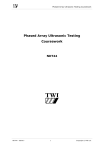 Phased Array Ultrasonic Testing Coursework Phased Array Ultrasonic Testing Coursework NDT44 NDT44 - 020417 1 Copyright © TWI Ltd. PAUT Coursework 1 PAUT Coursework 1 1 An ultrasonic longitudinal wave travels in aluminium with a velocity of 635,000 cm/sec and has a frequency of 2 megahertz. The wavelength of this ultrasonic wave is: a b c d 6.35 1.33 6.35 3.17 feet mm mm mm 2 The velocity of sound waves is primarily dependent on : a b c d The pulse length The frequency of the probe The material in which the sound is being transmitted and the mode of vibration None of the above 3 Angle beam transducers are used to: a b c d Locate and evaluate discontinuities lying parallel to the surface of the test specimen Locate and evaluate discontinuities that lie parallel to the sound beam Detect discontinuities that are at 90 degrees to the sound beam Detect discontinuities in immersion testing. 4 The process of comparing an instrument or device with a standard is called: a b c d Angulation Calibration Attenuation Correlation 5 Another name for a compression wave is: a b c d Lamb wave Shear wave Longitudinal wave Transverse wave 6 A second name for Rayleigh waves is: a b c d Shear waves Longitudinal waves Transverse waves Surface waves 7 A material used between the face of a search unit and the test surface to permit or improve the transmission of ultrasonic vibrations from the search unit to the material being tested is called: a b c d A wetting agent A couplant An acoustic transmitter A lubricant NDT44 - 020417 2 Copyright © TWI Ltd. PAUT Coursework 1 8 The piezoelectric material in a probe, which vibrates to produce ultrasonic waves, is called: a b c d A A A A backing material lucite wedge transducer element or crystal couplant 9 Ultrasonic testing of a material where the probe is in direct contact with the material being tested is: a b c d Compression wave testing Surface wave testing Angle beam testing All of the above could be performed by contact scanning 10 An advantage of using lithium sulphate in search units is that a b c d It It It It is one of the most efficient generators of ultrasonic energy is one of the most efficient receivers of ultrasonic energy is soluble can withstand high temperatures 11 The probe shown in Figure 1 is used for a b c d Surface wave testing Angle beam testing Immersion testing Straight beam testing Figure 1 12 Which of the following search units would contain the thinnest transducer element a b c d A A A A 1-megahertz search unit 5-megahertz search unit 15-megahertz search unit 25-megahertz search unit NDT44 - 020417 3 Copyright © TWI Ltd. PAUT Coursework 1 13 Snell’s law can be used to calculate a b c d Refracted angles Acoustic impedance Frequency All of the above 14 Surface waves can be used to detect defects located a b c d Close to or at the surface 1 wavelength below the surface 3 wavelengths below the surface At radii 15 When an ultrasonic beam passes through the interface of two dissimilar metals with different velocities at an angle other than 90 degrees, a new angle of sound travel takes place in the second material due to: a b c d Attenuation Rarefaction Compression Refraction 16 Figure 2 illustrates a contact test on an 80mm aluminium block, using a single crystal 0º compression probe with a calibrated range of 200 mm. A discontinuity is located 60 mm from the front surface and the screen representation for this is shown below. What does indication A represent? a b c d Initial pulse First discontinuity indication First back surface reflection Mode conversion Figure 2 17 What does indication B represent in Figure 2? a b c d Front surface indication First discontinuity indication First back wall reflection None of these NDT44 - 020417 4 Copyright © TWI Ltd. PAUT Coursework 1 18 What does indication C represent in Figure 2? a b c d Second back surface reflection First discontinuity indication Second discontinuity indication First back wall reflection 19 What does indication D represent in Figure 2? a b c d First discontinuity indication Second indication of the discontinuity First back surface reflection Second back surface reflection 20 What does indication E represent in Figure 2? a b c d First discontinuity indication Second discontinuity indication First back wall reflection Second back wall reflection 21 Most commercial ultrasonic testing is accomplished using frequencies between a b c d 1 and 25 Kilohertz 0.2 and 20 megahertz 1 and 1,000 kilohertz 15 and 100 megahertz 22 For any given elastic solid which of the following modes of vibration has the greatest velocity? a b c d Shear wave Transverse wave Surface wave Longitudinal wave 23 Sound waves of a frequency beyond the hearing range of the human ear are referred to as “ultrasonic”. The highest frequency audible to the human ear is about: a b c d 20,000 hertz 2 megahertz 2 kilohertz 200 kilohertz 24 In an A-scan presentation, the horizontal base line represents the: a b c d Amount of reflected ultrasonic sound energy Distance travelled by the search unit Elapsed time or distance none of the above 25 In an A-scan presentation, the amplitude or height of vertical indications on the screen represents: a b c d the the the the amount of ultrasonic sound energy returning to the search unit distance travelled by the search unit thickness of material being treated elapsed time since the ultrasonic pulse was generated NDT44 - 020417 5 Copyright © TWI Ltd. PAUT Coursework 2 PAUT Coursework 2 The following questions are related to chapter 1 1 Who is generally given credit for the first ultrasonic phased array system? a b c d Huygens Jan Somer Kelvin Hughes 2 When using phased array ultrasonics, off-axis beam “artefacts” are a result of: a b c d destructive interference grating lobes non-uniform voltages applied to separate elements inclusions in the delay wedge 3 In addition to eliminating “ghost images”, eliminating grating lobes also improves _________? a b c d the signal-to-noise rati