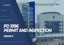 JHON LOUIE FELL CAHINTONG ANGELY CABANA JULY ROLAND CABRISOS ASHLEY GAYLLE BRETANIA KENT CALAGSING NATHANIEL CALIPAYAN P.D. 1096 SECTION 301. Building Permits SECTION 302. Application for Permits SECTION 303. Processing of Building Permits SECTION 304. Issuance of Building Permits SECTION 305. Validity of Building Permits SECTION 306. Non-issuance, Suspension, or Revocation SECTION 307. Appeal SECTION 308. Inspection and Supervision of Work SECTION 309. Certificate of Occupancy Presidential Decree 1096, popularly known as the National Building Code of the Philippines, was issued on February 19, 1977 and signed by the late former president Ferdinand Marcos Sr. Revision of Republic Act No. 6541 "An Act to Ordain and Institute a National Building Code of the Philippines". Section 301. Building Permits 301.1 No person, firm or corporation, including any agency or instrumentality of the government shall erect, construct, alter, repair, move, convert or demolish any building or structure without first obtaining a building permit therefor from the Building Official assigned in the place where the subject building is located or the building work is to be done. The prescribed application for building permit form (NBC Form B-01) shall be used by all applicants. 301.2 Permits supplementary to a Building Permit shall be applied for and issued by the Building Official. These include Ancillary and Accessory Permits. Section 301. Building Permits NBC Form B-01 Ancillary Permits: i. Architectural Permit ii. Civil/Structural Permit iii. Electrical Permit iv. Mechanical Permit v. Sanitary Permit vi. Plumbing Permit vii. Electronics Permit The permits can be downloaded at cagayandeoro.gov.ph Section 301. Building Permits 301.3 Exemption from Building Permits a. Minor Constructions sheds, outhouses, and the like not exceeding 6.00 sq.m., completely detached, and intended for private use of owner only addition of open terraces or patios directly on ground not exceeding 20.00 sq.m. and for private use only installation of window grills garden pools for water plants and/or aquarium not exceeding 500 mm in depth garden masonry walls not exceeding 1.20m high, footpaths, garden walks b. Repair Works works not affecting any structural member (roofing sheets, gutters, ceilings, etc.) of non-load-bearing partition walls, interior portions, doors and windows, flooring, perimeter fence and walls of plumbing fixtures, fittings or pipings for single detached dwellings and duplexes Section 302. Application for Permits 302.1 Any person desiring to obtain a building permit and any ancillary/accessory permit/s together with a Building Permit shall file application/s therefor on the prescribed application forms. 302.2 Together with the accomplished prescribed application form/s, the following shall be submitted to the OBO: a. In case the applicant is the registered owner of the lot: i. Certified true copy of OCT/TCT, ii. Tax Declaration, and iii. Current Real Property Tax Receipt. Section 302. Application for Permits OCT TCT Tax Declaration of Real Property Section 302. Application for Permits b. In case the applicant is not the registered owner of the lot, in addition to the above; duly notarized copy of the Contract of Lease, or Deed of Absolute Sale. Section 302. Application for Permits 302.3 Five (5) sets of survey plans, design plans, specifications and other documents prepared, signed and sealed over the printed names of the duly licensed and registered professionals. a. Geodetic Engineer b. Architect c. Civil Engineer d. Electrical Engineer e. Mechanical Engineer f. Sanitary Engineer g. Master Plumber h. Electronics Engineer Section 302. Application for Permits 302.12 Whenever necessary, written clearances shall be obtained from the various authorities exercising and enforcing regulatory functions affecting buildings/structures. i. Department of Public Works and Highways (DPWH) xi. Department of Health (DOH) ii. Air Transportation Office (ATO) xii. Philippine Institute of Volcanology and Seismology (PHIVOLCS) iii. Housing and Land Use Regulatory Board (HLURB) xiii. Laguna Lake Development Authority (LLDA) iv. Local Government Unit (LGU) xiv. Manila Waterworks and Sewerage System (MWSS) v. Department of Tourism (DOT) xv. National Water Resources Board (NWRB) vi. Department of Environment and Natural Resources (DENR) xvi. Department of Agrarian Reform (DAR) vii. Department of Transportation and Communication (DOTC) xvii. Department of Agriculture (DA) viii. Department of Interior and Local Government (DILG) xviii. Department of Labor and Employment (DOLE) ix. Philippine Ports Authority (PPA) xix. National Housing Authority (NHA) x. Department of Education (DepEd) xx. National Council for the Welfare of Disabled Persons (NCWDP) Section 302. Application for Permits IN SUMMARY: FULLY FILLED OUT: NBC Form B-01 If owner of land: 5 sets of Plans duly signed Original Certificate of Title by the corresponding Transfer Certificate of Title professionals Tax Declaration Ancillary Permits: i. Architectural Permit ii. Civil/Structural Permit If not the owner of land: iii. Electrical Permit Contract of lease iv. Mechanical Permit Deed of Absolute Sale v. Sanitary Permit vi. Plumbing Permit vii. Electronics Permit Needs to be duly Notarized Clearances from other Agencies SECTION 303. PROCESSING OF BUILDING PERMITS CABANA, ANGELY M. Section 303. Processing of Building Permits The processing of building permits shall be under the overall administrative control and supervision of the Building Official and his technical staff of qualified professionals. In processing an application for a building permit, the Building Official shall see to it that the applicant satisfies and conforms with approved standard requirements on zonings and land use, lines and grades, structural design, sanitary and sewerage, environmental health, electrical and mechanical safety as well as with other rules and regulations promulgated in accordance with the prov
