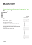 Cambridge Lower Secondary Progression Test * 9 8 5 4 4 1 8 5 2 6 * Science paper 2 Stage 9 45 minutes For Teacher’s Use Name ………………………………………………….………………………. Additional materials: Calculator Ruler READ THESE INSTRUCTIONS FIRST Answer all questions in the spaces provided on the question paper. You should show all your working on the question paper. The number of marks is given in brackets [ ] at the end of each question or part question. Page 1 2 3 4 5 6 7 8 The total number of marks for this paper is 50. 9 10 11 12 13 14 15 16 Total SCIENCE_S9_02_8RP © UCLES 2018 Mark 2 1 To grow well, plants need to absorb minerals from the soil. For Teacher’s Use These minerals contain chemical elements. (a) Most soils have a pH between 4 and 8.5. The diagram shows how pH affects the amount of iron in the soil. amount of iron in the soil iron 4 5 6 7 8 pH of soil The diagram shows that between pH 4 and 6.7 the soil contains the greatest amount of iron. Above pH 6.7 the amount of iron decreases. The diagram below shows how pH affects the amount of other elements in the soil. nitrogen phosphorus amount of element in the soil potassium magnesium 4 5 6 7 8 pH of soil (i) Use the information in the diagram to answer the questions. Explain why plants grow well at pH 7. .................................................................................................................................. Explain why plants do not grow well at pH 4. .................................................................................................................................. [2] © UCLES 2018 S/S9/02 3 (ii) Which element is in least amount when the soil pH is greater than 7? For Teacher’s Use Choose from iron nitrogen phosphorus potassium magnesium answer ...................................................................................................................[1] (b) The soil can be improved by adding decayed plant material or animal waste. (i) Which group of organisms cause decay? ..............................................................................................................................[1] (ii) Explain why adding decayed plant material or animal waste improves soil. ..............................................................................................................................[1] 2 Forces can make objects turn. distance 1 distance 2 A force 1 force 2 Complete the sentences. The part labelled A in the diagram is the .................................................. . Look at the formula. Z = force × distance Z is called a .................................................. . © UCLES 2018 S/S9/02 [2] [Turn over 4 3 A teacher shows his students the reactions of some metals with water. For Teacher’s Use He starts by adding small amounts of some metals to a bowl containing water. The table shows the observations his students make. metal chemical symbol observation lithium Li fizzes slowly sodium Na fizzes quickly potassium K fizzes very quickly and bursts into flames (a) When the teacher does the experiment he needs to keep himself and his students safe. Write down one way he could do this. ......................................................................................................................................[1] (b) A gas is made when these metals react with water. What is the name of this gas? Circle the correct answer. carbon dioxide hydrogen nitrogen oxygen [1] (c) All the metals the teacher uses are in Group 1 of the Periodic Table. (i) Which of the three metals is the most reactive? ..............................................................................................................................[1] (ii) Rubidium is also in Group 1. It is beneath potassium in the Periodic Table. Predict what happens when rubidium is added to water. ..............................................................................................................................[1] © UCLES 2018 S/S9/02 5 4 Many computers and mobile phones have touch screens. For Teacher’s Use Touch screens work using electric charge. digital sensor charge on plate touch screen Put these statements in the correct order. Use numbers 1, 2, 3, 4 and 5. One has been done for you. statement order the touch screen pushes onto the plate behind the charge on this part of the plate changes you choose the letter you want on the phone 1 the change in charge is detected by the digital sensor you touch the screen with your finger [1] © UCLES 2018 S/S9/02 [Turn over 6 5 Charles Darwin is famous for his theory of natural selection. For Teacher’s Use He developed this theory by making observations and drawing conclusions. Draw a line from each observation to the correct conclusion. observation conclusion Offspring of a species have small differences. The small differences make some offspring better adapted than others. Over time the population of a species stays roughly the same. The small differences are inherited. The small differences can be seen in the parent and the offspring. Darwin called this evolution. Over time, the appearance of a species changes. The weakest die and the best adapted survive. [2] © UCLES 2018 S/S9/02 7 6 The timeline shows when some scientists made suggestions about the structure of the atom. .. Dalton Rutherford Schrodinger / Heisenburg 1803 1910 1926 400 BC 1904 1913 Democritus JJ Thomson Bohr For Teacher’s Use not to scale (a) Rutherford was the first scientist to suggest the modern day model of an atom. (i) The idea of elements being made of atoms was also suggested by a scientist just over 100 years before Rutherford’s suggestion. Use the timeline to name this scientist. ..............................................................................................................................[1] (ii) The atomic model made famous by JJ Thomson in 1904 was called the plum pudding model. Rutherf