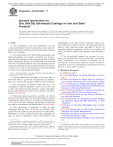 This international standard was developed in accordance with internationally recognized principles on standardization established in the Decision on Principles for the Development of International Standards, Guides and Recommendations issued by the World Trade Organization Technical Barriers to Trade (TBT) Committee. Designation: A123/A123M − 17 Standard Specification for Zinc (Hot-Dip Galvanized) Coatings on Iron and Steel Products1 This standard is issued under the fixed designation A123/A123M; the number immediately following the designation indicates the year of original adoption or, in the case of revision, the year of last revision. A number in parentheses indicates the year of last reapproval. A superscript epsilon (´) indicates an editorial change since the last revision or reapproval. This standard has been approved for use by agencies of the U.S. Department of Defense. independently of the other without combining values in any way. In the case of orders in SI units, all testing and inspection shall be done using the metric equivalent of the test or inspection method as appropriate. In the case of orders in SI units, such shall be stated to the galvanizer when the order is placed. 1.7 This international standard was developed in accordance with internationally recognized principles on standardization established in the Decision on Principles for the Development of International Standards, Guides and Recommendations issued by the World Trade Organization Technical Barriers to Trade (TBT) Committee. 1. Scope* 1.1 This specification covers the requirements for zinc coating (galvanizing) by the hot-dip process on iron and steel products made from rolled pressed and forged shapes, castings, plates, bars, and strips. 1.2 This specification covers both unfabricated products and fabricated products, for example, assembled steel products, structural steel fabrications, large tubes already bent or welded before galvanizing, and wire work fabricated from uncoated steel wire. This specification also covers steel forgings and iron castings incorporated into pieces fabricated before galvanizing or which are too large to be centrifuged (or otherwise handled to remove excess galvanizing bath metal). 2. Referenced Documents 2.1 ASTM Standards:2 A47/A47M Specification for Ferritic Malleable Iron Castings A90/A90M Test Method for Weight [Mass] of Coating on Iron and Steel Articles with Zinc or Zinc-Alloy Coatings A143/A143M Practice for Safeguarding Against Embrittlement of Hot-Dip Galvanized Structural Steel Products and Procedure for Detecting Embrittlement A1094/A1094M Specification for Continuous Hot-Dip Galvanized Steel Bars for Concrete Reinforcement A153/A153M Specification for Zinc Coating (Hot-Dip) on Iron and Steel Hardware A384/A384M Practice for Safeguarding Against Warpage and Distortion During Hot-Dip Galvanizing of Steel Assemblies A385 Practice for Providing High-Quality Zinc Coatings (Hot-Dip) A767/A767M Specification for Zinc-Coated (Galvanized) Steel Bars for Concrete Reinforcement A780 Practice for Repair of Damaged and Uncoated Areas of Hot-Dip Galvanized Coatings A902 Terminology Relating to Metallic Coated Steel Products NOTE 1—This specification covers those products previously addressed in Specifications A123-78 and A386-78. 1.3 This specification does not apply to wire, pipe, tube, or steel sheet which is galvanized on specialized or continuous lines, or to steel less than 22 gage (0.0299 in.) [0.76 mm] thick. 1.4 The galvanizing of hardware items that are to be centrifuged or otherwise handled to remove excess zinc (such as bolts and similar threaded fasteners, castings and rolled, pressed and forged items) shall be in accordance with Specification A153/A153M. 1.5 Fabricated reinforcing steel bar assemblies are covered by the present specification. The batch galvanizing of separate reinforcing steel bars shall be in accordance with Specification A767/A767M and the continuous galvanizing of reinforcing bars shall be in accordance with Specification A1094/A1094M. 1.6 This specification is applicable to orders in either inch-pound units (as A123) or SI units (as A123M). Inchpound units and SI units are not necessarily exact equivalents. Within the text of this specification and where appropriate, SI units are shown in parentheses. Each system shall be used 1 This specification is under the jurisdiction of ASTM Committee A05 on Metallic-Coated Iron and Steel Products and is the direct responsibility of Subcommittee A05.13 on Structural Shapes and Hardware Specifications. Current edition approved Sept. 1, 2017. Published September 2017. Originally approved in 1928. Last previous edition approved in 2015 as A123/A123M - 15. DOI: 10.1520/A0123_A0123M-17. 2 For referenced ASTM standards, visit the ASTM website, www.astm.org, or contact ASTM Customer Service at service@astm.org. For Annual Book of ASTM Standards volume information, refer to the standard’s Document Summary page on the ASTM website. *A Summary of Changes section appears at the end of this standard Copyright © ASTM International, 100 Barr Harbor Drive, PO Box C700, West Conshohocken, PA 19428-2959. United States 1 &RS\ULJKWE\$670,QW O DOOULJKWVUHVHUYHG 0RQ-XQ*07 'RZQORDGHGSULQWHGE\ .LQJ$EGXOODK8QLYHUVLW\RI6FLHQFHDQG7HFKQRORJ\SXUVXDQWWR/LFHQVH$JUHHPHQW1RIXUWKHUUHSURGXFWLRQVDXWKRUL]HG A123/A123M − 17 3.2.6 multi-specimen article, n—a unit of product whose surface area is greater than 160 in.2 [100 000 mm2]. For thickness testing purposes, articles whose surface area is greater than 160 in.2 are subdivided into three continuous local sections, nominally equal in surface area, each of which constitutes a specimen. In the case of any such local section containing more than one material category or steel thickness range as delineated in Table 1, that section will contain more than one specimen (see Fig. 1). B6 Specification for Zinc B487 Test Method for Measurement of Metal and Oxide Coating Thickness by Micro