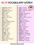 IELTS VOCABULARY WORDS Intellectual ~ Mental Dawn ~ sun rise Uncommon ~ Unusual Sincere ~ Honest Mild ~ Gentle Close ~ Shut Timid ~ nervous Before ~ prior, earlier Hint ~ Tip Guilt ~ regret Awful ~ dreadful, atrocious Accurate ~ correct Misery ~ Distress False ~ Untrue Exit ~ Leave Approve ~ accept Sack ~ big bag New ~ Recent Garbage ~ Trash Fortunate ~ Lucky Counsel ~ advise Weak ~ Feeble Hire ~ to recruit Daring ~ bold, audacious Brave ~ Bold Quake ~ Tremble Funny ~ Amusing Deter ~ hinder, prevent Hurry ~ Rush Epitome ~ best possible Beautiful ~ Pretty Fragile ~ week Diverse ~ different, distinct Big ~ Large Vague ~ Indistinct Important ~ Significant Ignore ~ Snub Tall ~ high, lofty Safe ~ Secure Liable ~ responsible Bizarre ~ Weird Intend ~ Mean Deliberate ~ Planned Alteration ~ change Significant ~ Meaningful Defend ~ protect, shield Vibes ~ signals Temporary ~ Transitory Sacked ~ to throw out Mesmerize ~ hypnotize WWW.ENGDIC.ORG IELTS VOCABULARY WORDS Trustworthy ~ Reliable Exemplary ~ extra ordinary Encourage ~ promote, support Anxious ~ nervous Adversity ~ difficulty Sure ~ Certain Future ~ coming, tomorrow Fire ~ to throw out of job Destiny ~ Fate Calamity ~ Disaster Violent ~ forceful Symbolize ~ Represent Posture ~ way/position of body Infuriate ~ enrage, agitate Finish ~ Complete Real ~ Genuine Desperate ~ fanatic/extremist Delicate ~ fragile, dainty Compress ~ to press Reluctant ~ hesitant Freak ~ insane Baby ~ Infant Amiable ~ friendly Push ~ shove, propel Murals ~ huge paintings Maybe ~ Perhaps Invade ~ attack Center ~ Middle Pluck ~ to break something Keep ~ save, protect, guard Far flung ~ very far away Viable/feasible ~ possible Sleepy ~ Drowsy Eternal ~ never ending Chaos ~ noisy situation Mentor ~ guide Handsome ~ Good Looking Contrary ~ opposite Away ~ Absent Vary ~ Differ Eager ~ Keen Assets ~ earnings Amateur ~ beginner Outgoing ~ Friendly Famous ~ Renowned Exempt ~ except that Taut ~ tense, tight, stiff Complete ~ Total Dull ~ blunt, dreary Crazy ~ insane, daft, mad WWW.ENGDIC.ORG IELTS VOCABULARY WORDS Want ~ Desire Raise ~ Lift Robust ~ strong Glossy ~ shiny Belly ~ Stomach Ill ~ Sick Defy ~ resist, challenge Arrive ~ reach Shiver ~ tremble Oversee ~ Supervise Hazard ~ Danger Grumble ~ Grouse Waiver ~ to cut off Tender ~ soft Moist ~ wet Flaw ~ mistake Prodding ~ encourage Chubby ~ plump, pudgy Candy ~ Sweets Becoming ~ Fitting Ambition ~ dreams Rude ~ Impolite Collect ~ Gather Antique ~ old item Active ~ energetic Numerous ~ Many Try ~ Attempt Old ~ Mature Abroad ~ Overseas Trivial ~ unimportant Talk ~ Speak Perception ~ Insight Ornament ~ Decoration Steady ~ Firm Minnow/Nano ~ very small Extra ~ Additional Emphatically ~ forcefully Sustain ~ to remain Slim ~ Sender Ethical ~ genuine Descendent ~ next generation Roster ~ schedule Immaculate ~ spotless, pure Fluke ~ bi-chance Bias ~ Revoke Believe ~ trust, accept Tiny ~ Small Mad ~ Crazy Incarnation ~ birth Candid ~ straight forward WWW.ENGDIC.ORG IELTS VOCABULARY WORDS Chiefly ~ Mainly Informal ~ Casual Imitate ~ Mimic Enquire ~ Investigate Sorrow ~ woe, anguish, grief Instructions ~ Directions Evaluate ~ Assess Subtle ~ little Listen ~ Hear Learn ~ Memorize Fill ~ load, pack Disagree ~ differ, dispute Imitate ~ to copy Envisage ~ imagine it’s true Rich ~ Wealthy Glimpse ~ a brief look Agree ~ Consent Glitter ~ Sparkle Fun -Entertaining~ Begin ~ Commence Angry ~ Mad Stoic ~ patient Make ~ Build Intimate ~ inform Evil ~ Bad Comical ~ amusing, funny Under ~ Below Miniature ~ very small Inspect ~ Examine Correct ~ accurate, right Tavern ~ pub Innocent ~ Harmless Immediate ~ Instantly Particular ~ Specific Overlook ~ Miss Joy ~ Delight Inventory ~ Stock Blend ~ combine, mix Verdict ~ result Kind ~ Benevolent Allure ~ attract Uncooked ~ Raw Souvenir ~ memento Drab ~ dull Reliant ~ dependent Ort ~ used Fair ~ Unbiased Exaggerate ~ over pound Change ~ Transform Modern ~ Contemporary WWW.ENGDIC.ORG IELTS VOCABULARY WORDS Berserk ~ gone mad Vanquish ~ Conquer Inferior ~ lesser, substandard Dusk ~ sun set Bottom ~ base, foundation Provide ~ Supply Lethargic ~ weak Blossom ~ to grow Resilient ~ to resist Nice ~ Pleasant High ~ elevated, lofty Get ~ Receive Annoy ~ to disturb someone Use ~ Utilize Rock ~ Stone Contemporary ~ modern Blunder ~ a very big mistake Spill ~ for liquid Skeptical ~ doubtful Maintain ~ Preserve Elite ~ most talented Necessary ~ Essential Innocent ~ guiltless, blameless Divide ~ separate, split Agility ~ quickness Victory ~ triumph, win, success Noon ~ Midday Curb ~ to control See ~ Look Considerate ~ Thoughtful Coarse ~ bumpy, rough Answer ~ Response Stiff ~ firm/hard Exactly ~ Precisely Lethal ~ Deadly Detain ~ punishment Cunning ~ Clever Hop ~ to jump a bit Break ~ fracture, burst Inconsiderate ~ Thoughtless Fuddy-duddy ~ old fashioned Obey ~ mind, heed, comply Cranky ~ cross, irritable Collision ~ collide Brief ~ short, concise Identical ~ alike, duplicate Eye opener ~ show reality Enormous ~ Huge Dispute ~ debate, oppose Attire ~ Dress WWW.ENGDIC.ORG IELTS VOCABULARY WORDS Temper ~ mental state Prevail ~ which remains Formerly ~ Previously Flippant ~ excess talkative Courage ~ bravery, valor Gaunt ~ scrawny, skinny, thin Fate ~ destiny Curse ~ to bane someone Cruel ~ mean, heartless Admit ~ Confess Premises ~ area Dumb ~ stupid, dense Dubious ~ doubtful Broad ~ Wide Always ~ forever Inevitable ~ unstoppable Happily ~ Fortunately Enlarge ~ expand, magnify Despise ~ hate, detest, loathe Receive ~ Get Ratify ~ approve, confirm Interesting ~ provocative Confuse ~ Mixed Up Choosy ~ picky Serious ~ grave, solemn Scared ~ Afraid Fatal ~ deadly, mortal, killing Confine ~ Restrict Shrine ~ holy place Overturned ~ upside down Help ~ Assist Usually ~ Generally Small ~ little, insignificant Jubilant ~ overjoyed, delighted Hallucination ~ mirage Delicate ~ Fragile Renew ~ Resume Obsolete ~ extinct, dated Aggressive ~ assertive Achieve ~ accomplish Wardrobe ~ cupboard Part ~ Section Jolly ~ merry, jovial, j
