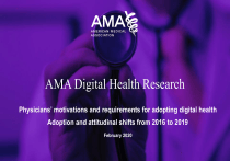 AMA Digital Health Research Physicians’ motivations and requirements for adopting digital health Adoption and attitudinal shifts from 2016 to 2019 February 2020 1 Background and Objectives • In July 2016 The American Medical Association conducted a comprehensive study of physician’s motivations and requirements for the adoption of digital clinical tools. • The AMA repeated the study to determine the degree to which adoption has occurred in the past 3 years and identify attitudinal shifts among physicians towards their use and adoption. • The goals for this research were to update the 2016 study to determine: 2 1. Any change in overall interest in digital health tools and the degree to which physicians believe they will help or hinder their patient care 2. Current familiarity with 7 specific digital health tools and physician enthusiasm, belief in the relevance to their practice, timeline for incorporating or current use 3. For each tool, the motivators and level of disruption caused or foreseen 4. The ideal level of involvement physicians would like to have in adoption decisions 5. An understanding of enthusiasm, current usage and requirements for emerging technologies © 2020 American Medical Association. All rights reserved. Methodology • This survey was designed to replicate the 2016 survey exactly, to have a statistically valid and reliable comparative sample. • The same physician panel was used as in 2016, provided by WebMD. • The 2019 survey was slightly longer at 18 rather than the original 15 minutes, but new questions were added at the back of the survey to not interfere with the flow of the original questionnaire. • The basic 2016 survey was followed exactly in wording and question order, with only a few variations, to remove some small questions that were no longer relevant. • The sample used careful quotas to ensure a similar sample composition as in 2016. 3 Total PCPs Specialists Solo Practice Group Practice Other 2016 1300 650 650 196 879 225 2019 1359 672 687 155 829 375 © 2020 American Medical Association. All rights reserved. Survey Instrument Digital healthcare: Digital health encompasses a broad scope of tools that engage patients for clinical purposes; collect, organize, interpret and use clinical data; and manage outcomes and other measures of care quality. This includes, but is not limited to, digital solutions involving telemedicine and telehealth, mobile health (mHealth), wearables (Fitbit), remote monitoring, apps and others. 7 Specific Tools Remote monitoring for efficiency Remote monitoring and management for improved care Clinical decision support Tele-visits/ virtual visits Point of care/ Workflow enhancement Consumer access to clinical data Questions Overall Involvement in Digital Health • • • Impact of ability to provide care Overall motivators/attractants Overall functional requirements Specific digital tools • • • • • • 4 Familiarity Current use Relevance for practice Enthusiasm Timeline for incorporating into practice Ideal level of involvement in Digital Health in general © 2020 American Medical Association. All rights reserved. Individual tool deep dives (Ask for up to two relevant solutions, not currently being used) • Overall motivators/attractants towards solution • Rank of top 3 motivators/attractants • Overall functional requirements of solution adoption • Rank of top 3 functional requirements • Level of disruption caused by solution • Ideal level of involvement with decision to incorporate solutions Patient engagement WebMD recruited a sample of 1,300 practicing US physicians Requirements for participation: • Age 28-65 • Practicing physicians including those focused on research, academia or public health • Full-owner, part-owner or employee of a practice (not an independent contractor) • Provide a minimum of 20 hours of direct patient care each week Key definitions in the study 5 • Digital health encompasses a broad scope of tools that engage patients for clinical purposes; collect, organize, interpret and use clinical data; and manage outcomes and other measures of care quality. This includes, but is not limited to, digital solutions involving telemedicine and telehealth, mobile health (mHealth), wearables (e.g., Fitbit), remote monitoring, apps, and others. • Seven specific tools: Remote monitoring for efficiency Smart versions of common clinical devices such as thermometers, blood pressure cuffs, and scales that automatically record readings in the patient record so you do not have to type it Remote monitoring and management for improved care Apps and devices for use by chronic disease patients for daily measurement of vital signs such as weight, blood pressure, blood glucose, etc. Readings are visible to patients and transmitted to the physician's office. Alerts are generated as appropriate for missing or out of range readings Clinical decision support Modules used in conjunction with the EHR or apps that integrate with the EHR that highlight potentially significant changes in patient data (e.g., gain or loss of weight, change in blood chemistry) Patient engagement Solutions to promote patient wellness and active participation in their care for chronic diseases (e.g., adherence to treatment regimens) Tele-visits/ virtual visits An audio/video connection used to see patients remotely (i.e., simple acute illness, adjusting therapy, etc.) Point of care/ workflow enhancement Communication and sharing of electronic clinical data to consult with specialists, make referrals and/or transitions of care Consumer access to clinical data Secure access allowing patients to view clinical information such as routine lab results, receive appointment reminders and treatment prompts, and to ask for prescription refills, appointments and to speak with their physician © 2020 American Medical Association. All rights reserved. Summary: Changes from 2016 1 • • Growth in those that see an advantage