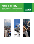 Value-to-Society Measurement and monetary valuation of BASF’s impacts in society 1 BASF Value-to-Society Version 2.0 December 2018 Motivation Based on our company purpose “We create chemistry for a sustainable future”, we strive to improve our positive contribution to society and minimize our negative effects. “BASF’s Value-to-Society” is a cornerstone of our efforts to identify, quantify, value, and demonstrate our economic, social, and environmental impacts. With the Value-to-Society approach, we are entering a new area of performance measurement that goes beyond established qualitative and quantitative assessments. For the first time, we measure and value the financial and non-financial external effects of our business activities in society in a common unit – the euro. The results reflect our ‘real’ value contribution to human well-being through our benefits and costs to society; e.g. the societal costs of carbon emissions. Through BASF’s Valueto-Society we assess our relevant impacts along our entire supply chain, our own operations, and our customer industries. It was tested at the corporate level, for business units, for projects and strategic decisions, and at product level. We designed Value-to-Society to be a pragmatic, scalable, transferable and auditable model. Our holistic approach provides the following benefits: Perspective change: Offering a macro-societal view on the performance of the company Transparency: Mapping our own impacts and our partners along the value chain Materiality: Comparing financial and non-financial impacts in a monetary business language Interdependencies: Better understanding of the correlations between the different capitals Tangibility: Demonstrating non-financial impacts in monetary terms to improve communication We want to share our experience and learnings with our external partners and stakeholders to contribute to the continued standardization and operationalization of impact valuation. We recognize that impact valuation is still an evolving field. However, we feel that we have reached a level of maturity at which the outputs from such analyses provide valuable insights to inform communications, reporting, progress monitoring, materiality analyses, risk management, and business decisionmaking. 2 BASF Value-to-Society Version 2.0 December 2018 Table of Contents 1. Introduction.......................................................................................................... p.3 2. Principles……………………………………………………………………………….. p.3 3. Scope.................................................................................................................... p.4 3.1 Value chain coverage................................................................................... p.4 3.2 Impact categories......................................................................................... p.5 4. BASF’s Value-to-Society – Results at corporate level..................................... p.6 5. Overview of data and methodologies (corporate level)……………………….. p.6 5.1 BASF’s own operations............................................................................... p.7 5.2 Supplier and customer pathways.............................................................. p.7 5.3 Valuation techniques.................................................................................. p.9 5.4 Mitigating distortive effects....................................................................... p.12 6. Summary and application fields....................................................................... p.13 Disclaimer………………………………………………………………………………… p.14 Feedback by our stakeholders………………………………………………………... p.15 Annex 1 – Impact pathways................................................................................... p.16 Annex 2 – Key methodological considerations................................................... p.25 Annex 3 – Social impact valuation………...…………………………………………. p.26 Annex 4 – Valuation coefficients (excerpt)…………………………………………. p.28 Annex 5 – Assurance Report of the Independent Auditor………………………. p.29 3 BASF Value-to-Society Version 2.0 December 2018 1. Introduction This paper is intended for impact valuation program managers, sustainability leaders and stakeholder with interest in impact measurement and valuation. We aim to provide a strategic summary of our Value-to-Society approach and the benefits that it has brought to our business, as well as some of the key challenges that we have faced along the way. We hope this will stimulate, support and guide others to further elaborate the benefits of impact valuation for their business. BASF’s Value-to-Society was developed together with PwC Germany and PwC U.K. (PwC). It builds on key aspects of PwC’s Total Impact Management and Measurement (TIMM) approach. This paper aims to summarize all important technical information of our Value-to-Society approach in a clear and concise manner. Areas where the TIMM methodologies have been substantially developed further and successfully piloted are explained in more detail, such as the assessment of customer industries (chapter 5.2) and the mitigation of distortive effects (chapter 5.4). However, it is not intended as a detailed technical discussion of our approach, and readers with a technical or academic background may wish to contact us for more information. Rather, we aim to provide a summary of our approach for others to reflect on and to stimulate further advancements in this field in the future. 2. Principles The Value-to-Society approach is oriented towards the following quality criteria, based on the GRI Sustainability Reporting Standards 1 and the Natural Capita