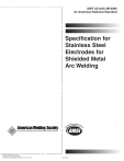 AWS A5.4/A5.4M:2006 An American National Standard --`,,```,,,,````-`-`,,`,,`,`,,`--- Specification for Stainless Steel Electrodes for Shielded Metal Arc Welding Copyright American Welding Society Provided by IHS under license with AWS No reproduction or networking permitted without license from IHS Not for Resale AWS A5.4/A5.4M:2006 An American National Standard Key Words —Shielded metal arc welding, stainless electrodes, classification, classification tests, electrode identification, electrode packaging, stainless weld metal compositions, welding Approved by the American National Standards Institute March 21, 2006 Specification for Stainless Steel Electrodes for Shielded Metal Arc Welding Supersedes ANSI/AWS A5.4-92 Prepared by the American Welding Society (AWS) A5 Committee on Filler Metals and Allied Materials Under the Direction of the AWS Technical Activities Committee Approved by the AWS Board of Directors --`,,```,,,,````-`-`,,`,,`,`,,`--- Abstract Composition and other requirements are specified for more than forty classifications of covered stainless steel welding electrodes. The requirements include general requirements, testing, and packaging. Annex A provides application guidelines and other useful information about the electrodes. This specification makes use of both U.S. Customary Units and the International System of Units [SI]. Since these are not equivalent, each system must be used independently of the other. 550 N.W. LeJeune Road, Miami, FL 33126 Copyright American Welding Society Provided by IHS under license with AWS No reproduction or networking permitted without license from IHS Not for Resale AWS A5.4/A5.4M:2006 --`,,```,,,,````-`-`,,`,,`,`,,`--- International Standard Book Number: 0-87171-041-2 American Welding Society 550 N.W. LeJeune Road, Miami, FL 33126 © 2006 by American Welding Society All rights reserved Printed in the United States of America Photocopy Rights. No portion of this standard may be reproduced, stored in a retrieval system, or transmitted in any form, including mechanical, photocopying, recording, or otherwise, without the prior written permission of the copyright owner. Authorization to photocopy items for internal, personal, or educational classroom use only or the internal, personal, or educational classroom use only of specific clients is granted by the American Welding Society provided that the appropriate fee is paid to the Copyright Clearance Center, 222 Rosewood Drive, Danvers, MA 01923, tel: (978) 750-8400; Internet: <www.copyright.com>. ii Copyright American Welding Society Provided by IHS under license with AWS No reproduction or networking permitted without license from IHS Not for Resale AWS A5.4/A5.4M:2006 Statement on the Use of American Welding Society Standards All standards (codes, specifications, recommended practices, methods, classifications, and guides) of the American Welding Society (AWS) are voluntary consensus standards that have been developed in accordance with the rules of the American National Standards Institute (ANSI). When AWS American National Standards are either incorporated in, or made part of, documents that are included in federal or state laws and regulations, or the regulations of other governmental bodies, their provisions carry the full legal authority of the statute. In such cases, any changes in those AWS standards must be approved by the governmental body having statutory jurisdiction before they can become a part of those laws and regulations. In all cases, these standards carry the full legal authority of the contract or other document that invokes the AWS standards. Where this contractual relationship exists, changes in or deviations from requirements of an AWS standard must be by agreement between the contracting parties. AWS American National Standards are developed through a consensus standards development process that brings together volunteers representing varied viewpoints and interests to achieve consensus. While AWS administers the process and establishes rules to promote fairness in the development of consensus, it does not independently test, evaluate, or verify the accuracy of any information or the soundness of any judgments contained in its standards. AWS disclaims liability for any injury to persons or to property, or other damages of any nature whatsoever, whether special, indirect, consequential or compensatory, directly or indirectly resulting from the publication, use of, or reliance on this standard. AWS also makes no guaranty or warranty as to the accuracy or completeness of any information published herein. In issuing and making this standard available, AWS is not undertaking to render professional or other services for or on behalf of any person or entity. Nor is AWS undertaking to perform any duty owed by any person or entity to someone else. Anyone using these documents should rely on his or her own independent judgment or, as appropriate, seek the advice of a competent professional in determining the exercise of reasonable care in any given circumstances. This standard may be superseded by the issuance of new editions. Users should ensure that they have the latest edition. Publication of this standard does not authorize infringement of any patent or trade name. Users of this standard accept any and all liabilities for infringement of any patent or trade name items. AWS disclaims liability for the infringement of any patent or product trade name resulting from the use of this standard. Finally, AWS does not monitor, police, or enforce compliance with this standard, nor does it have the power to do so. On occasion, text, tables, or figures are printed incorrectly, constituting errata. Such errata, when discovered, are posted on the AWS web page (www.aws.org). Official interpretations of any of the technical requirements of this standard may only be obtained by sending a request, in writing, to the Managing Director, Technical Services Division, American Welding Society,
