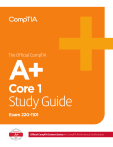 A+ Core 1 The Official CompTIA Study Guide Exam 220-1101 Official CompTIA Content Series for CompTIA Performance Certifications Course Edition: 1.0 Acknowledgments James Pengelly, Author Becky Mann, Director, Product Development James Chesterfield, Senior Manager, User Experience and Design Danielle Andries, Manager, Product Development Notices Disclaimer While CompTIA, Inc. takes care to ensure the accuracy and quality of these materials, we cannot guarantee their accuracy, and all materials are provided without any warranty whatsoever, including, but not limited to, the implied warranties of merchantability or fitness for a particular purpose. The use of screenshots, photographs of another entity's products, or another entity's product name or service in this book is for editorial purposes only. No such use should be construed to imply sponsorship or endorsement of the book by nor any affiliation of such entity with CompTIA. This courseware may contain links to sites on the Internet that are owned and operated by third parties (the "External Sites"). CompTIA is not responsible for the availability of, or the content located on or through, any External Site. Please contact CompTIA if you have any concerns regarding such links or External Sites. Trademark Notice CompTIA®, A+®, and the CompTIA logo are registered trademarks of CompTIA, Inc. in the United States and other countries. All other product and service names used may be common law or registered trademarks of their respective proprietors. Copyright Notice Copyright © 2022 CompTIA, Inc. All rights reserved. Screenshots used for illustrative purposes are the property of the software proprietor. Except as permitted under the Copyright Act of 1976, no part of this publication may be reproduced or distributed in any form or by any means, or stored in a database or retrieval system, without the prior written permission of CompTIA, 3500 Lacey Road, Suite 100, Downers Grove, IL 60515-5439. This book conveys no rights in the software or other products about which it was written; all use or licensing of such software or other products is the responsibility of the user according to terms and conditions of the owner. If you believe that this book, related materials, or any other CompTIA materials are being reproduced or transmitted without permission, please call 1-866-835-8020 or visit https://help.comptia.org. A+ Core1_220-1101_TTL_ACK_ppi-ii.indd 2 14/03/22 4:17 PM Table of Contents | iii Table of Contents Lesson 1: Installing Motherboards and Connectors..................................................... 1 Topic 1A: Explain Cable Types and Connectors................................................... 2 Topic 1B: Install and Configure Motherboards.................................................. 17 Topic 1C: Explain Legacy Cable Types................................................................. 34 Lesson 2: Installing System Devices............................................................................. 43 Topic 2A: Install and Configure Power Supplies and Cooling........................... 44 Topic 2B: Select and Install Storage Devices...................................................... 52 Topic 2C: Install and Configure System Memory............................................... 65 Topic 2D: Install and Configure CPUs.................................................................. 72 Lesson 3: Troubleshooting PC Hardware..................................................................... 81 Topic 3A: Apply Troubleshooting Methodology................................................. 82 Topic 3B: Configure BIOS/UEFI............................................................................. 90 Topic 3C: Troubleshoot Power and Disk Issues................................................. 98 Topic 3D: Troubleshoot System and Display Issues........................................ 110 Lesson 4: Comparing Local Networking Hardware................................................... 119 Topic 4A: Compare Network Types................................................................... 120 Topic 4B: Compare Networking Hardware...................................................... 125 Topic 4C: Explain Network Cable Types............................................................ 133 Topic 4D: Compare Wireless Networking Types.............................................. 145 Lesson 5: Configuring Network Addressing and Internet Connections................. 159 Topic 5A: Compare Internet Connection Types............................................... 160 Topic 5B: Use Basic TCP/IP Concepts................................................................ 170 Topic 5C: Compare Protocols and Ports........................................................... 183 Topic 5D: Compare Network Configuration Concepts.................................... 189 Table of Contents A+ Core1_220-1101_TOC_ppiii-iv.indd 3 12/03/22 1:59 PM iv | Table of Contents Lesson 6: Supporting Network Services..................................................................... 199 Topic 6A: Summarize Services Provided by Networked Hosts...................... 200 Topic 6B: Compare Internet and Embedded Appliances................................ 212 Topic 6C: Troubleshoot Networks..................................................................... 218 Lesson 7: Summarizing Virtualization and Cloud Concepts.................................... 227 Topic 7A: Summarize Client-Side Virtualization.............................................. 228 Topic 7B: Summarize Cloud Concepts.............................................................. 235 Lesson 8: Supporting Mobile Devices......................................................................... 243 Topic 8A: Set Up Mobile Devices and Peripherals........................................... 244 Topic 8B: Configure Mobile Device Apps.......................................................... 261 Topic 8C: Install and
