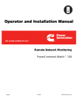 Operator and Installation Manual Remote Network Monitoring PowerCommand iWatcht 100 English 12-2007 900−0545 (Issue 3) Table of Contents SECTION TITLE PAGE SAFETY PRECAUTIONS . . . . . . . . . . . . . . . . . . . . . . . . . . . . . . . . . . . . . . . viii CUMMINS POWER GENERATION POWERCOMMAND) SOFTWARE LICENSE AGREEMENT . . . . . . . . . . . . . . . . . . . . . . . . . . . . . . . . . . . . . . . . Recitals . . . . . . . . . . . . . . . . . . . . . . . . . . . . . . . . . . . . . . . . . . . . . . . . . . . . . License Grant Restrictions . . . . . . . . . . . . . . . . . . . . . . . . . . . . . . . . . . Markings . . . . . . . . . . . . . . . . . . . . . . . . . . . . . . . . . . . . . . . . . . . . . . . . . Materials . . . . . . . . . . . . . . . . . . . . . . . . . . . . . . . . . . . . . . . . . . . . . . . . . Title . . . . . . . . . . . . . . . . . . . . . . . . . . . . . . . . . . . . . . . . . . . . . . . . . . . . . Licensee Expenses . . . . . . . . . . . . . . . . . . . . . . . . . . . . . . . . . . . . . . . . Payment . . . . . . . . . . . . . . . . . . . . . . . . . . . . . . . . . . . . . . . . . . . . . . . . . Updates and Maintenance . . . . . . . . . . . . . . . . . . . . . . . . . . . . . . . . . . No Modification by Licensee . . . . . . . . . . . . . . . . . . . . . . . . . . . . . . . . Warranties . . . . . . . . . . . . . . . . . . . . . . . . . . . . . . . . . . . . . . . . . . . . . . . . Warranty Disclaimer . . . . . . . . . . . . . . . . . . . . . . . . . . . . . . . . . . . . . . . Government Licensee . . . . . . . . . . . . . . . . . . . . . . . . . . . . . . . . . . . . . Restricted Rights Legend . . . . . . . . . . . . . . . . . . . . . . . . . . . . . . . . . . Confidentiality . . . . . . . . . . . . . . . . . . . . . . . . . . . . . . . . . . . . . . . . . . . . Termination of Agreement . . . . . . . . . . . . . . . . . . . . . . . . . . . . . . . . . . Completeness . . . . . . . . . . . . . . . . . . . . . . . . . . . . . . . . . . . . . . . . . . . . Export Regulations . . . . . . . . . . . . . . . . . . . . . . . . . . . . . . . . . . . . . . . . Governing Law . . . . . . . . . . . . . . . . . . . . . . . . . . . . . . . . . . . . . . . . . . . . Attorney’s Fees . . . . . . . . . . . . . . . . . . . . . . . . . . . . . . . . . . . . . . . . . . . Agreement Successors and Assigns . . . . . . . . . . . . . . . . . . . . . . . . . Reprint Permissions . . . . . . . . . . . . . . . . . . . . . . . . . . . . . . . . . . . . . . . . . . x x x x x xi xi xi xi xi xi xi xii xii xii xii xii xiii xiii xiii xiii xiv 1 INTRODUCTION . . . . . . . . . . . . . . . . . . . . . . . . . . . . . . . . . . . . . . . . . . . . . . . Welcome . . . . . . . . . . . . . . . . . . . . . . . . . . . . . . . . . . . . . . . . . . . . . . . . . . . Additional Hardware Needed . . . . . . . . . . . . . . . . . . . . . . . . . . . . . . . . . . Software Features . . . . . . . . . . . . . . . . . . . . . . . . . . . . . . . . . . . . . . . . . . . Control Pages . . . . . . . . . . . . . . . . . . . . . . . . . . . . . . . . . . . . . . . . . . . . About This Operator’s Manual . . . . . . . . . . . . . . . . . . . . . . . . . . . . . . . . . 1-1 1-1 1-2 1-2 1-2 1-2 2 SOFTWARE INSTALLATION . . . . . . . . . . . . . . . . . . . . . . . . . . . . . . . . . . . . Introduction . . . . . . . . . . . . . . . . . . . . . . . . . . . . . . . . . . . . . . . . . . . . . . . . . Computer Hardware Requirements . . . . . . . . . . . . . . . . . . . . . . . . . . . . . Computer Software Requirements . . . . . . . . . . . . . . . . . . . . . . . . . . . . . i.lon100e3 CD / Software Installation . . . . . . . . . . . . . . . . . . . . . . . . . . . PowerCommand iWatch 100 CD Installation . . . . . . . . . . . . . . . . . . . . . 2-1 2-1 2-1 2-1 2-1 2-2 i Table of Contents SECTION TITLE PAGE 3 POWERCOMMAND iWATCH 100 INSTALLATION . . . . . . . . . . . . . . . . . Introduction . . . . . . . . . . . . . . . . . . . . . . . . . . . . . . . . . . . . . . . . . . . . . . . . . Mounting and Wiring of the i.LON 100 . . . . . . . . . . . . . . . . . . . . . . . . . . Mounting the Enclosure . . . . . . . . . . . . . . . . . . . . . . . . . . . . . . . . . . . . Wiring Connections . . . . . . . . . . . . . . . . . . . . . . . . . . . . . . . . . . . . . . . . The RJ-45 10/100 BaseT Ethernet Port . . . . . . . . . . . . . . . . . . . . . . The DB-9 Console Port . . . . . . . . . . . . . . . . . . . . . . . . . . . . . . . . . . . . RS-485 Serial Port . . . . . . . . . . . . . . . . . . . . . . . . . . . . . . . . . . . . . . . . Connecting RS-485 to the ModBus . . . . . . . . . . . . . . . . . . . . . . . . . . The RJ-11 Telephone Line Port . . . . . . . . . . . . . . . . . . . . . . . . . . . . . High Voltage Mains Power . . . . . . . . . . . . . . . . . . . . . . . . . . . . . . . . . . LonWorks Network . . . . . . . . . . . . . . . . . . . . . . . . . . . . . . . . . . . . . . . . Wiring Diagrams . . . . . . . . . . . . . . . . . . . . . . . . . . . . . . . . . . . . . . . . . . 3-1 3-1 3-1 3-1 3-1 3-1 3-3 3-3 3-3 3-5 3-5 3-6 3-6 4 CONNECTING THE i.LON100e3 TO THE NETWORK AND COMMISSIONING THE POWERCOMMAND iWATCH 100 . . . . . . . . . . Configuring a PowerCommand iWatch 100 . . . . . . . . . . . . . . . . . . . . . . Creating a Project Folder and Copying the Image . . . . . . . . . . . . . . . . Updating Project Settings . . . . . . . . . . . . . . . . . . . . . . . . . . . . . . . . . . . . . Loading the i.LON 100 Image . . . . . . . . . . . . . . . . . . . . . . . . . . . . . . . . . Formatting the i.LON 100 . . . . . . . . . . . . . . . . . . . . . . . . . . . . . . . . . . Setting a Static IP Address on your Computer . . . . . . . . . . . . . . . . Ping Test . . . . . . . . . . . . . . . . . . . . . . . . . . . . . . . . . . . . . . . . . . . . . . . . . FTP Transfer . . . . . . . . . . . . . . . . . . . . . . . . . . . . . . . . . . . . . . . . . . . . . Creating an Xdriver Remote Network Interface . .
