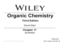 Organic Chemistry Third Edition David Klein Chapter 11 Synthesis Copyright © 2017 John Wiley & Sons, Inc. All rights reserved. Klein, Organic Chemistry 3e 11.1 One-Step Syntheses • Solving a synthesis problem (i.e. “providing the reagents”) is straight-forward when only one reaction is needed: • Here, we would need Br2. • You have to master all the reactions, and the reagents required before tackling multi-step synthesis problems. • It is critical to work through Conceptual Checkpoint 11.1 and 11.2 before moving forward. Copyright © 2017 John Wiley & Sons, Inc. All rights reserved. 11-2 Klein, Organic Chemistry 3e 11.2 Functional Group Transformations • It’s logical to review the two-step synthesis strategies from previous chapters • Moving a functional group from one carbon to the next: • Here, we need to obtain the Zaitsev alkene, and choose the strong base used accordingly • The second step must be Markovnikov addition of HBr Copyright © 2017 John Wiley & Sons, Inc. All rights reserved. 11-3 Klein, Organic Chemistry 3e 11.2 Functional Group Transformations • We can layout all the reactions we know where alkyl bromides and alkenes are concerned, and then choose the reagents needed to yield the correct regiochemistry: Copyright © 2017 John Wiley & Sons, Inc. All rights reserved. 11-4 Klein, Organic Chemistry 3e 11.2 Functional Group Transformations The approach must be modified for the analogous modification on an alcohol Copyright © 2017 John Wiley & Sons, Inc. All rights reserved. 11-5 Klein, Organic Chemistry 3e 11.2 Functional Group Transformations • We also know how to apply a two-step strategy to move the position of a p bond in an alkene: • For the 1st reaction, we need to add H and Br to the alkene • For the 2nd reaction, we need to do an E2 elimination • Again, the reagents we choose depends on the regioselectivity we need Copyright © 2017 John Wiley & Sons, Inc. All rights reserved. 11-6 Klein, Organic Chemistry 3e 11.2 Functional Group Transformations We have no chance to get this far unless we can easily recall all the possible reagents and reaction conditions first !! Copyright © 2017 John Wiley & Sons, Inc. All rights reserved. 11-7 Klein, Organic Chemistry 3e 11.2 Functional Group Transformations • A two-step sequence is needed to convert an alkane to an alkene • We would then be able to convert the double bond to a single bond, or a triple bond • Practice with SkillBuilder 11.1 Copyright © 2017 John Wiley & Sons, Inc. All rights reserved. 11-8 Klein, Organic Chemistry 3e 11.3 Changing the Carbon Skeleton • For some transformations, it may be necessary to tamper with the carbon skeleton (add or remove carbons) • When a synthesis requires the carbon skeleton to be altered, you need to be able to recall the reactions that add/remove carbons • Most reactions learned so far only change a functional group, or change the location of it. Copyright © 2017 John Wiley & Sons, Inc. All rights reserved. 11-9 Klein, Organic Chemistry 3e 11.3 Changing the Carbon Skeleton • So far, we have learned only one transformation that increases the number of carbons in a molecule • For the time being, we know this reaction will have to be used when we need to add carbons to a compound Copyright © 2017 John Wiley & Sons, Inc. All rights reserved. 11-10 Klein, Organic Chemistry 3e 11.3 Changing the Carbon Skeleton • We have also learned a way to decrease the number of carbons in a molecule • In the future, we will discuss many more reactions that alter the carbon skeleton • Practice with SkillBuilder 11.2 Copyright © 2017 John Wiley & Sons, Inc. All rights reserved. 11-11 Klein, Organic Chemistry 3e 11.4 How to Approach a Synthesis Problem • To approach any synthesis problem, first answer these two questions: Is there a change in the carbon skeleton? Is it gaining or losing carbons? Is there a change in the identity and/or location of the functional group? Solving a synthesis problem requires the recall of all the reactions learned, and working through many examples. Copyright © 2017 John Wiley & Sons, Inc. All rights reserved. 11-12 Klein, Organic Chemistry 3e 11.4 How to Approach a Synthesis Problem SkillBuilder 11.3 – Propose an efficient synthesis for the following transformation Is there a change in the carbon skeleton? YES. The starting compound has 5 carbons, the target compound has 7: Copyright © 2017 John Wiley & Sons, Inc. All rights reserved. 11-13 Klein, Organic Chemistry 3e 11.4 How to Approach a Synthesis Problem Is there a change in the identify and/or location of the functional group? Alkyne changed to trans alkene, but the location hasn’t changed (remains between 4 and 5) So the synthesis needs to accomplish the following: • triple bond must be converted to trans alkene • two additional carbon atoms must be installed What reagents/reactions will accomplish these tasks? Copyright © 2017 John Wiley & Sons, Inc. All rights reserved. 11-14 Klein, Organic Chemistry 3e 11.4 How to Approach a Synthesis Problem Two carbon atoms can be introduced by alkylating the starting alkyne, which gives the correct carbon skeleton: Dissolving metal reduction converts alkynes to trans alkenes: So it’s a two-step (actually 3 reactions) synthesis… Copyright © 2017 John Wiley & Sons, Inc. All rights reserved. 11-15 Klein, Organic Chemistry 3e 11.4 How to Approach a Synthesis Problem It’s extremely important to number each reaction in the multistep synthesis. Merely listing all the reagents together is not sufficient There are more examples in Practice the Skill 11.7 Copyright © 2017 John Wiley & Sons, Inc. All rights reserved. 11-16 Klein, Organic Chemistry 3e 11.5 Retrosynthetic Analysis • Retrosynthetic Analysis – simply put, this approach means we solve for the reaction sequence in reverse order • We begin by solving for the last step in the synthesis, first! • Still need to ask the same two questions before 