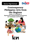 Senior High School Contemporary Philippine Arts from the Regions Grade 11/12 Module 6: Approaches in Researching Contemporary Art Techniques and Practices 1 CPAR – Grade 11-12 Alternative Delivery Mode Module 6: Approaches in Researching Contemporary Art Techniques and Practices First Edition, 2020 Republic Act 8293, section 176 states that: No copyright shall subsist in any work of the Government of the Philippines. However, prior approval of the government agency or office wherein the work is created shall be necessary for exploitation of such work for profit. Such agency or office may, among other things, impose as a condition the payment of royalties. Borrowed materials (i.e., songs, stories, poems, pictures, photos, brand names, trademarks, etc.) included in this module are owned by their respective copyright holders. Every effort has been exerted to locate and seek permission to use these materials from their respective copyright owners. The publisher and authors do not represent nor claim ownership over them. Published by the Department of Education Secretary: Leonor Magtolis Briones Undersecretary: Diosdado M. San Antonio Development Team of the Module Writer: Ma. Aurora T. Colorado Editor: Amalia Solis, EPS Content Reviewer: Herwin S. Gatdula Language Reviewer: Fatima Vergara Illustrator: Layout Artist: Management Team: Malcolm S. Garma, Regional Director Genia V. Santos, CLMD Chief Dennis M. Mendoza, Regional EPS in Charge of LRMS and Regional ADM Coordinator. Maria Magdalena M. Lim, CESO V, Schools Division Superintendent, Aida H. Rondilla, CID Chief , Lucky S. Carpio, Division EPS in Charge of LRMS and Division ADM Coordinator Printed in the Philippines by ________________________ Department of Education – Region NCR Office Address: Telefax: E-mail Address: ____________________________________________ ____________________________________________ ____________________________________________ ____________________________________________ SHS Contemporary Philippine Arts from the Regions Module 6: Approaches in Researching Contemporary Art Techniques and Practices Introductory Message For the facilitator: Welcome to the Contemporary Philippine Arts from the Regions 11/12 Alternative Delivery Mode (ADM) Module on the Approaches in Researching Contemporary Art Techniques and Practices. This module was collaboratively designed, developed and reviewed by educators both from public and private institutions to assist you, the teacher or facilitator in helping the learners meet the standards set by the K to 12 Curriculum while overcoming their personal, social, and economic constraints in schooling. This learning resource hopes to engage the learners into guided and independent learning activities at their own pace and time. Furthermore, this also aims to help learners acquire the needed 21st century skills while taking into consideration their needs and circumstances. In addition to the material in the main text, you will also see this box in the body of the module: Notes to the Teacher As a facilitator, you are expected to orient the learners on how to use this module. You also need to keep track of the learners' progress while allowing them to manage their own learning. Furthermore, you are expected to encourage and assist the learners as they do the tasks included in the module. For the learner: Welcome to the CPAR 11/12 Alternative Delivery Mode (ADM) Module on the Approaches in Researching Contemporary Art Techniques and Practices! The hand is one of the most symbolized part of the human body. It is often used to depict skill, action and purpose. Through our hands we may learn, create and accomplish. Hence, the hand in this learning resource signifies that you as a learner is capable and empowered to successfully achieve the relevant competencies and skills at your own pace and time. Your academic success lies in your own hands! This module was designed to provide you with fun and meaningful opportunities for guided and independent learning at your own pace and time. You will be enabled to process the contents of the learning resource while being an active learner. 4 This module has the following parts and corresponding icons: What I Need to Know This will give you an idea of the skills or competencies you are expected to learn in the module. What I Know This part includes an activity that aims to check what you already know about the lesson to take. If you get all the answers correct (100%), you may decide to skip this module. What’s In This is a brief drill or review to help you link the current lesson with the previous one. What’s New In this portion, the new lesson will be introduced to you in various ways such as a story, a song, a poem, a problem opener, an activity or a situation. What is It This section provides a brief discussion of the lesson. This aims to help you discover and understand new concepts and skills. What’s More This comprises activities for independent practice to solidify your understanding and skills of the topic. You may check the answers to the exercises using the Answer Key at the end of the module. What I Have Learned This includes questions or blank sentence/paragraph to be filled in to process what you learned from the lesson. What I Can Do This section provides an activity which will help you transfer your new knowledge or skill into real life situations or concerns. Assessment This is a task which aims to evaluate your level of mastery in achieving the learning competency. Additional Activities In this portion, another activity will be given to you to enrich your knowledge or skill of the lesson learned. This also tends retention of learned concepts. Answer Key This contains answers to all activities in the module. At the end of this module you will also find: 5 References This is a list of all sources used in developing this module. The following are some reminders in using this module: 1. Use the module with care. Do not put unnecessary