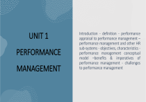 UNIT 1 PERFORMANCE MANAGEMENT Introduction - definition - performance appraisal to performance management – performance management and other HR sub-systems - objectives, characteristics performance management conceptual model –benefits & imperatives of performance management - challenges to performance management Introduction “Performance management is the process of creating a work environment or setting in which people are enabled to perform to the best of their abilities.” “Performance management is a continuous process of identifying, measuring and developing the performance of individuals and teams and aligning performance with the strategic goals of the organisation” What is Performance Management? It is integrated, because it effects four types of integration • Vertical • Functional • Human Resource • Goals Nature of performance Management Concern with output,outcomes,process and input. Concern with planning. Concern with measurement and review. Concern with continuous development and improvement. Concern for communication. Concern for stakeholder. Ethical concerns. SCOPE OF PERFORMANCE MANAGEMENT SYSTEM Identifying the parameters of performance and stating them very clearly; Setting performance standards; Planning performance development activities; Planning in participative ways where appropriate, performance of all constituents; Creating ownership; Identifying competencies and competency gaps that contribute/hinder to performance; Recognizing and promoting performance culture; Process of PM file:///C:/Users/harin/Downloads/performancemanagement-140507052546-phpapp01.pdf Basis of Comparison Performance Appraisal Performance Management Meaning Evaluating the performance and potential of employees Managing and developing employees and their performance Purpose Determine compensation Increase the growth of the organization Orientation A system A process Flexibility Not Flexible Highly flexible Type of tool Operational tool Strategic tool Aim Improve employee efficiency Reach business development goals Ownership HR department Managers and stakeholders Time frame Annually Ongoing Nature Retrospective Forward-looking Approach Based on individual employees Team-based value Objectives of PM To enable the employees towards achievement of superior standards of work performance. To help the employees in identifying the knowledge and skills required for performing the job efficiently as this would drive their focus towards performing the right task in the right way. Boosting the performance of the employees by encouraging employee empowerment, motivation and implementation of an effective reward mechanism Promoting a two way system of communication between the supervisors and the employees for providing a regular and a transparent feedback for improving employee performance and continuous coaching. Identifying the barriers to effective performance and resolving those barriers through constant monitoring, coaching and development interventions. Creating a basis for several administrative decisions strategic planning, succession planning, promotions and performance based payment Conceptual Model PROVIDES CLARITY Performance management gives employees a clear understanding of their expectations, goals, and deliverables. It creates an amicable work environment as team leads and members are on the same page concerning deliverables and outcomes. Such work cultures, in turn, experience reduced conflict, increased efficiency, and enhanced performance quality. ENHANCES EFFICIENCY Benefits Performance management tools help capture details about employees, including salaries, targets and goals, and performance. These data points enable organizations to consistently select the right employees for specific roles and promotions. They also help identify those who are not performing optimally, so that plans can be made for additional training or performance improvement plans (PIPs), etc. PROMOTES JOB SATISFACTION As employees gain clarity about their deliverables, and the expectations from them, it also creates opportunities for self-assessment, improved performance, and agency in defining one’s career path. This autonomy empowers employees to take charge of their growth and professional development, which in turn promotes job satisfaction. Benefits INCREASES MOTIVATION A performance management system identifies and showcases star performers in an organization. Such recognition helps develop a culture of excellence that motivates employees to produce their best work and put their skills to best use. Organizations can choose to recognize and reward employees with monetary benefits, awards, or promotions. This drives home the message that the organization will reward good performance and encourage others to strive for exceptional achievements. ENABLES OBJECTIVE DECISION-MAKING Humans often carry unconscious bias, which is hard to recognize and reduce. And while working with teams, there could be a natural tendency to favor a few. But a robust performance management system enables managers and leaders to make objective decisions while reducing biases, nepotism, favoritism, etc. A performance management system can provide data based purely on merit and map them to expected targets and goals, thereby making the process transparent and objective. This in turn enables objective decision-making. CHALLENGES OF PERFORMANCE MANAGEMENT IMPLEMENTING A SUCCESSFUL PERFORMANCE MANAGEMENT SYSTEM TAKES PLANNING AND SEAMLESS MATCHING OF THE NEEDS OF THE BUSINESS TO THE TOOLS AVAILABLE. FOLLOWING THE COVID-19 PANDEMIC-INDUCED LOCKDOWNS, MOST ORGANIZATIONS HAVE NOW ESTABLISHED HYBRID WORK MODELS, WHICH INCLUDE PART OR FULL WORK FROM HOME. THIS HAS ALSO CAUSED SIGNIFICANT CHALLENGES WHILE IMPLEMENTING PERFORMANCE MANAGEMENT SYSTEMS. WITH WORK FROM HOME AND INABILITY TO MEET EMPLOYEES IN PERSON, ALL OF THE FOLLOWING CHALLENGES BECOME IMPORTANT AND NEED TO BE ADDRESSED. THE ABSENCE MILESTONES CHALLENGES OF P