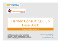 Darden Consulting Club Case Book 2014‐2015 Edition (Version 2) Copyright 2015 © by the Darden Consulting Club. No part of this publication may be reproduced or distributed in any form or by any means, or stored in a database or retrieval system, without the prior written permission of the publisher. Compiled and edited by Sean Boes ’16 Sri Naraharasetti ’16 Table of Contents 1. The Consulting Case Interview 1. Structure of the Case Interview 2. Frameworks 3. Math 2. Company Overviews 3. Practice Cases 4. Acknowledgements The Consulting Case Interview Structure of the Case Interview The case interview typically lasts between 20‐40 minutes and consists of: • • • • • Case overview/ prompt Clarifying questions Structure/ framework building & explanation Problem solving & analysis Recommendation More information on each of these sections follows. In general, the bulk of your time should be spent on problem solving & analysis, with 2‐3 minutes to build your framework and a <2 minute recommendation at the end. The interview should be highly conversational and interactive. Depending on the firm, round, and seniority of your interviewer, some interviews will be more structured than others. Please see the subsequent section for more firm‐specific information. Structure of the Case Interview Case Overview/ Prompt • The case interview will start with the interviewer providing the overview of the client and the problem. Take diligent notes, as the overview contains crucial information you will need later in the case. • Following the prompt, you should give the interviewer your initial synthesis of the case. Confirm the objective and the key facts. Don’t simply repeat back word‐for‐word what the interviewer said – this is the first chance to prove that you can synthesize information quickly • Occasionally, the interviewer will not frame a specific question – one way to handle this is to test the client’s goals with clarifying questions and propose an approach before structuring the problem Clarifying Questions • After the initial synthesis, you have the opportunity to ask some clarifying questions. This can be used to clarify a specific term used in the case prompt, to identify a concrete benchmark or goal for the problem(e.g. in a profitability case, can ask whether there are targets or time frames that the client has in mind) or to understand more about the client, their customer base, their competition, and their industry generally. Do not ask specific questions about the client at this stage, and do not ask more than 3‐5 clarifying questions. Structure of the Case Interview Structure/ Framework Building & Explanation • Following the prompt and clarifying questions, you should ask for some time to sketch out your framework • Generally it is a good idea to write the objective at the top of your framework, and then structure it like an issue “tree”, with 2‐4 buckets and a few supporting points underneath each • Do not take more than 2 minutes to draw out your framework; then present to your interviewer • It can be useful to read books like Case in Point that provide a bank of suggested frameworks, but it is not recommended to try to memorize frameworks as you run the risk of overlooking what is unique about each case situation and appearing robotic and overprepared Problem Solving & Analysis • After talking through the framework with your interviewer, propose the area of analysis that you’d like to start with. Do not wait for the interviewer to prompt you with “Where would you like to start?”. • At this point your interviewer may suggest a different path or present you more information, especially data. If the interviewer does neither of those things, you should continue down the path you proposed and start identifying potential issues and areas of analysis, and then ask if the interviewer has any related data • In general, the analysis will start off with some calculations or chart‐reading, and then will move into a more qualitative/strategic direction where you’re asked to come up with some ideas. Keep in mind that this whole interview should be conversational in nature and listen carefully for hints. Structure of the Case Interview Recommendation • Once you have worked through analysis and uncovered the main issues of the case, your interviewer will ask for a recommendation. • You can ask for a minute to gather your thoughts, but some interviewers will say no. It is a good idea to make a habit of noting risks and next steps as you work through the case so that this step is quicker • Your answer should: • • • • Clearly state the recommendation Support with a few key pieces of evidence (don’t rehash analysis – get to the answer) Identify risks Suggest next steps • Presentation of this should be no longer than 1 min (and sometimes the interviewer will ask for a shorter answer) • If your interviewer gives you a minute to prepare, you can write out a recommendation slide and present it, similar to the framework at the beginning of the case. This is not necessary or possible in many case situations Frameworks Structure/ Framework Building & Explanation • The most important thing to remember about frameworks is that there is no one‐size‐fits‐all framework. • That being said, the profit framework applies to a large number of cases; a framework for evaluating an investment decision is also useful. • For a good overview of how various parts of a framework fits together in one monster diagram, refer to How To Get Into the Top Consulting Firms by Tim Darling book. There are good overviews of the most common frameworks in Case In Point and in the shared Consulting Club folder, but do not memorize them. Instead, you should be able to use your intuitive business judgment to determine the most relevant issues to examine. • When constructing your framework, remember to be MECE, a McKinsey‐ coined term t