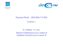 Practical Work – DELMIA V5 R20 Lecture 1 D. Chablat / S. Caro Damien.Chablat@irccyn.ec-nantes.fr Stephane.Caro@irccyn.ec-nantes.fr Definition of the language for the user interface • Native languages – English, French, German, Italian, Japanese, Simplified Chinese, Korean • To change from French to English – Outils / Personnaliser / Options / Langue de l'interface utilisateur • To change from English to French – Tools / Customize / Options / User Interface Language D. Chablat / S. Caro -- Institut de Recherche en Communications et Cybernétique de Nantes 2 Definition of the language for the user interface Change to Anglais Restart CATIA D. Chablat / S. Caro -- Institut de Recherche en Communications et Cybernétique de Nantes 3 Mouse usage Use this mouse button Whenever you read Select (menus, commands, etc.) Click (icons, dialog box buttons, tabs, location in the document window) Double-click Shift-click Ctrl-click Check (check boxes), Drag Drag and drop (icons onto objects, objects onto icons) Drag Move Right click (to select contectual menu) D. Chablat / S. Caro -- Institut de Recherche en Communications et Cybernétique de Nantes 4 Outline of the lecture • Create a robot from CAD parts – Create direct kinematics – Create inverse kinematics – Analyze the DH parameters – Create robot properties (velocity and acceleration) • Create a tool • Create a robotic cell D. Chablat / S. Caro -- Institut de Recherche en Communications et Cybernétique de Nantes 5 Product creation • Start / Resource Detailing / Device Building D. Chablat / S. Caro -- Institut de Recherche en Communications et Cybernétique de Nantes 6 Product creation • Rename the product – Right click on product – Properties D. Chablat / S. Caro -- Institut de Recherche en Communications et Cybernétique de Nantes 7 Product creation • Type a product name – PUMA_PW D. Chablat / S. Caro -- Institut de Recherche en Communications et Cybernétique de Nantes 8 Part creation • Parts are already created, you have to download it on http://www.irccyn.ec-nantes.fr/~chablat/COMOR/Delmia.html • The location of the parts in the assembly defines the Home pose of the robot. • You have to define the joints between each parts from the base to the end-effector. • Respect all the times the link between the father and the son. D. Chablat / S. Caro -- Institut de Recherche en Communications et Cybernétique de Nantes 9 Insert the parts of the robot • Click on product “PUMA_PW” • Insert / Existing Components D. Chablat / S. Caro -- Institut de Recherche en Communications et Cybernétique de Nantes 10 Insert the parts of the robot • Go to folder “Puma” and select all parts • Open D. Chablat / S. Caro -- Institut de Recherche en Communications et Cybernétique de Nantes 11 Mechanism Creation • Click on the “fixed part ” button • Click on “new mechanism” • Choose a name for your mechanism: “Puma_robot” • Click on “Puma_link_1.1” to select it as “Fix Part” D. Chablat / S. Caro -- Institut de Recherche en Communications et Cybernétique de Nantes 12 Hide and Swap Commands • To hide/show a part, right click on it then click Hide/Show • Use the “swap visible space” button to swap between the hidden and visible spaces D. Chablat / S. Caro -- Institut de Recherche en Communications et Cybernétique de Nantes 13 Create Kinematic Joints • To create a Revolute Joint between “Puma_link_1” and “Puma_link_2” • Hide “Puma_link_2” D. Chablat / S. Caro -- Institut de Recherche en Communications et Cybernétique de Nantes 14 Create Kinematic Joints • Click on the “Revolute Joint” button • Select the axis of “Puma_link_1” as Line 1 D. Chablat / S. Caro -- Institut de Recherche en Communications et Cybernétique de Nantes 15 Create Kinematic Joints • Click on the “swap visible space” button • Select the axis of “Puma_link_2” as Line 2 D. Chablat / S. Caro -- Institut de Recherche en Communications et Cybernétique de Nantes 16 Create Kinematic Joints • Click on the “swap visible space” button • Select Plane 1 on “Puma_link_1” as follows: D. Chablat / S. Caro -- Institut de Recherche en Communications et Cybernétique de Nantes 17 Create Kinematic Joints • Again, click on the “swap visible space” button • Select Plane 2 on “Puma_link_2” as follows: D. Chablat / S. Caro -- Institut de Recherche en Communications et Cybernétique de Nantes 18 Create Kinematic Joints • Finally, to create the Revolute joint: • Activate the angle driven option and click OK • You may get an information box informing you that the mechanism can be simulated D. Chablat / S. Caro -- Institut de Recherche en Communications et Cybernétique de Nantes 19 Create Kinematic Joints • Similarly, create Revolute joint 2 between “Puma_link_2” and “Puma_link_3” D. Chablat / S. Caro -- Institut de Recherche en Communications et Cybernétique de Nantes 20 Create Kinematic Joints • Revolute joint 2 D. Chablat / S. Caro -- Institut de Recherche en Communications et Cybernétique de Nantes 21 Create Kinematic Joints • Similarly, create six revolute joints as follows: • Hide Constraints in the specification’s tree D. Chablat / S. Caro -- Institut de Recherche en Communications et Cybernétique de Nantes 22 Create Kinematic Joints • Rename the six commands as “theta_1,…,theta_6” D. Chablat / S. Caro -- Institut de Recherche en Communications et Cybernétique de Nantes 23 Define Home Positions • Now, we are going to control each joint : • Click on “Home Positions” button • Click “New” D. Chablat / S. Caro -- Institut de Recherche en Communications et Cybernétique de Nantes 24 Define Home Positions • Set the initial Position of the robot as “Home Position 1” D. Chablat / S. Caro -- Institut de Recherche en Communications et Cybernétique de Nantes 25 Define Home Positions • See the maximal command values