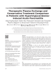 Meandros Med Dent J Original Article / Özgün Araştırma Therapeutic Plasma Exchange and Conservative Treatment Comparison in Patients with Hypertriglyceridemiainduced Acute Pancreatitis Hipertrigliseridemi İlişkili Akut Pankreatit Hastalarında Terapötik Plazma Değişimi ve Konservatif Tedavinin Karşılaştırılması Altay Kandemir1, İsmail Taşkıran1, Sezgin Vatansever2, Mustafa Çelik3, Adil Coşkun1, Mehmet Hadi Yaşa1 İrfan Yavaşoğlu4, Mevlüt Türe5, 1Aydın Adnan Menderes University Faculty of Medicine, Department of Gastroenterology, Aydın, Turkey Katip Çelebi University Atatürk Training and Research Hospital, Clinic of Gastroenterology, İzmir, Turkey 3Pamukkale University Faculty of Medicine, Department of Gastroenterology, Denizli, Turkey 4Aydın Adnan Menderes University Faculty of Medicine, Department of Hematology, Aydın, Turkey 5Aydın Adnan Menderes University Faculty of Medicine, Department of Biostatistic, Aydın, Turkey 2İzmir Abstract Keywords Conservative treatment, hypertriglyceridemiainduced acute pancreatitis, therapeutic plasma exchange Anah­tar Ke­li­me­ler Konservatif tedavi, hipertrigliseridemi ilişkili akut pankreatit, terapötik plazma değişimi Received/Geliş Ta­rihi : 23.04.2021 Accepted/Ka­bul Ta­ri­hi : 24.05.2021 doi:10.4274/meandros.galenos.2021.54815 Ad­dress for Cor­res­pon­den­ce/Ya­zış­ma Ad­re­si: Altay Kandemir Assoc. Prof., Aydın Adnan Menderes University Faculty of Medicine, Department of Gastroenterology, Aydın, Turkey Phone : +90 256 212 18 50 E-mail : altaykandemir@yahoo.com Objective: Hypertriglyceridemia is the third most common cause of acute pancreatitis. Immediate triglyceride level lowering is beneficial in patients with severe hypertriglyceridemia [triglyceride (TG) >1,000 mg/dL]. This study aimed to compare the severity of acute pancreatitis, in-hospital mortality, and local and systemic complications, as well as hospitalization duration between patients with hypertriglyceridemia-induced acute pancreatitis treated with conservative treatment only and with therapeutic plasma exchange (TPE) in addition to conservative treatment. Materials and Methods: A total of 120 patients diagnosed with hypertriglyceridemia-induced acute pancreatitis treated with TPE in addition to conservative treatment (group 1) or conservative treatment only (group 2) participated in the study. Results: Group 1 consisted of 38 patients (9 females and 29 males) and group 2 had 82 patients (29 females and 53 males). No difference was found between the two groups regarding patient characteristics. The TG levels in group 1 decreased by 56.8% in one treatment session. The rate of patients with moderately severe acute pancreatitis + severe acute pancreatitis in group 1 was 36.8%, whereas 59.8% in group 2 (p=0.029). The local complication rate was 34.2% and 57.3% in group 1 and group 2, respectively (p=0.031). No significant difference was found between the groups regarding organ failure, systemic complication, hospitalization duration, and in-hospital mortality rates. Conclusion: Our study revealed that TPE treatment is effective in reducing local complications (especially pancreatic pseudocyst). ORCID ID: orcid.org/0000-0002-2918-3811 © Meandros Medical and Dental Journal, Published by Galenos Publishing House. This is article distributed under the terms of the Creative Commons Attribution NonCommercial 4.0 International Licence (CC BY-NC 4.0). 274 Öz Amaç: Hipertrigliseridemi akut pankreatitin en sık 3 nedeninden biridir. Ciddi hipertrigliseridemisi olan hastalarda [trigliserid (TG) >1.000 mg/dL] TG düzeyinin hemen düşürülmesi faydalı olabilir. Çalışmamızda hipertrigliseridemi ilişkili akut Meandros Med Dent J 2021;22:274-81 Kandemir et al. Hypertriglyceridemia-induced Acute Pancreatitis 275 pankreatit hastalarına uygulanan konservatif tedavi ile konservatif + terapötik plazma değişimi tedavilerini mortalite, hastane yatış süresi ve lokal-sistemik komplikasyonları baz alarak karşılaştırdık. Gereç ve Yöntemler: Hipertrigliseridemi ilişkili akut pankreatit tanısı olup konservatif tedavi + terapötik plazma değişimi tedavisi alanlar (grup 1) ve sadece konservatif tedavi alan (grup 2) toplam 120 hasta çalışmaya alınmıştır. Bulgular: Grup 1’de 38 (9 kadın, 29 erkek), grup 2’de 82 (29 kadın, 53 erkek) hasta mevcuttu. İki grup arasında hasta özellikleri açısından fark yoktu. Grup 1’de bir seans tedavi sonrası TG düzeyi %56,8 azaldı. Grup 1 hastalarının %36,8’i orta + ciddi düzeyde pankreatit iken, grup 2 hastalarında bu oran %59,8 idi (p=0,029). Lokal komplikasyon oranları grup 1 ve grup 2 hastalarda sırası ile %34,2 ve %57,3 idi (p=0,031). Gruplar arasında organ yetmezliği, sistemik komplikasyonlar, hastane yatış süresi ve hastane içi mortalite açısından fark yoktu. Sonuç: Çalışmamızda, terapötik plazma değişimi tedavisi lokal komplikasyonları (özellikle pankreatik psödokist) azaltmada etkili olarak bulunmuştur. Introduction Acute pancreatitis (AP) is a common disorder having high morbidity and mortality. Although the majority of patients have a mild clinical course, the mortality rate may reach 30% in patients with severe pancreatitis (1). Hypertriglyceridemia (HTG) is the third most common cause of AP following gallstones and alcohol; it is responsible for 1-10% of AP cases (2). HTG may be primary, or it may develop secondary to alcohol abuse, diabetes mellitus (DM), pregnancy, obesity, hypothyroidism, nephrotic syndrome, or various medications such as β-blockers, oral retinoids. It is believed that AP risk is elevated in patients with triglyceride (TG) level above 1,000 mg (3). HTG has been reported to be more related to mortality, severe pancreatitis, complications, and recurrence, compared to other AP etiologies (4-6). Therefore, it is important to assess the severity and prognosis of patients with hypertriglyceridemia-induced acute pancr