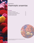 CHAPTER 6 Haemolytic anaemias Key topics ■ Normal red cell destruction 61 ■ Introduction to haemolytic anaemias 62 ■ Intravascular and extravascular haemolysis 63 ■ Hereditary haemolytic anaemias 64 ■ Acquired haemolytic anaemias 68 Hoffbrand’s Essential Haematology, Seventh Edition. By A. Victor Hoffbrand and Paul A. H. Moss. Published 2016 by John Wiley & Sons Ltd. Chapter 6: Haemolytic anaemias / 61 Normal red cell destruction Red cell destruction usually occurs after a mean lifespan of 120 days when the cells are removed extravascularly by the macrophages of the reticuloendothelial (RE) system, especially in the marrow but also in the liver and spleen. As the cells have no nucleus, red cell metabolism gradually deteriorates as enzymes are degraded and the cells become non‐viable. The breakdown of haem from haemoglobin liberates iron for recirculation via plasma transferrin mainly to marrow erythroblasts, and protoporphyrin, which is broken down to bilirubin. Bilirubin circulates to the liver where it is conjugated to glucuronides, which are excreted into the gut via bile and converted to stercobilinogen and stercobilin (excreted in faeces) (Fig. 6.1). Stercobilinogen and stercobilin are partly reabsorbed and excreted in urine as urobilinogen and urobilin. Globin chains are broken down to amino acids which are reutilized for general protein synthesis in the body. Haptoglobins are proteins in normal plasma which bind haemoglobin. The haemoglobin–haptoglobin complex is removed by the RE system. Intravascular haemolysis (breakdown of red cells within blood vessels) plays little or no part in normal red cell destruction. Extravascular Intravascular Macrophage RBC RBC Globin Protoporphyrin Iron Amino acids Bilirubin Binds to transferrin Amino acids Lysis Unconjugated bilirubin Kidney Liver Haemoglobin Kidney Bilirubin glucuronides Reabsorbed (a) Urobilinogen (urine) Methaemalbumin Haemoglobinuria Haemosiderinuria Gut Stercobilinogen (faeces) (b) Figure 6.1 (a) Normal red blood cell (RBC) breakdown. This takes place extravascularly in the macrophages of the reticuloendothelial system. (b) Intravascular haemolysis occurs in some pathological disorders. 62 / Chapter 6: Haemolytic anaemias Introduction to haemolytic anaemias Haemolytic anaemias are defined as anaemias that result from an increase in the rate of red cell destruction. Because of erythropoietic hyperplasia and anatomical extension of bone marrow, red cell destruction may be increased several‐fold before the patient becomes anaemic – compensated haemolytic disease. The normal adult marrow, after full expansion, is able to produce red cells at 6–8 times the normal rate provided this is ‘effective’. It leads to a marked reticulocytosis. Therefore, anaemia due to haemolysis may not be seen until the red cell lifespan is less than 30 days. Classification Table 6.1 is a simplified classification of the haemolytic anaemias. Hereditary haemolytic anaemias are the result of ‘intrinsic’ red cell defects, whereas acquired haemolytic anaemias are usually the result of an ‘extracorpuscular’ or ‘environmental’ change. Paroxysmal nocturnal haemoglobinuria (PNH) is the exception because, although it is an acquired disorder, the PNH red cells have an intrinsic defect. PNH is associated with marrow hypoplasia and is therefore discussed in Chapter 22. Clinical features The patient may show pallor of the mucous membranes, mild fluctuating jaundice and splenomegaly. There is no bilirubin in urine but this may turn dark on standing because of excess urobilinogen. Pigment (bilirubin) gallstones may complicate the condition (Fig. 6.2) and some patients (particularly with sickle cell disease) develop ulcers around the ankle (see Fig. 7.19). Aplastic crises may occur, usually precipitated by infection with parvovirus which ‘switches off’ erythropoiesis, and are characterized by a sudden increase in anaemia and drop in reticulocyte count (see Fig. 22.7). Rarely, folate deficiency may cause an aplastic crisis in which the bone marrow is megaloblastic. Table 6.1 Classification of haemolytic anaemias. Hereditary Acquired Membrane Hereditary spherocytosis, hereditary elliptocytosis Metabolism G6PD deficiency, pyruvate kinase deficiency Haemoglobin Genetic abnormalities (Hb S, Hb C, unstable); see Chapter 7 Immune Autoimmune Warm antibody type (see Table 6.5) Cold antibody type Alloimmune Haemolytic transfusion reactions Haemolytic disease of the newborn Allografts, especially marrow transplantation Drug associated Red cell fragmentation syndromes See Table 6.6 March haemoglobinuria Infections Malaria, clostridia Chemical and physical agents Especially drugs, industrial/domestic substances, burns Secondary Liver and renal disease Paroxysmal nocturnal haemoglobinuria (see Chapter 22) G6PD, glucose‐6‐phosphate dehydrogenase; Hb, haemoglobin. Chapter 6: Haemolytic anaemias / 63 Figure 6.2 Ultrasound of multiple small pigment gallstones typical of those associated with hereditary spherocytosis. Source: Courtesy of Dr P. Wylie. Laboratory findings The laboratory findings are conveniently divided into three groups. 1 Features of increased red cell breakdown: (a) serum bilirubin raised, unconjugated and bound to albumin; (b) urine urinobilinogen increased; (c) serum haptoglobins absent because the haptoglobins become saturated with haemoglobin and the complex is removed by RE cells. 2 Features of increased red cell production: (a) reticulocytosis; (b) bone marrow erythroid hyperplasia; the normal marrow myeloid : erythoid ratio of 2 : 1 to 12 : 1 is reduced to 1 : 1 or reversed. 3 Damaged red cells: (a) morphology (e.g. microspherocytes, elliptocytes, fragments); (b) osmotic fragility; (c) specific enzyme, protein or DNA tests. Intravascular and extravascular haemolysis There are two mechanisms whereby red cells are destroyed in haemolytic anaemia. There may be excessive removal of red cells by cells of the RE system (extr