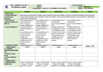 DAILY LESSON LOG FOR IN-PERSON CLASSES School: Teacher: Teaching Dates: AUGUST 28 – SEPTEMBER 01, 2023 (WEEK 1) MONDAY I. OBJECTIVES a. Content Standards b. Performance Standards c. Most Essential Learning Competencies (MELCs) d. Learning Objectives II. LEARNING CONTENT (Subject Matter) III. LEARNING RESOURCES/REFEREN CES a. Teacher’s Guide Pages b. Learner’s Material Pages c. Textbook Pages d. LRMDS Materials (SLMs/LASs) TUESDAY WEDNESDAY Grade and Section: VSubject: Mathematics Quarter: FIRST QUARTER THURSDAY FRIDAY demonstrates understanding of divisibility, order of operations, factors and multiples, and the four fundamental operations involving fractions is able to apply divisibility, order of operations, factors and multiples, and the four fundamental operations involving fractions in mathematical problems and real-life situations. uses divisibility rules for 2, uses divisibility rules for 2, uses divisibility rules for 3, uses divisibility rules for 3, 5, and 10 to find the 5, and 10 to find the 6, and 9 to find 6, and 9 to find common factors of common factors of common factors (M5NSIb- common factors (M5NSIbnumbers. (M5NSIb-58.1) numbers. (M5NSIb-58.1) 58.2) 58.2) a. list down factors of a. list down factors of a. identify numbers that a. identify numbers that numbers divisible by 2, 5, numbers divisible by 2, 5, are divisible by 3, 6 and 9; are divisible by 3, 6 and 9; and 10; and 10; b. use divisibility rules for b. use divisibility rules for b. use divisibility rules for b. use divisibility rules for 3, 6 and 9 to find common 3, 6 and 9 to find common 2, 5, and 10 to find 2, 5, and 10 to find factors of numbers; and factors of numbers; and common factors of common factors of c. appreciate the use of c. appreciate the use of numbers; and numbers; and divisibility rules to find divisibility rules to find c. appreciate the use of c. appreciate the use of common factors of common factors of divisibility rules to find divisibility rules to find numbers. numbers. common factors of common factors of numbers. numbers. Divisibility Rules for 2, 5, Divisibility Rules for 2, 5, Divisibility Rules for 3, 6, Divisibility Rules for 3, 6, WEEKLY TEST and 10 and 10 and 9 and 9 Coreal, T. (2020) Quarter 1 – Module 1: Divisibility Rules for 2, 5, and 10 Coreal, T. (2020) Quarter 1 – Module 1: Divisibility Rules for 2, 5, and 10 Serrato, E. (2020) Quarter Serrato, E. (2020) Quarter 1 – Module 2: Divisibility 1 – Module 2: Divisibility Rules for 3, 6, and 9 [Self- Rules for 3, 6, and 9 [Self- e. Other Learning Resources IV. PROCEDURES A. PRELIMINARY ACTIVITIES B. Review the previous lesson/Drill [Self-Learning Module].Moodle. Department of Education. Retrieved July 22, 2023) from https://r72.lms.deped.gov.ph/moodl e/mod/folder/view.php?id= 13093 PowerPoint Presentation, laptop, SLMs/Learning Activity Sheets, pens, notebook [Self-Learning Module].Moodle. Department of Education. Retrieved July 22, 2023) from https://r72.lms.deped.gov.ph/moodl e/mod/folder/view.php?id= 13093 PowerPoint Presentation, laptop, SLMs/Learning Activity Sheets, pens, notebook a. Greetings b. Checking of Attendance c. Prayer d. Singing of National Anthem e. Exercise f. Word of the day g. Spelling h. Reading Directions: Answer the following questions: 1) What is the smallest number divisible by 2? Learning Module].Moodle. Department of Education. Retrieved July 22, 2023) from https://r72.lms.deped.gov.ph/moodl e/mod/folder/view.php?id= 13093 Learning Module].Moodle. Department of Education. Retrieved July 22, 2023) from https://r72.lms.deped.gov.ph/moodl e/mod/folder/view.php?id= 13093 PowerPoint Presentation, laptop, SLMs/Learning Activity Sheets, pens, notebook PowerPoint Presentation, laptop, SLMs/Learning Activity Sheets, pens, notebook Directions: Identify whether the given number is divisible by 2, 5 or 10. Directions: In finding the common factors of numbers divisible by 3, 6, and 9, we can use the following divisibility rules: Let us check. a) A number is divisible by 3 if the sum of all the digits is divisible by ___. b) A number is divisible by ___if the number is divisible by both 2 and 3. c) A number is divisible by 9 if the _____ of all the digits is divisible or a 1) 18 2) Number 55 is divisible by what number? 2) 125 3) What is the biggest 2digit number divisible by 10? 4) 344 4) All even number ending 3) 30 5) 650 PowerPoint Presentation, laptop, SLMs/Learning Activity Sheets, pens, notebook in zero divisible by 10 only? ___ C. Establishing a purpose for the lesson/ Motivation Your mother gave you 100 pesos and she wants you to exchange it at the store for five-peso bills. How many five-peso bills will the storekeeper give you? POEM TIME! I AM DIVISIBLE I am a rule for numbers, simple and true, Divisible by 2, 5, and 10, I'll tell you. For even numbers, I'm quite the key, If it ends in 0 or an even digit, divisible it'll be. When 5 comes along, it's easy to see, Just check the last digit, it's as simple as can be. For numbers ending in 0 or 5, I'll give you a clue, Divisible by 5, that's what they can do. D. Presenting Divisibility rules are Now for 10, it's a piece of cake, A single zero, and you're on the right track. Divisible by 10, no remainder to find, A multiple of 10, it's one of a kind. Divisibility rules are What numbers are divisible in each money? 1. multiple of 9. d) If the sum of the digits of a number is 153, by what number/s is it divisible with? _______ e) What smallest 3-digit number is divisible by both 3 and 6? ______ You bought a whole pizza to give to the 4 children you saw on the street. How will you divide it so that each of them will have three pieces of pizza each? 2. 3. Divisibility rules are Divisibility rules are examples/instances of the new lesson/Motivation E. Discussing new concepts and practicing new skills No. 1 valuable mathematical tools that help us determine whether a given number can be evenly divided by another number without leaving a remainder. The di