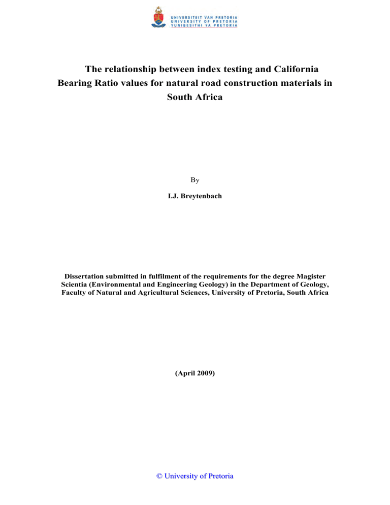 The relationship between index testing and California Bearing Ratio values for natural road construction materials in South Africa By I.J. Breytenbach Dissertation submitted in fulfilment of the requirements for the degree Magister Scientia (Environmental and Engineering Geology) in the Department of Geology, Faculty of Natural and Agricultural Sciences, University of Pretoria, South Africa (April 2009) © University of Pretoria Declaration I, Izak Johannes Breytenbach, hereby declare that the work presented in this dissertation is my own unless referenced otherwise. I also declare that this work has not been submitted at any other institute for any degree, examination or other purpose. Signed Date i Abstract The research portrayed in this dissertation aims to derive empirical means of predicting CBR values from index testing parameters and parameters calculated from them (e.g. shrinkage product). The project involved compiling a database of test results for a range of rock material types across moist and dry regions in southern Africa. The database was compiled in such a way that it represents natural gravels sampled (mostly) for construction or rehabilitation of road layer works. The database included a location description, material description, Weinert N-Value, Atterberg Limits, grading analysis and CBR values. In addition to this, the linear shrinkage product, shrinkage product, grading coefficient, grading modulus and dust ratio were calculated and also used in the analyses. All the samples were divided into two groups based on climate, as described by Weinert (1980). The data was then further sub-divided into compaction classes (95%, 98% and 100% Mod AASHTO) and within these compaction classes, each sample was assigned to a rock material group based on the classification proposed by Weinert (1980), but with minor alterations (e.g. further subdivision of pedogenic deposits). A total of 60 groups were created. Data processing was done using grading normalised to 100% passing the 37,5mm screen. In order to limit interdependency resulting from the cumulative grading, the sieve analysis results were converted to percentages retained on each sieve. This was necessary as statistical regressions often rejected datasets due to interdependency among input parameters (such as Atterberg Limits and cumulative grading). Based on the nature of the data, both stepwise linear regressions and Weibull regressions were performed. Though the Weibull regression is more suitable to the data (in theory) the linear regression could not be excluded, due to variable data. In ii addition, the existing model proposed by Kleyn (1955) empirically by Stephens (1988) which was derived was also retained for the analysis. In an attempt to refine Kleyn s model, the two parameters used by the method (i.e. grading modulus and plasticity index) were used in normal linear regressions in an attempt to adapt the model to specific material (and compaction) groups in the two climatic regions. More than 130 regressions were done for the final analysis (excluding experimental regressions, etc.), after restricting the predicted CBR ranges in an attempt to eliminate the prevailing data trend. The attempt proved futile, though, placing severe restrictions on the derived models. For each of the 60 groups all four methods were tested (i.e. stepwise linear regression, Weibull regression, Kleyn s model and a linear model adapted for each group based on Kleyn s model) and the most suitable model selected. A number of regressions were incomplete due to insufficient data, particularly in the groups associated with dry regions. Results proved poor and are ascribed to data variability rather than test methods. The data variability, in turn, is the result of test methods with poor reproducibility and repeatability. In short, the test methods (the CBR in particular) resulted in inconsistent data and subsequently poor results, making accurate predictions nearly impossible. iii Dedication This dissertation is dedicated to my father, Frans, without whom I would not be where I am. It was indeed a blessing and honour to be raised as your son. You have taught me the values of love and life and have inspired in me a passion for what I love and respect for all things around me, created by God. Through many a sacrifice on your behalf you have provided me with abundant opportunities, none of which I can repay. I therefore dedicate this dissertation to you, with a son s love. iv Acknowledgements I would like to thank the following: The CSIR, for granting me the opportunity and resources to conduct the research portrayed in this dissertation Prof Alex Visser, Prof Morris de Beer and Dr Frank Netterberg for providing me with subject matter from their personal collections Engela van Heerden from the Built Environments department, for assisting in the location of dated subject matter and other literature sources The Namibian Roads Department, for providing me with ample data at their own expense Jenny Holloway, for assisting with software required to complete this project Dr Kai Witthüser (University of Pretoria) and Dr Sonali Das (CSIR) for providing extensive assistance and input with modelling and statistics Robert Leyland, friend and fellow engineering geologist, for proof reading and numerous interesting discussions Prof Louis van Rooy, project supervisor (University of Pretoria), for his assistance and tuition throughout pre-graduate and post-graduate courses Dr Phil Paige-Green, for immense insight, experience and guidance. There are few people with the patience that characterises Phil s guidance. Phil, thank you for all your input, interesting conversations and the all-round learning experience that you have provided me with My family for their support, help and understanding. To my mother and sister for providing input and advice. And to my future wife Anria for her love, acceptance and support I would also like to thank my Lord and Saviour, Je
