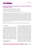 Friction 1(4): 279–305 (2013) DOI 10.1007/s40544-013-0026-y ISSN 2223-7690 REVIEW ARTICLE Scratch formation and its mechanism in chemical mechanical planarization (CMP) Tae-Young KWON, Manivannan RAMACHANDRAN, Jin-Goo PARK* Department of Materials Engineering, Hanyang University, Ansan 426-791, Korea Received: 14 June 2013 / Revised: 09 August 2013 / Accepted: 01 September 2013 © The author(s) 2013. This article is published with open access at Springerlink.com Abstract: Chemical mechanical planarization (CMP) has become one of the most critical processes in semiconductor device fabrication to achieve global planarization. To achieve an efficient global planarization for device node dimensions of less than 32 nm, a comprehensive understanding of the physical, chemical, and tribo-mechanical/chemical action at the interface between the pad and wafer in the presence of a slurry medium is essential. During the CMP process, some issues such as film delamination, scratching, dishing, erosion, and corrosion can generate defects which can adversely affect the yield and reliability. In this article, an overview of material removal mechanism of CMP process, investigation of the scratch formation behavior based on polishing process conditions and consumables, scratch formation mechanism and the scratch inspection tools were extensively reviewed. The advantages of adopting the filtration unit and the jet spraying of water to reduce the scratch formation have been reviewed. The current research trends in the scratch formation, based on modeling perspective were also discussed. Keywords: Chemical mechanical planarization (CMP); defects, scratch; post-CMP cleaning; defect source 1 Introduction Recent advances in integrated circuit (IC) technology have led to a significant increase in the number of the active components with a significant decrease in feature dimensions. This has resulted in the development of high performance IC chips. As the critical features of semiconductor devices have decreased to nanoscale dimensions and additional levels are implemented leading to multilevel-interconnection, the required degree of planarization has become more challenging. Moreover, continuous improvement is required for smaller technology nodes. As the device feature size decreases, it becomes very challenging to achieve high resolution on a non-planarized surface using lithography because of the depth of focus requirement in optical systems. Rough and irregular surfaces induce variation in the photo resist thickness, which results * Corresponding author: Jin-Goo PARK. E-mail: jgpark@hanyang.ac.kr in poor step coverage and contact interruption. In order to improve the planarity, various planarization techniques were considered, such as thermal reflow of borophosphosilicate glass (BPSG), reactive ion-etch back, spin etch planarization, spin on deposition (SOD) and others [1]. However, these techniques are extremely limited in achieving a global planarization suitable for submicron devices. On the other hand, chemical mechanical planarization (CMP) is a unique technique that can provide excellent local and global planarity for ultra large scale integrated (ULSI) applications. Figure 1 shows the planarization length of various methods used for removing the excess material. Initially, the CMP process was pioneered by IBM in 1980s [3, 4]. The CMP process became prominent due to advantages such as global planarization, fewer defects, better step coverage, suitable for various materials, and simplicity [1, 5]. The advantages of CMP are tabulated in Table 1. CMP has been developed for dielectric planarization applications. CMP is also used to remove bulk dielectric films on the surface to isolate 280 Friction 1(4): 279–305 (2013) Fig. 1 Planarization lengths of various planarization methods [2]. Fig. 2 Schematic diagram and consumables of CMP process. the active devices on silicon substrates and to remove the bulk metal films from the wafer surface to form metal interconnection plugs or lines in dielectric films [2, 6]. Due to an increase in the number of transistors on IC chips of dynamic random access memory (DRAM) and logic devices, new interconnect materials are essential to satisfy the higher performance requirements. CMP is a global planarization process in which the wafer surface is planarized using the synergistic effect of chemical and mechanical actions. During the CMP process, the wafer surface moves across a polishing pad under a down pressure in the presence of a slurry. There are many consumables for the CMP process, such as the slurry, polishing pad, and diamond conditioners [3, 5, 7, 8]. CMP involves a complex interaction between the wafer surface and the consumables. Figure 2 shows a schematic diagram of the CMP process and highlights the consumables. The type of slurry to be used depends on the material surface, which, in turn, is related to the chemical and mechanical properties of wafer material. Table 1 Silica and ceria are the most commonly used abrasives particles. The abrasive particles used are in the nanometer range. The nature of the abrasive particles and their size distribution plays an important role in material removal during the CMP process [9, 10]. Additives added to the slurry play different roles during oxide and metal CMP. In general, metal CMP slurry contains more chemical additives when compared to an oxide CMP slurry. A metal CMP slurry contains oxidizing agents, complexing agents, corrosion inhibitors, dispersion agents, and pH adjustors. The CMP slurry is delivered to the polishing pad using a pump. A rotating polishing pad transports the slurry to the wafer surface [11]. Contact area is provided between the abrasive-pad and the abrasive-wafer interfaces [12, 13]. The structure of the polishing pad and its properties are important in determining the removal rate and planarization efficiency [7]. The polishing pad has numerous micro pores and grooves Advantages of the CMP pro