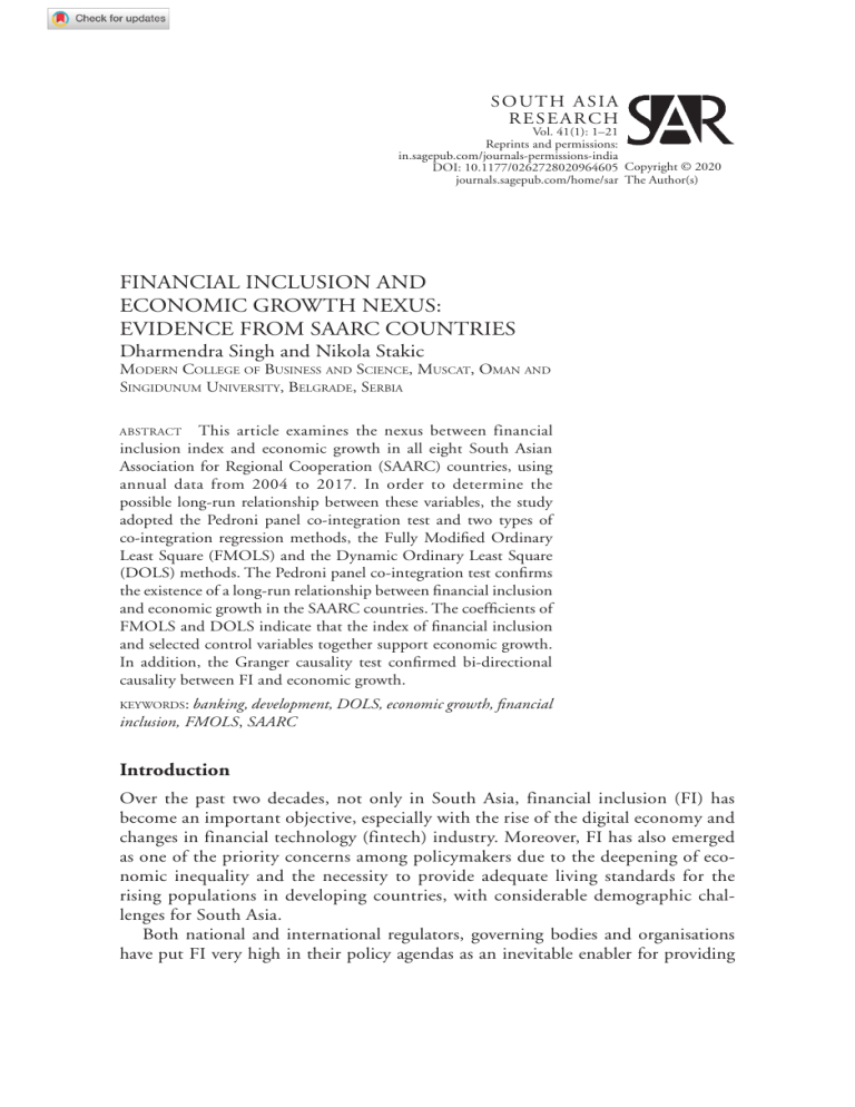 SOUTH ASIA RESEARCH Vol. 41(1): 1–21 Reprints and permissions: in.sagepub.com/journals-permissions-india DOI: 10.1177/0262728020964605 Copyright © 2020 journals.sagepub.com/home/sar The Author(s) FINANCIAL INCLUSION AND ECONOMIC GROWTH NEXUS: EVIDENCE FROM SAARC COUNTRIES Dharmendra Singh and Nikola Stakic Modern College of Business and Science, Muscat, Oman and Singidunum University, Belgrade, Serbia This article examines the nexus between financial inclusion index and economic growth in all eight South Asian Association for Regional Cooperation (SAARC) countries, using annual data from 2004 to 2017. In order to determine the possible long-run relationship between these variables, the study adopted the Pedroni panel co-integration test and two types of co-integration regression methods, the Fully Modified Ordinary Least Square (FMOLS) and the Dynamic Ordinary Least Square (DOLS) methods. The Pedroni panel co-integration test confirms the existence of a long-run relationship between financial inclusion and economic growth in the SAARC countries. The coefficients of FMOLS and DOLS indicate that the index of financial inclusion and selected control variables together support economic growth. In addition, the Granger causality test confirmed bi-directional causality between FI and economic growth. abstract keywords: banking, development, DOLS, economic growth, financial inclusion, FMOLS, SAARC Introduction Over the past two decades, not only in South Asia, financial inclusion (FI) has become an important objective, especially with the rise of the digital economy and changes in financial technology (fintech) industry. Moreover, FI has also emerged as one of the priority concerns among policymakers due to the deepening of economic inequality and the necessity to provide adequate living standards for the rising populations in developing countries, with considerable demographic challenges for South Asia. Both national and international regulators, governing bodies and organisations have put FI very high in their policy agendas as an inevitable enabler for providing 2 South Asia Research Vol. 41(1): 1–21 sustainable and more inclusive economic growth. The increasing importance of FI indicators, especially related to the rise of the digital economy and financial technologies, has meant that policy concerns about economic inequality and adequate living standards demand more attention regarding access of people to electronic banking facilities, in particular. Within the 2030 Sustainable Development Goals of the United Nations, financial inclusion is incorporated as a target in eight of the 17 goals (United Nations, 2014). The United Nations Development Program (UNDP, 2015) has also highlighted the need for a more inclusive financial system as an essential component of structural transformation and the creation of employment opportunities. The World Bank (2018), along with private and public partners, has set ambitious Universal Financial Access (UFA) goals for 2020 to enable 1 billion people to gain access to a transaction account through targeted technical, financial and advisory support, an initiative focusing on 25 priority countries. There are numerous definitions of FI, the common theme being provision of access to basic financial services in the banking, insurance and capital market sectors to households and businesses. Sometimes there is added emphasis on the impact of FI on reducing poverty, improving a society’s livelihood and providing more inclusive economic development, so that FI and its accompanying mechanisms are debated predominantly regarding lower income, developing countries. These constitute the biggest portion of low-level FI indicators. In 2014, the 25 focus countries under the UFA 2020 goal had 73 per cent of the world’s two billion financially excluded (‘unbanked’) population. That number has been reduced in the following three years to 1.7 billion, based on the latest Global Findex Report (Demirguc-Kunt et al., 2018). Greater access to financial services for both individuals and firms may help reduce income inequality and accelerate economic growth (Demirguc-Kunt et al., 2015). Since FI is a multifaceted concept, its positive impact on any specific macroeconomic variable cannot be guaranteed per se. However, greater access to financial services through banking sector penetration, particularly to vulnerable categories, including women, entrepreneurs and rural populations, is widely seen as one of the prerequisites for improving people’s living standards and economic conditions and for national economic and social welfare planning. Supporting evidence has been substantiated since the development of online and mobile banking, with a positive impact on economic growth (Andrianaivo & Kpodar, 2012; Lenka & Barik, 2018). Given existing low scores of FI indicators relative to global standards, FI has become one of the key goals and policies to be addressed in the region of SAARC, the South Asian Association for Regional Cooperation, whose member states are Afghanistan, Bangladesh, Bhutan, India, Nepal, the Maldives, Pakistan and Sri Lanka. Most SAARC countries have already achieved remarkable results in promoting FI as a driver for enhancing living standards and sustainable development of their citizens. Governments and institutions in SAARC countries have adopted various initiatives and strategies to achieve their FI goals (Islam & Imad, 2017). Most of these strategies are focused on basic, supply-side inclusion indicators, given the low penetration levels Singh and Stakic: Financial Inclusion and Economic Growth Nexus 3 of the banking sector. However, much room for improvement remains on the demand side as well, which is showing a lower level of usage indicators especially in the most populous member states, India, Pakistan and Bangladesh. Among a total of 1.7 billion unbanked people worldwide, 20 per cent are situated in those three countries (Demirguc-Kunt et al.