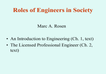 Roles of Engineers in Society Marc A. Rosen • An Introduction to Engineering (Ch. 1, text) • The Licensed Professional Engineer (Ch. 2, text) Chapter 1 An Introduction to Engineering Copyright © 2015 Pearson Canada Inc. 1-2 Outline • • • • A definition of engineering The role of engineers Characteristics of engineering disciplines Engineering in Canada – Distribution of engineers by province – Canadian engineering accomplishments • Skills needed to become an engineer • Engineering challenges faced by society Copyright © 2015 Pearson Canada Inc. 1-3 Copyright © 2015 Pearson Canada Inc. 1-4 What is an Engineer? • Ingenium (Latin) – Talent, genius, cleverness, or native ability – First used to describe those who had ability to invent / operate weapons of war – The word became associated with design / construction of works • Ships, roads, canals, and bridges – People skilled in these fields were non-military or civil engineers Copyright © 2015 Pearson Canada Inc. 1-5 Meaning of Engineering • Engineering means different things: – England: People with practical skills – North America: Person who has received formal training to be an Engineer – Early American programs based on French engineering schools Copyright © 2015 Pearson Canada Inc. 1-6 Professional Engineer • In Canada, the title “professional engineer” is restricted by law. – Only those persons who • Have demonstrated competence • Are licensed by professional licensing association (e.g., PEO, APEGS, etc.) Copyright © 2015 Pearson Canada Inc. 1-7 Definition of an Engineer •An engineer is – A person who uses science, mathematics, experience, and judgement to create, operate, manage, control, or maintain devices, mechanisms, processes, structures, or complex systems. • He/she does this in a rational and economic way with human, societal, and natural resources and environmental constraints. Samuel Florman: “To be human is to engineer.” Copyright © 2015 Pearson Canada Inc. 1-8 The Role of Engineers • Engineering is a team activity. – Engineering teams involve individuals with widely different abilities, interests, and education who cooperate to advance a project. – A typical technical team might consist of • • • • • scientists engineers technologists technicians skilled workers Copyright © 2015 Pearson Canada Inc. 1-9 Research Scientist •Research scientist works on problems – That expand the frontiers of knowledge in a particular field (e.g., smart constructions, smart grid, IT, apps, etc.) – That may not have immediate results or applications until later (e.g., CD) Education – Master’s or PhD degree is usually required (continued) Copyright © 2015 Pearson Canada Inc. 1 - 10 Research Scientist (continued) • Usually supervises research assistants • Usually not a member of a self-regulating profession • Not subject to the same constraints or responsibilities in law as practicing engineers Copyright © 2015 Pearson Canada Inc. 1 - 11 Engineer • Provides the key link between theory and practical applications – – – – Has the needed theoretical background knowledge Able to think creatively Has a knack for obtaining practical results Able to lead a team of multiple disciplines towards a common goal (continued) Copyright © 2015 Pearson Canada Inc. 1 - 12 Engineer (continued) • Education – Basic requirement is a bachelor’s degree from an accredited program – Master’s or PhD is beneficial, often preferred • In Canada, all work that is legally defined as engineering must be performed or supervised by a licensed professional engineer. Copyright © 2015 Pearson Canada Inc. 1 - 13 Technologist • Works under the direction of engineers – Applies engineering principles and methods to complex technical problems • Education – Completion of three-year technology program from a community college • Often supervises work of others and is encouraged to attain qualifications that are recognized by technical societies (continued) Copyright © 2015 Pearson Canada Inc. 1 - 14 Technologist (continued) • Difference between engineering and technologist education – Engineering education typically provides greater theoretical depth. – Technology diploma usually provides more hands-on experience. Copyright © 2015 Pearson Canada Inc. 1 - 15 Technician • Works under the supervision of an engineer or technologist in the practical aspects of engineering – e.g. Making a dye; performing tests and maintaining equipment • Education – Completion of two-year diploma in a program offered by a community college • Association confers title of Certified Engineering Technician; if qualifies (continued) Copyright © 2015 Pearson Canada Inc. 1 - 16 Skilled Worker • Skilled in a trade such as electrician, welder, plumber, carpenter, machinist, etc. – Typically carries out the designs and plans • Has great expertise acquired through formal apprenticeships and/or years of experience. • Most trades have a trade organization and certification procedure Copyright © 2015 Pearson Canada Inc. 1 - 17 Engineering Disciplines • As of 2013, there are 74 different engineering specializations offered in universities across Canada. • Most common disciplines are: Electrical, Mechanical, Civil, Computer, Chemical, and Industrial Engineering • Top five disciplines make up more than 50% Copyright © 2015 Pearson Canada Inc. 1 - 18 Copyright © 2015 Pearson Canada Inc. 1 - 19 Work Typically Performed in Engineering Specialties • Chemical Engineers – Use knowledge of chemistry, physics, biology, and mathematics to: • Design equipment and processes for manufacture of chemicals / chemical products • Design equipment for extraction of minerals, petroleum / other natural resources • Design processes for sustaining / reclaiming natural environment (continued) Copyright © 2015 Pearson Canada Inc. 1 - 20 Work Typically Performed in Engineering