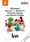 8 Science Quarter 1 – Module 3: Potential Energy and Kinetic Energy CO_Q1_Science8_Module3 Science – Grade 8 Alternative Delivery Mode Quarter 1 – Module 3: Potential Energy and Kinetic Energy First Edition, 2020 Republic Act 8293, section 176 states that: No copyright shall subsist in any work of the Government of the Philippines. However, prior approval of the government agency or office wherein the work is created shall be necessary for exploitation of such work for profit. Such agency or office may, among other things, impose as a condition the payment of royalties. Borrowed materials (i.e., songs, stories, poems, pictures, photos, brand names, trademarks, etc.) included in this module are owned by their respective copyright holders. Every effort has been exerted to locate and seek permission to use these materials from their respective copyright owners. The publisher and authors do not represent nor claim ownership over them. Published by the Department of Education Secretary: Leonor Magtolis Briones Undersecretary: Diosdado M. San Antonio Development Team of the Module Writers: Cheri Madleen T. Samaco Editors: Nonita C. Patalinghug, Rhoda M. Delos Santos Reviewers: Bernabe L. Linog, Relyn D. Raza Illustrator: Rosa Mia L. Pontillo Layout Artist: Celeste Faith R. Almanon, Jay S. Ayap Management Team: Francis Cesar B. Bringas Isidro M. Biol, Jr. Maripaz F. Magno Josephine Chonie M. Obseñares Gregoria T. Su Marvilyn C. Francia Nonita C. Patalinghug Printed in the Philippines by ________________________ Department of Education – Caraga Region Office Address: Telefax: E-mail Address: Teacher Development Center J.P. Rosales Avenue, Butuan City, Philippines 8600 (085)342-8207/(085)342-5969 caraga@deped.gov.ph CO_Q1_Science8_Module3 8 Science Quarter 1 – Module 3: Potential Energy and Kinetic Energy CO_Q1_Science8_Module3 Introductory Message This Self-Learning Module (SLM) is prepared so that you, our dear learners can continue your studies and learn while at home. Activities, questions, directions, exercises, and discussions are carefully stated for you to understand each lesson. Each SLM is composed of different parts. Each part shall guide you step-bystep as you discover and understand the lesson prepared for you. Pre-tests are provided to measure your prior knowledge on lessons in each SLM. This will tell you if you need to proceed on completing this module or if you need to ask your facilitator or your teacher’s assistance for better understanding of the lesson. At the end of each module, you need to answer the post-test to selfcheck your learning. Answer keys are provided for each activity and test. We trust that you will be honest in using these. In addition to the materials in the main text. Notes to the teacher are also provided to our facilitators and parents for strategies and reminders on how they can best help you on your home-based learning. Please use this module with care. Do not put unnecessary marks on any part of this SLM. Use a separate sheet of paper in answering the exercises and texts. And used the instructions carefully before performing the task. If you have any questions in using the SLM or any difficulty in answering the tasks in this module, do not hesitate to consult your teacher or facilitator. Thank you. CO_Q1_Science8_Module3 What I Need to Know This module was designed and written with you in mind. It is here to help you master potential and kinetic energy. The scope of this module permits it to be used in many different learning situations. The language used recognizes the diverse vocabulary level of students. The lessons are arranged to follow the standard sequence of the course. But the order in which you read them can be changed to correspond with the textbook you are now using. After going through this module, you are expected to: 1. Identify and explain the factors that affect potential and kinetic energy. (MELC Week 2-3) 1 CO_Q1_Science8_Module3 What I Know Choose the letter of the correct answer. Write your answers on a separate sheet of paper. 1. An object from a certain height falls freely. Which of the following happens to PE and KE when the object is half on its way down? A. loses PE and gains KE B. gains PE and loses KE C. loses both PE and KE D. gains both PE and KE 2. How do you compare the PE of the moving object at the highest point compared to its KE? A. PE is greater than KE B. PE is equal to KE C. PE is lesser than KE D. KE is greater than PE 3. Which of the following quantities has the greatest influence on the amount of kinetic energy of a car while traveling on a highway? A. mass B. size C. speed D. weight 4. Which of the following pair of quantities are the factors that affect kinetic energy? A. force and distance B. mass and height C. mass and speed D. time and height 2 CO_Q1_Science8_Module3 For Questions 5-6. Refer to the illustration below. 5. Which point has increasing kinetic energy? A. Point C B. Point B C. Point A D. Point A & C 6. Which point has the greatest potential energy? A. Point A B. Point B C. Point C D. Point A & C 7. Which of the following statements is TRUE about potential energy? A. It is dependent on the speed of an object. B. It does not depend on the mass of the object. C. It does not depend on the strength of gravity. D. It is affected by the mass and location of an object with respect to the ground. 8. Which of the following does not affect the amount of potential energy of an object? A. mass B. speed C. height or location D. strength of gravity 3 CO_Q1_Science8_Module3 9. The following applies the concept of potential energy EXCEPT: A. water in a dam B. a person playing the guitar C. a rock sitting at the edge of a cliff D. tree branches high up in a tree 10. What happens to the kinetic energy of an object if its speed is doubled? A. twice as much B. thrice as much C. increases four times D. decreases four times 4 CO_Q1_Science8_Module3 Lesson 1 Potential Energy and Kinetic Energy The word ener