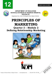 12 SENIOR HIGH SCHOOL PRINCIPLES OF MARKETING Quarter 3 – Module 2 Defining Relationship Marketing Principles of Marketing – Grade 12 Alternative Delivery Mode Quarter 3 – Module 2: Defining Relationship Marketing First Edition, 2020 Republic Act 8293, section 176 states that: No copyright shall subsist in any work of the Government of the Philippines. However, prior approval of the government agency or office wherein the work is created shall be necessary for exploitation of such work for profit. Such agency or office may, among other things, impose as a condition the payment of royalties. Borrowed materials (i.e., songs, stories, poems, pictures, photos, brand names, trademarks, etc.) included in this module are owned by their respective copyright holders. Every effort has been exerted to locate and seek permission to use these materials from their respective copyright owners. The publisher and authors do not represent nor claim ownership over them. Published by the Department of Education Secretary: Leonor Magtolis Briones Undersecretary: Diosdado M. San Antonio Development Team of the Module Writer: Christine G. De Padua Editor: Maria Acenith D. Pastor Reviewer: Salvador G. Aguilar Jr Layout Artist: Bb. Boy Jonnel C. Diaz Management Team: Senen Priscillo P. Paulin, CESO V Rosela R. Abiera Fay C. Luarez, TM, EdD, PhD Maricel S. Rasid Nilita L. Ragay, EdD Elmar L. Cabrera Elisa L. Baguio, EdD Printed in the Philippines by ________________________ Department of Education –Region VII Schools Division of Negros Oriental Office Address: Tele #: E-mail Address: Kagawasan, Ave., Daro, Dumaguete City, Negros Oriental (035) 225 2376 / 541 1117 negros.oriental@deped.gov.ph 12 Principles of Marketing Quarter 3 – Module 2 Defining Relationship Marketing Introductory Message For the facilitator: Welcome to the Grade 12 Principles of Marketing Alternative Delivery Mode (ADM) Module on Defining Relationship Marketing! This module was collaboratively designed, developed and reviewed by educators both from public and private institutions to assist you, the teacher or facilitator in helping the learners meet the standards set by the K to 12 Curriculum while overcoming their personal, social, and economic constraints in schooling. This learning resource hopes to engage the learners into guided and independent learning activities at their own pace and time. Furthermore, this also aims to help learners acquire the needed 21st century skills while taking into consideration their needs and circumstances. In addition to the material in the main text, you will also see this box in the body of the module: Notes to the Teacher This contains helpful tips or strategies that will help you in guiding the learners. As a facilitator, you are expected to orient the learners on how to use this module. You also need to keep track of the learners' progress while allowing them to manage their own learning. Furthermore, you are expected to encourage and assist the learners as they do the tasks included in the module. 2 For the learner: Welcome to the Grade 12 Principles of Marketing Alternative Delivery Mode (ADM) Module on Defining Relationship Marketing! This module was designed to provide you with fun and meaningful opportunities for guided and independent learning at your own pace and time. You will be enabled to process the contents of the learning resource while being an active learner. This module has the following parts and corresponding icons: What I Need to Know What I Know This will give you an idea of the skills or competencies you are expected to learn in the module. This part includes an activity that aims to check what you already know about the lesson to take. If you get all the answers correct (100%), you may decide to skip this module. What’s In This is a brief drill or review to help you link the current lesson with the previous one. What’s New In this portion, the new lesson will be introduced to you in various ways; a story, a song, a poem, a problem opener, an activity or a situation. What is It This section provides a brief discussion of the lesson. This aims to help you discover and understand new concepts and skills. What’s More What I Have Learned What I Can Do This comprises activities for independent practice to solidify your understanding and skills of the topic. You may check the answers to the exercises using the Answer Key at the end of the module. This includes questions or blank sentence/paragraph to be filled in to process what you learned from the lesson. This section provides an activity which will help you transfer your new knowledge or skill into real life situations or concerns. 3 Assessment This is a task which aims to evaluate your level of mastery in achieving the learning competency. Additional Activities In this portion, another activity will be given to you to enrich your knowledge or skill of the lesson learned. Answer Key This contains answers to all activities in the module. At the end of this module you will also find: References This is a list of all sources used in developing this module. The following are some reminders in using this module: 1. Use the module with care. Do not put unnecessary mark/s on any part of the module. Use a separate sheet of paper in answering the exercises. 2. Don’t forget to answer What I Know before moving on to the other activities included in the module. 3. Read the instruction carefully before doing each task. 4. Observe honesty and integrity in doing the tasks and checking your answers. 5. Finish the task at hand before proceeding to the next. 6. Return this module to your teacher/facilitator once you are through with it. If you encounter any difficulty in answering the tasks in this module, do not hesitate to consult your teacher or facilitator. Always bear in mind that you are not alone. We hope that through this material, you will experience meaningful learning and gain deep understanding of the relevant competencies. 