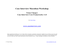 Case Interview Marathon Workshop Victor Cheng’s Case Interview Core Frameworks v1.0 By Victor Cheng www.caseinterview.com These materials provided on an “as is” basis with no warranty or guarantee expressed or implied. You use them at your own risk. This information is provided to you for free for non-commercial use. You are welcome to forward this to your friends provided you do not alter any of the content and keep the entire document in tact. I retain copyright ownership over these materials © Victor Cheng www.caseinterview.com PROFITABILITY FRAMEWORK I'd like to segment units sold into its component parts, do you have any information on the components that drive units sold. We are looking for a segmentation. Tell them you want to segment and then open the door into the way you want to segment as they usually have a way (channel or geographic problem) For the problem branch (e.g., Revenue/Unit or # Units Sold) Both prices have dropped 1) SEGMENT the number, break it up into its component parts, compare to historical metrics to find where the shift is coming from and units shipped 2) ISOLATE the key driver causing bulk of problem 3) EXPLORE possible resolutions Revenue/ Unit Revenue # Units Sold Possible Segments to get data for, isolate & explore: * By product / product line * By distribution channel * By region * By customer type (new/old, big/small) * By industry vertical Once you know mathematically what's causing the problem, you need to understand WHY the number has declined in the context of the marketplace. This may be a "compound framework" problem requiring you to use a general market analysis framework. If so, most often you will want to start with the customer (demand side) analysis and potentially may have to use the entire framework. Profits Fixed Cost Can compare cost/ unit with revenue/ unit, can analyze things on a micro level Profits are down by 10% and 8% of that comes from costs. Let's focus on Cost costs because then have fixed 80% of the problem If manufacturing costs have gone up 40%, and overall costs have gone up 10%, SINCE manufacturing costs have gone up a quarter of the overall costs, its a manufacturing problem. Look at whats driving costs such as labor, equipment Cost/ Unit # Units Sold For problem branch (e.g, fixed or variable cost) SEGMENT into its component parts * Segment cost by logical components * Segment costs by value chain Value Chain Example: creation of product to it being sold Variable Cost Identify fixed costs in each of the following: Raw Materials -> Factory -> Distribution ->Customers Compare to historical. Find the problem component. Keep "drilling down" by finding the problem segment, Tips: and drill down on THAT segment until you ISOLATE 1) Keep drilling down until you isolate the problem what's mathematically causing the majority of the 2) If you realize a branch (or sub-branch) is NOT the problem problem (aka. Find the LEVERAGE point) come up a level and work the remaining branches 3) The name of the game is PROBLEM ISOLATION 4) When "units sold" decline, it's useful to compare the company's numbers to its competitors to determine if it's an industry-wide or company-specific issue (c) Victor Cheng, www.caseinterview.com Free for your personal use, free to distribute freely to others provided content and attribution left unaltered BUSINESS SITUATION FRAMEWORK New Market Entry, New Product, New Business, How to Grow, Strategy, Turnaround, Company Position Assessment Helps understand the demand side Customer Product Who is the customer? have nicknames for segments to help with visualization (qualit and quant) - identify segments (segment size, growth rate, % of total market) - compare current year metrics to historical metrics (look for trends) What does each customer segment want? - identify keys needs What price is each segment willing to pay? - determine price points and price elasticity/sensitivity Distribution channel preference for each segment Customer concentration and power* (does one customer control all the demand, the " Wal-Mart" effect) Nature of product (think out loud about the product, it's benefits, why someone would buy it) Commodity good or easily differentiable goods (could company increase differentiation) rice vs a service Identify complimentary goods (can we piggy back off growth in compliments or near compliments?) Identify substitutes* (are we vulnerable to indirect competitors namely substitutes?) online offerings Determine product's lifecycle (new vs. almost obsolete) kill product sooner rather than later if its soon to be obsolete if not try to fix problem Packaging (optional) - what's bundled, included (ex. Razor vs. razor blades, with w/o service contract... can change in packaging make product more likely to meet needs of specific customer segments.) drop cell phones close to free but bundle service plan, to change market penetration, adoption and sales Capabilities and expertise what are the strengths? Distribution channels used Cost structure (mainly fixed vs. variable - is it better to have higher fixed cost with lower variable, or vice versa. High fixed cost = barrier to entry.... compare to industry, often insightful) low-cost vs high-cost producer How customers want to be served, what distribution Investment cost (optional: only if case involves an investment decision) channels are there Intangibles (e.g., brands, brand loyalty) emotional connection is hard to fix If out of sync with what Financial situation customer wants what do Organizational structure (optional: e.g., is team organization in conflict with how customers want to do business. we do about it Ex: We're organized by product line, but customers want one point of contact across all product lines) Company then competitive dynamics are vastly different in those situations Competition Ask company questions to competitors? Competitor Concentration* & Structure (monopoly, oligopoly, competitive, market share concetration) Competitor be