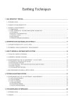 Earthing Techniques 1. SOIL RESISTIVITY TESTING.................................................................................................................................... 1.1 INTRODUCTION................................................................................................................................................................. 1.2 THEORY OF SOIL RESISTIVITY...................................................................................................................................... 1.3 MAKING A MEASUREMENT ........................................................................................................................................... 1.3.1 PRINCIPLES...............................................................................................................................................................4 1.3.2 SOIL RESISTIVITY TESTING PROCEDURE GUIDELINES .................................................................................. (a) Test Method.................................................................................................................................................................. (b) Selection of Test Method Type .................................................................................................................................... (c) Traverse Locations. ...................................................................................................................................................... (d) Spacing Range.............................................................................................................................................................. (e) Practical Testing Recommendations.........................................................................................................................10 2. INTERPRETATION AND MODELLING OF RESULT ...........................................................................................11 2.1 APPARENT RESISTIVITY CALCULATION................................................................................................................11 2.2 INTERPRETATION OF RESISTIVITY MEASUREMENT...........................................................................................12 3. HOW TO DESIGN A LIGHTNING EARTH SYSTEM ............................................................................................14 3.1 TYPES OF EARTH ELECTRODES ................................................................................................................................14 3.2 COMMON EARTHING SYSTEMS ................................................................................................................................14 3.3 EARTH RESISTANCE OF AN ELECTRODE - CALCULATION................................................................................16 3.3.1 Rods Driven Vertically into the Ground....................................................................................................................16 3.3.2 Rod Electrodes in Parallel .........................................................................................................................................16 3.3.3 Trench Electrodes - Horizontal Electrodes buried under the Surface........................................................................17 3.3.4 Radial Conductors .....................................................................................................................................................18 3.3.5 Ground-grid Mesh Electrodes....................................................................................................................................19 3.4 RECOMMENDED MATERIAL APPLICATIONS.........................................................................................................19 4. TESTING AN EARTHING SYSTEM ......................................................................................................................21 4.1 EARTH RESISTANCE OF AN ELECTRODE - MEASUREMENT..............................................................................21 4.1.1 Fall of Potential Method ............................................................................................................................................22 4.1.2 The 62% Method .......................................................................................................................................................24 4.1.3 Other Test Methods ...................................................................................................................................................24 (a) The Slope Method ....................................................................................................................................................24 (b) The Star-Delta Method.............................................................................................................................................24 (c) The Four Potential Method.......................................................................................................................................25 5. THE SIGNIFICANCE OF IMPEDANCE .................................................................................................................26 5.1 INTRODUCTION.............................................................................................................................................................26 5.2 THEORY...........................................................................................................................................................................27 Earthing Fundamentals Lightning & Surge Technologies 5.2.1 Impulse Testing And The Transient Response ..........................................................................................................27 5.2.2 Assessing the transient performance of an earthing system .........................................................