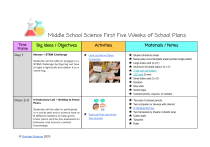 Middle School Science First Five Weeks of School Plans Time Frame Day 1 Big Ideas / Objectives Names + STEM Challenge Activities ★ Challenge Students will be able to engage in a STEM challenge by figuring out how to light a light bulb and attach it to a name tag. Days 2-3 Light Up Name Plates Introductory Lab + Getting to Know Peers Students will be able to participate in a social task and a science task at 8 different stations to help get to know peers and be pre-assessed on behavior and science content knowledge. © Sunrise Science 2023 ★ Gab Lab First Lab of the Year Activity Materials / Notes ★ Student directions sheet ★ Name plate circuit template sheet (printed single-sided) ★ Large index card (4 x 6”) ★ Aluminum foil sheet (about 12 x 4”) ★ 3 Volt coin cell battery ★ LED light (5 mm) ★ Small index card (3 x 5”) ★ Scissors ★ Glue stick ★ Scotch tape ★ Colored pencils, crayons, or markers ★ Two sets of colored pencils ★ Two computers or devices with internet ★ A "drinking bird" toy ★ Two transparency sheets or plastic wrap ★ Cotton balls ★ Twizzlers ★ Ruler ★ Triple beam balance or scale ★ Two stopwatches Days 4-5 Getting to Know You ★ Brown Bag Biographies ★ Your own “Brown Bag” filled with 5-10 items that represent Activity Students will be able to choose three words and four items that represent who they are. ★ ★ SWBAT use basic computer skills to insert images of their chosen items onto a Google Slide. unique things about you. For example, in my bag: photo of my husband and kids, crochet hook, passport holder, seashell, lavender, my favorite novel, chemistry flask Students need computer/Google Apps access Have students present their Brown Bag biographies tomorrow! SWBAT present their Brown Bag Biography to the class or small groups of peers. Day 6 Classroom Procedures Students will be able to explain the procedures and expectations of the class. Days 7-8 Science Career Research SWBAT research a science career and design a t-shirt to showcase the education, skills, and job of a person in that career. © Sunrise Science 2023 ★ ★ Doodle Syllabus ★ Science Career Research Bellwork Procedure and T-Shirt Design Project ★ Printed or digitally-delivered syllabus ★ Bellwork board for the day ★ Optional: Blooket game on class procedures as review ★ Printed student project directions and career list ★ New or used-turned-inside-out T-shirts OR shirt templates ★ printed on paper I suggest having students complete their career research and brainstorm sketches/how they will design their shirts in class and do the actual T-shirt decorating at home. Have students bring their decorated shirts into school on a specific due date that can be your ‘Science Career Fashion Show Day’ (Day 12) Day 9 Lab Safety Students will be able to draw a labeled scientific diagram. SWBAT explain the reasoning behind safety rules in the laboratory. ★ Note: If the following lab equipment is not available to ★ ★ Gummy Bear Demo Lab Safety Rules Poster Project you, you can show this video instead while going over the names of the lab equipment and safety precautions! Even if you don’t use all of this type of equipment in your curriculum, it’s still exciting for students to see this reaction. The other focus of this activity is drawing and labeling a scientific diagram– this means labeling everything! You can stress this as a main point as hopefully students will be modeling a lot throughout the school year. ★ Pair of goggles ★ Ring stand ★ Test tube clamp ★ Large test tube ★ Tongs ★ Bunsen burner and tubing ★ Striker to light Bunsen burner ★ Scoopula (to scoop powdered chemical) ★ Potassium Chlorate ★ Gummy bears ★ White paper ★ Colored pencils, crayons, or markers ★ Optional: Student computers for digital activity Day 10 Science Process © Sunrise Science 2023 ★ Mystery Solutions Challenge ★ white vinegar ★ 2% baking soda solution (mix 4 grams of baking soda into Students will be able to solve a mini chemistry puzzle with a partner without speaking or being able to see one another. 200 mL of water) ★ 2% Alum (aluminum potassium sulfate) solution– you can ★ ★ ★ ★ ★ ★ Day 11 Emailing a Teacher Students will be able to write a properly formatted and polite email to the teacher. (This will be helpful to you ALL year!) Day 12 ★ Emailing a Teacher Mini-Lesson (scroll down to #4) get Alum in the spices aisle of the grocery store or from Amazon (mix 4 grams of Alum into 200 mL of water) You will need enough cassette cases so each student has one (I have 24 students in my largest class so I prepped 12 pairs, or 24 total cases) thin-stem pipettes (cut off most of the stem) Sharpie marker to label the pipette bulbs and the case pairs about 5 acetate sheets (transparency sheets) some sort of cardboard dividers to place between students so partners can’t see one another during the activity Printed student sheets or digitally delivered version ★ Student computers and access to email ★ In their emails, you could have students write goals for their school year and tell you how they’ve been enjoying school so far. What activities have they liked best so far? What do they want you to know about them as a student? Science Career Fashion Show Day! ★ Host the Science Career Research Project Fashion Show! Roll out a red carpet, invite other teachers and administrators to pop in, provide a small snack, and have students take turns walking the red carpet and telling about their science career! Take photos to show on Back to School Night! © Sunrise Science 2023 Day 13 Scientific Theories and Laws ★ Laws Activity (scroll down to #5) Students will be able to simulate the evolution of a scientific theory and differentiate between scientific theories and laws. Day 14 Lab Equipment ★ Students will be able to become familiar with the names and uses of common laboratory equipment. Day 15 Makin