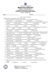 Republic of the Philippines Department of Education Region II – CAGAYAN VALLEY SCHOOLS DIVISION OF SANTIAGO CITY SANTIAGO CITY NATIONAL HIGH SCHOOL Calaocan, Santiago City NAME:____________________________ SECTION:___________________________ PRE – TEST for COOKERY 7 Multiple Choice. Choose the letter of the correct answer. 1. What kitchen appliance is used to cook or prepare various foods with steam heat? a. Food Steamer b. Pressure Cooker c. Food Strainer d. Food Keeper 2. What do you call this airtight cooking device that cook food quickly, thanks to the steam pressure that builds up inside? A. Pressure Cooker b. Teflon c. Food Steamer d. Wok 3. Used in a range of Chinese cooking techniques, what kind of cooking materials is this? a. Fry Pan b. Wok c. Kettle d. Casserole 4. What kind of a cooking material this metal vessel, with a flat bottom, used to heat water on a stove top or hob? a. Teflon b. Kettle c. Fry Pan d. Wok 5. What is this wooden or plastic board where meat, fruits, and vegetable are cut? a. Cutting board b. Strainer c. Graters d. Kitchen Shears 6. They are made of stainless steel with sharp double blade that swivels, used to scrape vegetables, what is this kind of kitchen tools? A. Grater b. Vegetable Peeler c. Kitchen Shears d. Kitchen knives 7. What is this kind of kitchen tools used for mashing cooked potatoes, turnips, and carrots? a. Vegetable Peeler b. Potato Masher c. Graters d. Serving Tongs 8. A kind of kitchen tools that used to remove bits of foods on side of the bowl? a. Serving spoons b. Serving Tongs c. Rubber Scrapper d. Potato Masher 9. What do you call a hard wood made which are used for creaming, stirring and mixing? a. Rubber Scrapper b. Wooden Spoon c. Whisks d. Spoons 10. This is used to level off ingredients when measuring and to spread frostings and sandwich filling, what is this kind of kitchen tools? a.Fork b. Spoon c. Spatula d. Wooden Spoon 11. What kind of kitchen tools this essential for various tasks from cleaning vegetables to staining pasta or tin contents? A. Colander b. Food Strainer c. Funnels d. Whisks 12. What is this serving of soft foods, such as fillings ice cream and mashed potatoes? a. Spoon b. Scoop c. Spatula d. Wooden Spoon 13. What do you call this metal or plastic used to shake flour, salt, and pepper on meat, poultry, and fish? a. Dredgers b. Spoon c. Whisks d. Spatula 14. What is this kind of transparent glass or plastic used for measuring ingredients? a. Graduated Cup b. Measuring glass c. Colander d. Wooden Spoon 15. What do you call this set of spoons with different sizes for measuring small quantities of ingredients? a. Spatula b. Wooden Spoon c. Measuring Spoons d. Spoon 16. This is a kind of weighing scales that weigh large quantity of ingredients in kilos? a. Household Scales b. Weighing Scales c. Measuring Scales d. Balance -Beam Scales 17. What is this necessary in preventing bacterial infections from foods equipped with temperature for food storage? a. Ice Box b. Refrigerators c. Ice Cooler d. None of these Address: SICAT Rd., Calaocan, Santiago City 3311 Telephone No.: (078) 305-0110 Email Address: scnhs_02@yahoo.com Republic of the Philippines Department of Education Region II – CAGAYAN VALLEY SCHOOLS DIVISION OF SANTIAGO CITY SANTIAGO CITY NATIONAL HIGH SCHOOL Calaocan, Santiago City 18. This is an equipment used to chop, blend, mix, whip, puree, grate and liquefy all kinds of food? a.Blenders b. Microwave oven c. Rice Cooker d. Ice Box 19. What do you call this kind of equipment with a chamber or compartment used for cooking, baking, heating or drying? a. Refrigerators b. Microwave Oven c. Oven d. Rice Cooker 20. Which of the following is an automated kitchen appliance designed to boil or steam rice? a. Microwave Oven b. Blenders c. Rice Cooker d. Oven Toaster Address: SICAT Rd., Calaocan, Santiago City 3311 Telephone No.: (078) 305-0110 Email Address: scnhs_02@yahoo.com Republic of the Philippines Department of Education Region II – CAGAYAN VALLEY SCHOOLS DIVISION OF SANTIAGO CITY SANTIAGO CITY NATIONAL HIGH SCHOOL Calaocan, Santiago City NAME:____________________________ SECTION:___________________________ TECHNOLOGY & LIVELIHOOD EDUCATION-7 PRETEST / POSTTEST Multiple Choice. Choose the letter of the correct answer. 1.What is this kitchen appliance used to cook or prepare various foods with steam heat? a. Food Steamer b. Pressure Cooker c. Food Strainer d. Food Keeper 2.What do you call this airtight cooking device that cook food quickly, thanks to the steam pressure that builds up inside? A. Pressure Cooker b. Teflon c. Food Steamer d. Wok 3.Used in a range of Chinese cooking techniques, what kind of cooking materials is this? a.Fry Pan b. Wok c. Kettle d. Casserole 4. What kind of a cooking material this metal vessel, with a flat bottom, used to heat water on a stovetop or hob? A.Teflon b. Kettle c. Fry Pan d. Wok 5. What is this wooden or plastic board where meat, fruits, and vegetable are cut? a. Cutting board b. Strainer c. Graters d. Kitchen Shears 6. They are made of stainless steel with sharp double blade that swivels, used to scrape vegetables, what is this kind of kitchen tools? A.Graters b. Vegetable Peeler c. Kitchen Shears d. Kitchen knives 7. What is this kind of kitchen tools used for mashing cooked potatoes, turnips, and carrots? a. Vegetable Peeler b. Potato Masher c. Graters d. Serving Tongs 8.A kind of kitchen tools that used to remove bits of foods on side of the bowl? a.Serving spoons b. Serving Tong c. Rubber Scrapper d. Potato Masher 9. What do you call a hard wood made which are used for creaming, stirring and mixing? a. Rubber Scrapper b. Wooden Spoon c. Whisks d. Spoons 10.This is used to level off ingredients when measuring and to spread frostings and sandwich filling, what is this kind of kitchen tools? a.Fork b. Spoon c. Spatula d. Wooden Spoon 11. When in the best time to clean all the tools, equipment and paraphernalia? a. In the morning b. Before using them c. after