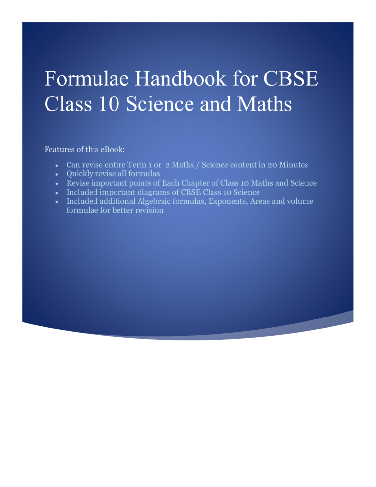 Formulae Handbook for CBSE Class 10 Science and Maths