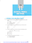 Unit 11 AL COHOL S, PHENOL S ALCOHOL COHOLS, PHENOLS AND ETHER S ETHERS I. Multiple Choice Questions (Type-I) 1. Monochlorination of toluene in sunlight followed by hydrolysis with aq. NaOH yields. (i) (ii) (iii) (iv) 2. How many alcohols with molecular formula C4H10O are chiral in nature? (i) (ii) (iii) (iv) 3. o-Cresol m-Cresol 2, 4-Dihydroxytoluene Benzyl alcohol 1 2 3 4 What is the correct order of reactivity of alcohols in the following reaction? ZnCl 2 R—OH + HCl → R—Cl + H2O (i) (ii) (iii) (iv) 4. 1° 1° 3° 3° > < > > 2° 2° 2° 1° > > > > 3° 3° 1° 2° CH3CH2OH can be converted into CH3CHO by ______________. (i) (ii) catalytic hydrogenation treatment with LiAlH4 23/04/18 Click on this link to buy latest Educart Books on Amazon - https://amzn.to/3OwEosm 5. 6. 7. 8. 9. (iii) treatment with pyridinium chlorochromate (iv) treatment with KMnO4 The process of converting alkyl halides into alcohols involves_____________. (i) addition reaction (ii) substitution reaction (iii) dehydrohalogenation reaction (iv) rearrangement reaction Which of the following compounds is aromatic alcohol? (i) A, B, C, D (ii) A, D (iii) B, C (iv) A Give IUPAC name of the compound given below. (i) 2-Chloro-5-hydroxyhexane (ii) 2-Hydroxy-5-chlorohexane (iii) 5-Chlorohexan-2-ol (iv) 2-Chlorohexan-5-ol IUPAC name of m-cresol is ___________. (i) 3-methylphenol (ii) 3-chlorophenol (iii) 3-methoxyphenol (iv) benzene-1,3-diol IUPAC name of the compound (i) 1-methoxy-1-methylethane (ii) 2-methoxy-2-methylethane is ______________. 155 Alcohols, Phenols and Ethers 23/04/18 Click on this link to buy latest Educart Books on Amazon - https://amzn.to/3OwEosm (iii) 2-methoxypropane (iv) isopropylmethyl ether 10. Which of the following species can act as the strongest base? (i) (ii) (iii) V OH V OR V O C6H5 (iv) 11. Which of the following compounds will react with sodium hydroxide solution in water? (i) C6H5OH (ii) C6H5CH2OH (iii) (CH3)3 COH (iv) C2H5OH 12. Phenol is less acidic than ______________. (i) ethanol (ii) o-nitrophenol (iii) o-methylphenol (iv) o-methoxyphenol 13. Which of the following is most acidic? (i) Benzyl alcohol (ii) Cyclohexanol (iii) Phenol (iv) m-Chlorophenol 14. Mark the correct order of decreasing acid strength of the following compounds. Exemplar Problems, Chemistry 156 23/04/18 Click on this link to buy latest Educart Books on Amazon - https://amzn.to/3OwEosm (i) (ii) (iii) (iv) e>d>b>a>c b>d>a>c>e d>e>c>b>a e>d>c>b>a 15. Mark the correct increasing order of reactivity of the following compounds with HBr/HCl. (i) (ii) (iii) (iv) a<b<c b<a<c b<c<a c<b<a 16. Arrange the following compounds in increasing order of boiling point. Propan-1-ol, butan-1-ol, butan-2-ol, pentan-1-ol (i) (ii) (iii) (iv) Propan-1-ol, butan-2-ol, butan-1-ol, pentan-1-ol Propan-1-ol, butan-1-ol, butan-2-ol, pentan-1-ol Pentan-1-ol, butan-2-ol, butan-1-ol, propan-1-ol Pentan-1-ol, butan-1-ol, butan-2-ol, propan-1-ol II. Multiple Choice Questions (Type-II) Note : In the following questions two or more options may be correct. 17. Which of the following are used to convert RCHO into RCH2OH? (i) H2/Pd (ii) LiAlH4 (iii) NaBH4 (iv) Reaction with RMgX followed by hydrolysis 18. Which of the following reactions will yield phenol? (i) 157 Alcohols, Phenols and Ethers 23/04/18 Click on this link to buy latest Educart Books on Amazon - https://amzn.to/3OwEosm (ii) (iii) (iv) 19. Which of the following reagents can be used to oxidise primary alcohols to aldehydes? (i) (ii) (iii) (iv) CrO3 in anhydrous medium. KMnO4 in acidic medium. Pyridinium chlorochromate. Heat in the presence of Cu at 573K. 20. Phenol can be distinguished from ethanol by the reactions with _________. (i) Br2/water (ii) Na (iii) Neutral FeCl3 (iv) All the above 21. Which of the following are benzylic alcohols? (i) C6H5—CH2—CH2OH (ii) C6H5—CH2OH (iii) (iv) III. Short Answer Type 22. What is the structure and IUPAC name of glycerol? Exemplar Problems, Chemistry 158 23/04/18 Click on this link to buy latest Educart Books on Amazon - https://amzn.to/3OwEosm 23. Write the IUPAC name of the following compounds. (A) (B) 24. Write the IUPAC name of the compound given below. 25. Name the factors responsible for the solubility of alcohols in water. 26. What is denatured alcohol? 27. Suggest a reagent for the following conversion. 28. Out of 2-chloroethanol and ethanol which is more acidic and why? 29. Suggest a reagent for conversion of ethanol to ethanal. 30. Suggest a reagent for conversion of ethanol to ethanoic acid. 31. Out of o-nitrophenol and p-nitrophenol, which is more volatile? Explain. 32. Out of o-nitrophenol and o-cresol which is more acidic? 33. When phenol is treated with bromine water, white precipitate is obtained. Give the structure and the name of the compound formed. 34. Arrange the following compounds in increasing order of acidity and give a suitable explanation. Phenol, o-nitrophenol, o-cresol 35. Alcohols react with active metals e.g. Na, K etc. to give corresponding alkoxides. Write down the decreasing order of reactivity of sodium metal towards primary, secondary and tertiary alcohols. 36. What happens when benzene diazonium chloride is heated with water? 37. Arrange the following compounds in decreasing order of acidity. H2O, ROH, HC ≡ CH 38. Name the enzymes and write the reactions involved in the preparation of ethanol from sucrose by fermentation. 39. How can propan-2-one be converted into tert- butyl alcohol? 40. Write the structures of the isomers of alcohols with molecular formula C4H10O. Which of these exhibits optical activity? 159 Alcohols, Phenols and Ethers 23/04/18 Click on this link to buy latest Educart Books on Amazon - https://amzn.to/3OwEosm 41. Explain why is OH group in phenols more strongly held as compared to OH group in alcohols. 42. Explain why nucleophilic substitution reactions are not very common in phenols. 43. Preparation of alcohols from alkenes involves the electrophilic attack on alkene carbon atom. Expla