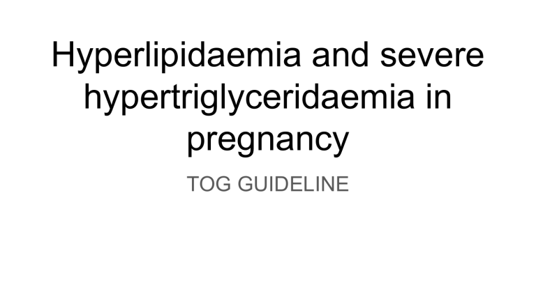 Hyperlipidaemia and severe hypertriglyceridaemia in pregnancy TOG GUIDELINE Learning objectives ● To understand the physiological changes that occur in lipids in pregnancy and how these are modulated. ● To appreciate the importance of severe HC and HTG in pregnancy, including their effects on maternal morbidity and mortality. ● To understand the various approaches to management and the importance of multidisciplinary management. Normal physiology INSULIN SENSITIVITY IN FIRST HALF OF PREGNANCY INSULIN RESISTANCE IN SECOND HALF Lipid levels increase by about 30–50%, while TGs increase 2-4-fold. Postpartum, cholesterol levels fall rapidly to prepregnant and first trimester levels by 72 hours.normal ranges of TG in pregnancy - Severe gestational hypertriglyceridaemia (sHTG) is defined as TG levels in the 95th centile or above, or values greater than 11.4 mmol/L. - This rise i( total cholesterol (TC) levels rise by 30–50%) is termed physiological hypercholesterolaemia. - In some women, especially those with familial hypercholesterolaemia (FH; characterised as an autosomal dominant condition in which individuals have LDL receptor deficiency), however, the rise is above the physiological range (i.e., exceeding 8 mmol/L). This above-normal rise is termed maternal supraphysiological hypercholesterolaemia (MSPH). Risk factors 1)poor metabolic control 2) metabolic syndrome and obesity 3) alcoholism and drugs (for example, corticosteroids, beta-blockers and antipsychotics). 4) familial chylomicronaemia syndrome (FCS) or familial HTG37 and rare mutations in the LPL, APO E, APO C2, and APO A5 genes, which cause chylomicronaemia in pregnancy. Impact of elevated lipids on pregnancy complications 1) 2) 3) 4) 5) 6) GDM LGA PE SGA Pancreatitis Hyperviscosity syndrome GDM ● ● ● ● ● ● ● ● GDM is associated with higher levels of TG than those in women without GDM. Changes in lipoproteins, in most cases, precede the diagnosis of GDM, raising the possibility of a cause–effect relationship. TG levels greater than 1.58 mmol/L correlated with a higher risk of GDM, while HDL levels greater than 2.2 mmol/L were associated with a lower risk of GDM. Data from the UPBEAT (UK Pregnancies Better Eating and Activity Trial) study showed that alterations in lipids metabolism and a rise in TG levels occur at least 10 weeks before diagnosing GDM. A metaanalysis demonstrated that in women with GDM, TG levels rise in the first trimester and persist thereafter. Nevertheless, the changes in lipid metabolism and GDM have two common causes: obesity and insulin resistance. High levels of TG result from excessive lipolysis, primarily associated with insulin resistance. High levels of FFA and TG also worsen insulin resistance and reduce insulin secretion, resulting in hyperglycaemia. Hence, it is reasonable to conclude that elevated TGs are one of the mediators of GDM. LGA ● ● ● ● ● ● Hiigher maternal TG levels are expected to result in higher fetal TG levels and, therefore, higher fat stores women with TG levels in the higher tertial (greater than 1.2 mmol/L) gave birth to infants with higher weight and had a higher risk of large for gestational age for every 1 unit increase in TG levels, the risk of LGA and macrosomia were increased by 13% and 19%, respectively. Further evidence in support of this association comes from diabetic pregnancies. Despite an improvement in the care of women with diabetes in pregnancy, achieving normal glucose levels has not reduced the rates of maternal and fetal complications in some cases, including LGA. TG levels are critical in these complications and appear to be the strongest predictor of fetal weight in women with diabetes during pregnancy. Olmos et al. showed that in women with GDM, TG levels were partially responsible for LGA despite good glycaemic control. Barbour et al.reported that postprandial TG but not glucose predicted the newborn fat percentage. Similar results were seen in women with preexisting type 1 and type 2 diabetes mellitus. Most women with diabetes in pregnancy are treated with insulin, which reduces lipolysis and TG levels, yet insulin resistance seems to attenuate the effect of insulin on lipids metabolism in this case PRE ECLAMPSIA ● abnormal placental vasculature, impaired spiral artery remodelling and reduced placental perfusion resulting in placental ischaemia. The ischaemic placenta releases inflammatory cytokines and antiangiogenic factors, resulting in widespread endothelial dysfunction and vasoconstriction ● Those with TG in the upper quartile had a higher risk of pre-eclampsia than those in the lower quartile. ● every 1 standard deviation decrement in TG levels, the risk of SGA is increased by 20%, and for each 1-unit increment, the risk of LGA increased by 13%. ● TG levels were higher in women with SGA and LGA SGA ● SGA, which Is pathological in most cases, results from placenta insufficiency. Indeed about 75% of SGA could be explained by abnormal placental development. ● can be a complication of pre-eclampsia or secondary to the same placental pathology that results in preeclampsia. ● SGA has been shown to correlate with both high and low TG levels. ● Kaneko et al. confirmed that for every 1 standard deviation decrement in TG levels, the risk ● of SGA is increased by 20%, and for each 1-unit increment, the risk of LGA increased by 13%. However, it is hypothetically conceivable that the same pre-existing lipid abnormalities linked to pre-eclampsia can result in SGA. Hence, it is theoretically plausible that SGA may result from either pre-gravid high TG levels or a lack of rise in TG levels in the third trimester. Pancreatitis ● ● ● ● ● ● ● ● ● Acute pancreatitis is a rare complication in pregnancy with an incidence of 1/1000 to 3/10000. It is more commonly experienced in the third trimester in multiparous women. Hypertriglyceridaemia-induced acute pancreatitis (HIAP) accounts for up to 58% of 