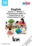 10 English Quarter 1 – Module 2: Determining the Effect of Textual Aids on the Understanding of a Text CO_Q1_English10_ Module 2 English – Grade 10 Alternative Delivery Mode Quarter 1 – Module 2: Determining the Effect of Textual Aids on the Understanding of a Text First Edition, 2021 Republic Act 8293, section 176 states that: No copyright shall subsist in any work of the Government of the Philippines. However, prior approval of the government agency or office wherein the work is created shall be necessary for exploitation of such work for profit. Such agency or office may, among other things, impose as a condition the payment of royalties. Borrowed materials (i.e., songs, stories, poems, pictures, photos, brand names, trademarks, etc.) included in this module are owned by their respective copyright holders. Every effort has been exerted to locate and seek permission to use these materials from their respective copyright owners. The publisher and authors do not represent nor claim ownership over them. Published by the Department of Education Secretary: Leonor Magtolis Briones Undersecretary: Diosdado M. San Antonio Development Team of the Module Writer: Darielle Apilas-Bacayan Editor: Patricio Dawaton – Regional EPS-English Reviewer: Lillian S. Pagulongan – Division EPS-English Management Team: Estela L. Cariño, EdD, CESO III - Regional Director Carmel F. Meris – Chief Education Supervisor - CLMD Rosita C. Agnasi, Ed.D. – Regional EPS-LRMDS Benjamin Dio-al – Regional ADM Focal Person Juliet H. Sannad, Ed.D. – Chief Education Supervisor, CID, SDO-Baguio Armi Victoria A. Fiangaan – Division EPS-LRMDS Printed in the Philippines by ________________________ Department of Education – Cordillera Administrative Region Office Address: Telefax: E-mail Address: Wangal, La Trinidad, Benguet (074)-422-4074 car@deped.gov.ph 10 English Quarter 1 – Module 2: Determining the Effect of Textual Aids on the Understanding of a Text Introductory Message This Self-Learning Module (SLM) is prepared so that you, our dear learners, can continue your studies and learn while at home. Activities, questions, directions, exercises, and discussions are carefully stated for you to understand each lesson. Each SLM is composed of different parts. Each part shall guide you step-bystep as you discover and understand the lesson prepared for you. Pre-tests are provided to measure your prior knowledge on lessons in each SLM. This will tell you if you need to proceed on completing this module or if you need to ask your facilitator or your teacher’s assistance for better understanding of the lesson. At the end of each module, you need to answer the post-test to self-check your learning. Answer keys are provided for each activity and test. We trust that you will be honest in using these. In addition to the material in the main text, Notes to the Teacher are also provided to our facilitators and parents for strategies and reminders on how they can best help you on your home-based learning. Please use this module with care. Do not put unnecessary marks on any part of this SLM. Use a separate sheet of paper in answering the exercises and tests. And read the instructions carefully before performing each task. If you have any questions in using this SLM or any difficulty in answering the tasks in this module, do not hesitate to consult your teacher or facilitator. Thank you. What I Need to Know This module was designed and written with you in mind. Primarily, its scope is to teach you how to use textual aids and realize its effect in your understanding of a certain text. While going through this module, you are expected to have: 1. use various textual aids in understanding a text; and 2. determine the effect of these textual aids in understanding a text. What I Know Activity 1: Multiple Choice: Choose the letter of the best answer. Write the chosen letter on your answer sheet. 1. What do we call the tools that come in different forms and their main objective is to help readers have a clearer meaning of the given text? a. textual aids c. textual explanations b. guide questions d. reader’s interpretations 2. Which of the following does NOT belong to the tools that can help readers have a clearer meaning? a. graphs c. animations b. diagrams d. illustrations 3. If the sensory images help readers understand literary texts such as poems and short stories, then which type of texts do textual aids help readers understand? i. fictional texts ii. scientific texts iii. nonfiction texts iv. journalistic texts a. i and ii c. ii, iii and iv b. iii and iv d. i, ii, iii and iv 1 CO_Q1_English10_ Module 2 4. If the text has the following lines: “From Session Road, head south on Upper Session Road, slight right onto Kalaw Street…”, what kind of textual aid will be best fitted to match the text? a. title c. graph b. map d. illustration 5. Why do writers include titles, subtitles, graphs, maps, images and tables in their articles? a. to serve as a guide for the readers’ eyes in reading the text b. to help readers better understand the content c. to provide an interpretation of the text d. to fill the spaces of the paper 6. What type of textual aid is used when data are presented in rows and columns of words and numbers? a. title and illustration c. table b. subtitle and graph d. map 7. Which is the main use of a table as a textual aid? a. show trends or patterns b. show relationships of data c. for interpreting numerical data d. for comparison of characteristics 8. What type of textual aid is used if data is presented through dots, lines and curves? a. illustration c. table b. graph d. map 9. What do we want to show when we use graphs? a. get a better idea on trends and patterns b. show more detailed information c. compare and contrast qualities d. record precise data 10. Which is NOT an example of a graph? a. pie b. bar c. line d. cycle 11. Which textual aid is a visual representation of selected characteristics of 