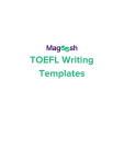 TOEFL Writing Templates Table of Contents Click the links to jump to that section! The Magoosh Team What is Magoosh? How to Use Templates Integrated Essay Phrases for the Integrated Essay Sample Essay Independent Essay Phrases for the Independent Essay Sample Essay Additional Resources Study Plans [eBook] Magoosh’s Guide to the TOEFL iBT Vocabulary Resources Infographics Book Reviews toefl.magoosh.com 2 The Magoosh Team Who is Magoosh? We are a group of passionate educators in Berkeley, California. Email us at help@magoosh.com if you have any questions, comments, or suggestions! toefl.magoosh.com 3 What is Magoosh? Magoosh is an online TOEFL prep course that offers: ● ● ● ● ● ● over 100 TOEFL video lessons 300+ practice questions material created by expert tutors e-mail support personalized statistics based on performance access anytime, anywhere from an internet-connected device Featured in toefl.magoosh.com 4 Why Our Students Love Us These are survey responses sent to us by students after they took the TOEFL. All of these students and many more have used the Magoosh TOEFL prep course to improve their scores! toefl.magoosh.com 5 How to Use Templates First, a note on the word “template.” You may be looking for a full response that you can memorize, simply adding in small details as you write. Unfortunately, that’s not a good idea. If you memorize whole sentences that other students also memorized and used, you will get a 0 on the writing section. You cannot simply give a whole answer from memory. But you can use specific words and phrases to structure your essays. If you know a few phrases to start your response, a few to move on to the next idea, and a few to end each thought, then you can better organize your essays. Well organized essays score more highly because they’re easier to understand. So learn the words and phrases we provide you, and start using them in your TOEFL writing practice. The more you practice using them, the easier they will be to remember and use on test day. After the key phrases for each task, there is a sample essay that shows one way you could use the phrases. That will help you to understand the overall structure of your answers. Happy studying! Lucas Magoosh TOEFL Expert toefl.magoosh.com 6 Integrated Essay The first TOEFL essay is “integrated,” which means it includes listening and reading, not just writing. You have to first read a short article (around 300 words in three minutes), then listen to a short lecture (around 2 minutes). In both the reading and the lecture, you will hear three clearly separate points. They are often listed, using words like “first,” and “second.” The same ideas will be addressed in both the reading and the lecture, but they will disagree with each other. (Sometimes, they agree with each other but this is rare). In order to write a good essay, you need to make clear the differences between the reading and the lecture, and clearly separate the three points that are addressed. Although it is possible to write a conclusion to this essay, it is unnecessary, so we will not include summary phrases in this part. Phrases for the Integrated Essay Naming the source ● ● ● ● According to [the text/professor]… The [text/professor] says that… The [text/professor] states that… In the [lecture], it was said that… Listing ● ● ● ● ● ● ● ● ● ● ● …, for one. First,… Second,… The first point that the professor makes is… , The second point [he/she] addresses is… Besides that,… Moreover,… What’s more,… Next,… There’s also the fact that… Furthermore,… Additionally,… Finally,… Giving examples ● ● ● ● For example,… For instance,… [The professor] provides the example of [noun]… [The professor] elaborates on this by explaining… Reporting the professor’s opinion ● [The professor] believes that… toefl.magoosh.com 7 ● ● ● ● ● [The professor] disagrees with the text in that… [He/she] points out that… [He/she] refutes [this point] by noting that… [He/she] contradicts [this point] by saying that… [He/she] explains that… Showing a contrast ● ● ● ● On the other hand,… Meanwhile,… In contrast to [the lecture/the reading]… However,… Clarifying ● That is,… ● In other words,… Sample Essay In contrast to the reading passage , which emphasizes the qualities of Rococo art that led to its critical dismissal, the lecturer focuses on redeeming characteristics of the style. The professor disagrees with the text about the significance of the art’s aristocratic audience, subject matter, and use of elaborate decoration. The passage explains that Rococo art was often created for aristocratic buyers who ignored the poor, but social changes in Europe created an environment that was hostile toward those who catered to the ruling class. However , t he professor points out that most art throughout history was actually created for wealthy patrons; Rococo art is not totally unique in that regard. What’s more, she mentions that Rococo artists sometimes worked on public places, like churches, which were clearly not designed for the wealthy alone. The second point that the professor makes has to do with the subject matter of Rococo art. According to the text, Rococo style was interested in simple leisure and decoration rather than deep philosophical ideas. However , the professor contradicts this by saying that Rococo artists put subtlety and sophistication into their work. She gives an example of a painting that depicts three people whose relationships can be inferred just by the details of their facial expressions and postures. She believes that this shows unexpected depth. Finally, in contrast to the reading passage’s claim that Rococo style is too elaborate, the professor reminds the students that this is a purely subjective point. Others appreciate the more difficult techniques and experimentation used in the pain