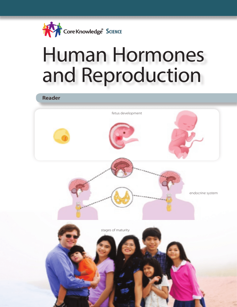 SCIENCE Human Hormones and Reproduction Reader fetus development endocrine system stages of maturity THIS BOOK IS THE PROPERTY OF: STATE Book No. PROVINCE Enter information in spaces to the left as instructed. COUNTY PARISH SCHOOL DISTRICT OTHER CONDITION ISSUED TO Year Used ISSUED RETURNED PUPILS to whom this textbook is issued must not write on any page or mark any part of it in any way, consumable textbooks excepted. 1. Teachers should see that the pupil’s name is clearly written in ink in the spaces above in every book issued. 2. The following terms should be used in recording the condition of the book: New; Good; Fair; Poor; Bad. Human Hormones and Reproduction Reader Creative Commons Licensing This work is licensed under a Creative Commons Attribution-NonCommercial-ShareAlike 4.0 International License. You are free: to Share—to copy, distribute, and transmit the work to Remix—to adapt the work Under the following conditions: Attribution—You must attribute the work in the following manner: This work is based on an original work of the Core Knowledge® Foundation (www.coreknowledge.org) made available through licensing under a Creative Commons Attribution-NonCommercial-ShareAlike 4.0 International License. This does not in any way imply that the Core Knowledge Foundation endorses this work. Noncommercial—You may not use this work for commercial purposes. Share Alike—If you alter, transform, or build upon this work, you may distribute the resulting work only under the same or similar license to this one. With the understanding that: For any reuse or distribution, you must make clear to others the license terms of this work. The best way to do this is with a link to this web page: https://creativecommons.org/licenses/by-nc-sa/4.0/ All Rights Reserved. Core Knowledge®, Core Knowledge Curriculum Series™, Core Knowledge Science™, and CKSci™ are trademarks of the Core Knowledge Foundation. Trademarks and trade names are shown in this book strictly for illustrative and educational purposes and are the property of their respective owners. References herein should not be regarded as affecting the validity of said trademarks and trade names. ISBN: 978-1-68380-673-8 Copyright © 2021 Core Knowledge Foundation www.coreknowledge.org Human Hormones and Reproduction Table of Contents Chapter 1 Growth and Change . . . . . . . . . . . . . . . . . . . . . . . . . . . . . 1 Chapter 2 Glands and Hormones . . . . . . . . . . . . . . . . . . . . . . . . . . 3 Chapter 3 The Hypothalamus, Pituitary, and Adrenal Glands . . . . . . . . . . . . . . . . . . . . . . . . . . . . . 9 Chapter 4 The Thyroid and the Pancreas . . . . . . . . . . . . . . . . 15 Chapter 5 Human Adolescence . . . . . . . . . . . . . . . . . . . . . . . . . . . 21 Chapter 6 The Reproductive System . . . . . . . . . . . . . . . . . . . . . 27 Chapter 7 Sexual Reproduction . . . . . . . . . . . . . . . . . . . . . . . . . . 35 Glossary . . . . . . . . . . . . . . . . . . . . . . . . . . . . . . . . . . . . . . . . . . . . . . . . . . . . . 43 Growth and Change Chapter 1 Everyone starts out as a baby. A baby’s bones and muscles grow. Babies start out crawling but after a while they can stand up and walk. Soon after that, the child can run and move in all sorts of directions. As Big Question How do humans change as they mature? the years go by, growth continues until the body is mature. Humans go through a predictable sequence of development from infancy, through childhood and adolescence, and into adulthood. As the human body matures, it develops different functions related to the different stages of life. The body has structures called glands that produce substances that control the processes of bodily change. Vocabulary growth, n. the life process of becoming bigger and stronger mature, adj. fully developed (v. to develop and become full-grown) gland, n. a body organ that makes substances used by the body 1 Glands produce chemical substances called hormones. Hormones signal tissues and organs in the body to perform functions or to change. The effects of hormones can vary. Hormones can trigger sudden change in the body or sustained gradual change. For example, one hormone can suddenly make a heart beat faster when a person is surprised. Other hormones very gradually make a person grow and mature. 2 Vocabulary hormone, n. a substance made in the body that produces effects in other cells or tissues in the body Glands and Hormones Chapter 2 To function well and stay alive, the human body tries to maintain a condition called homeostasis. Think of homeostasis as internal balance. The body has many Big Question What is the endocrine system? systems, all performing complicated functions at the same time. The body has a system that maintains balance by Vocabulary subjecting all of its processes to the chemical homeostasis, n. the balanced functional state of the body’s systems to maintain life commands by hormones. Hormones, the structures that make them, and the pathways they travel make up the endocrine system. The human body functions best when its systems are stable—all parts are getting enough of what they need but not too much. When a function becomes unstable, endocrine system, n. the glands and body structures that create and control the metabolic activity of a body the body responds and starts a change process. For example, when a person needs energy from food, a part of the endocrine system releases a hormone. This hormone travels to the brain and signals “I am hungry.” Once the person has had enough to eat, another hormone is released that tells the body “I am full.” 3 The Endocrine System Words to Know The endocrine system produces hormones. It also controls when the hormones are released into the bloodstream. Some of the body processes that hormones control include the following: digestion Processes are ongoing biological activities carried out for particular purposes. Control and regulation refer to de